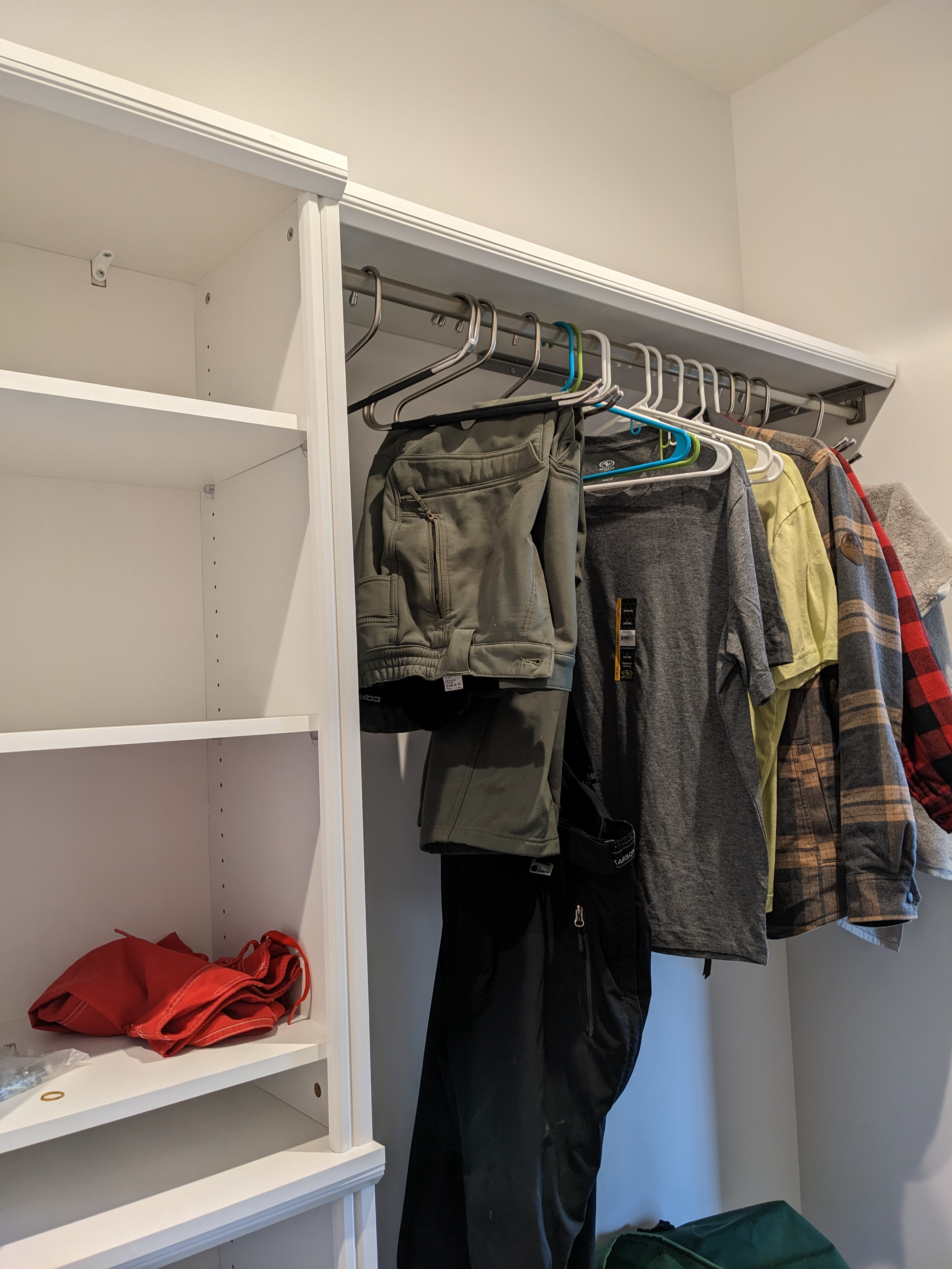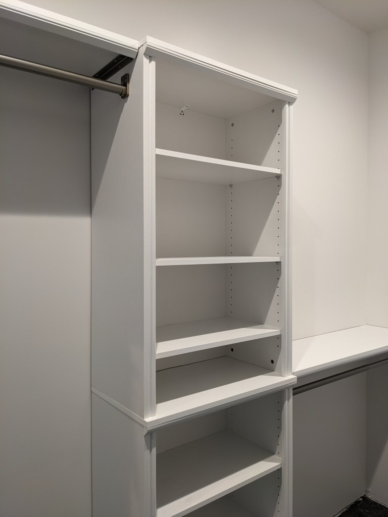 Next, we added hanging rods and wall shelves. These were pretty simple to install once we figured out where we wanted them. (They also came with fancy trim pieces!)