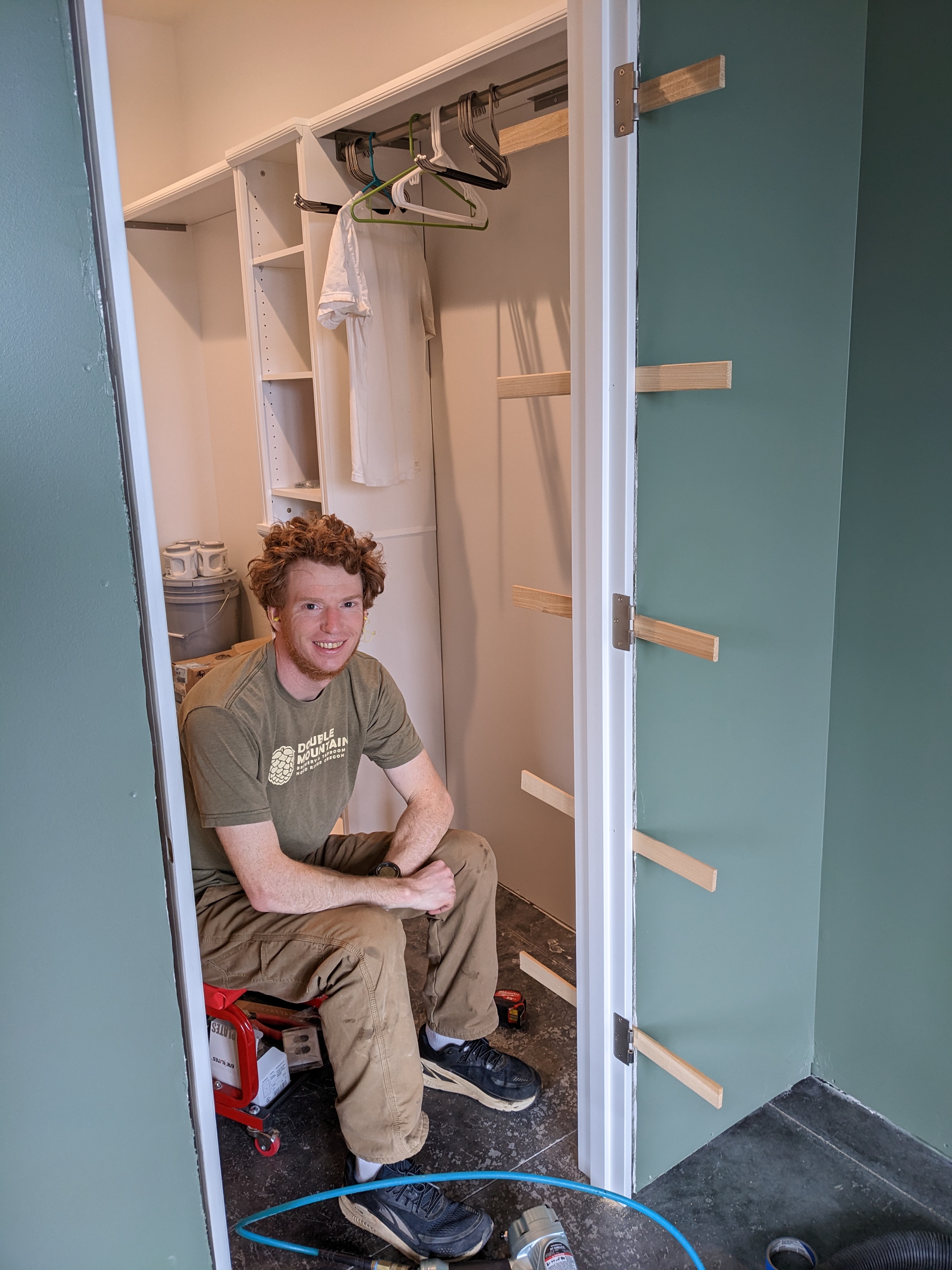 We weren’t ready to come out of the closet just yet. Since all the tools were out, Sam installed the fan coil. As warned by Terry, our thermal guy, the bracket assembly and entire fan coil itself had to be completely disassembled in order to install it. There were no instructions for this, so I turned away while Sam dismembered our brand new cooling unit. It went well, of course. The unit is in the ceiling now and we didn’t find any leftover parts lying around. We hope to have it running by the time things heat up in the bedroom. There is no hurry at this rate, as winter is still hanging on.