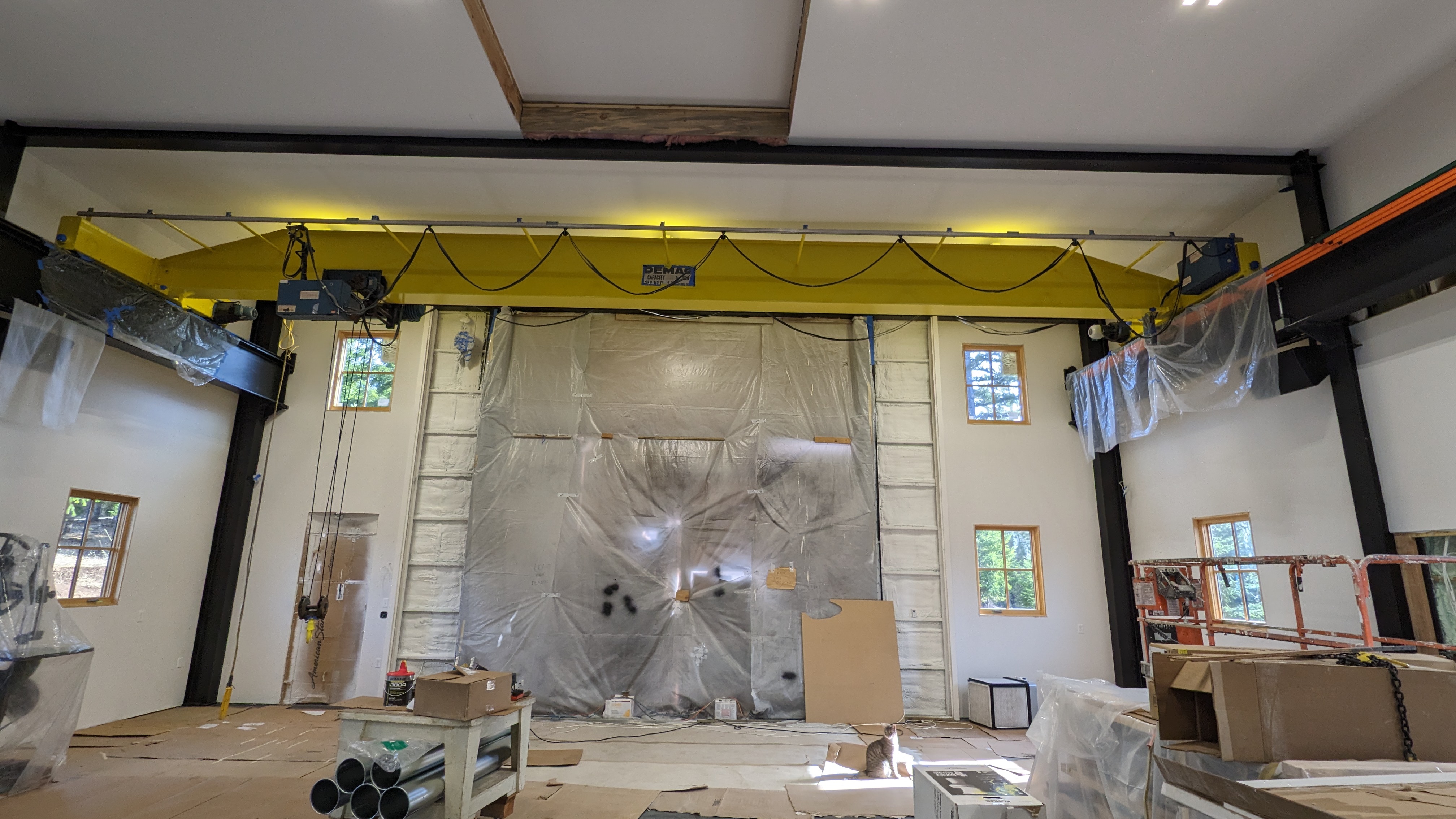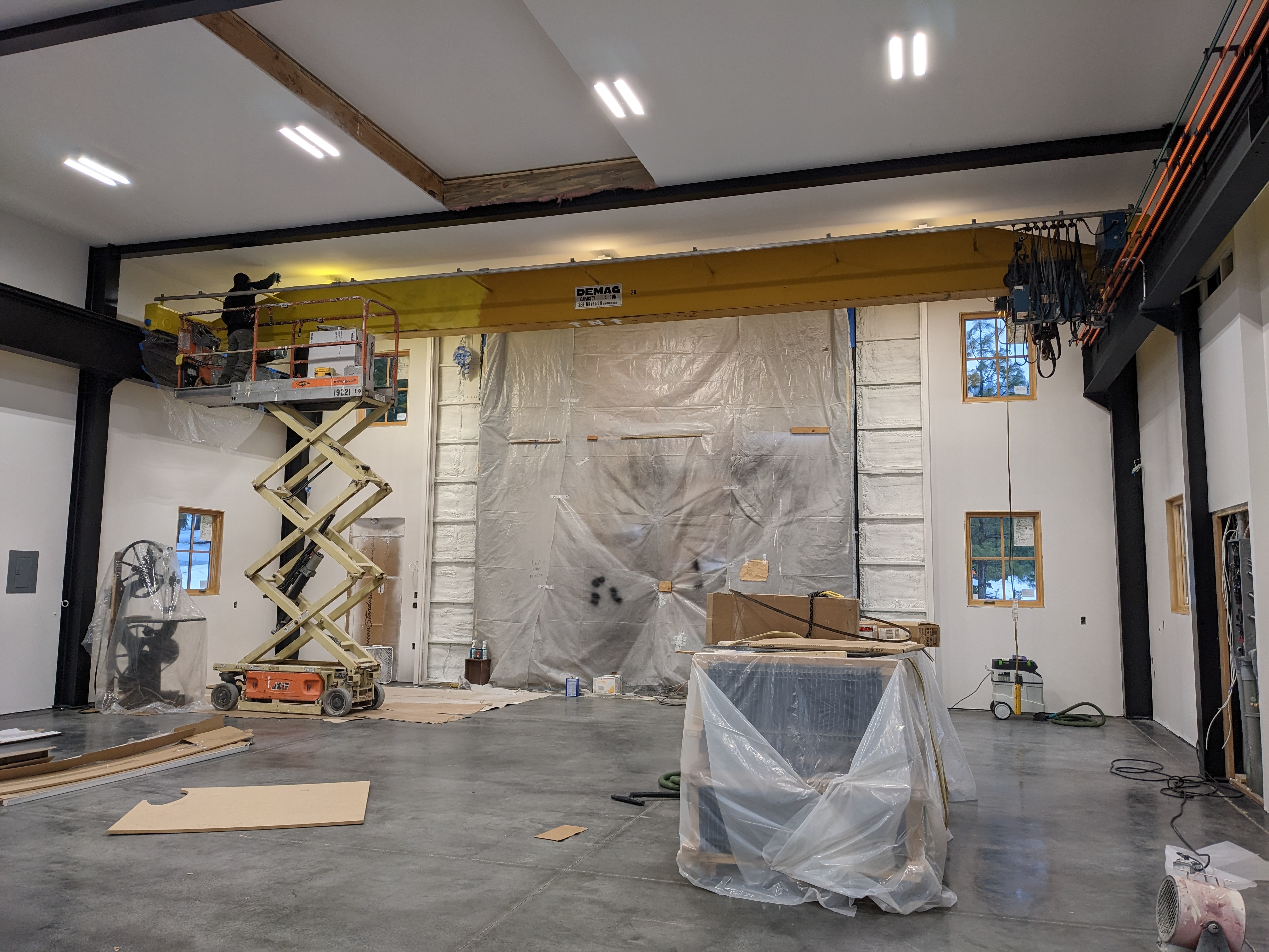 Next, we spruced up the crane. Carlos spent a week sanding and cleaning up the rust spots. Then the three of us went up in the scissor lift and had a painting party. They only make one shade of pre-mixed yellow paint for steel, so that’s what we used. Safety yellow! It brings a bright, modern look to the old mustard crane.