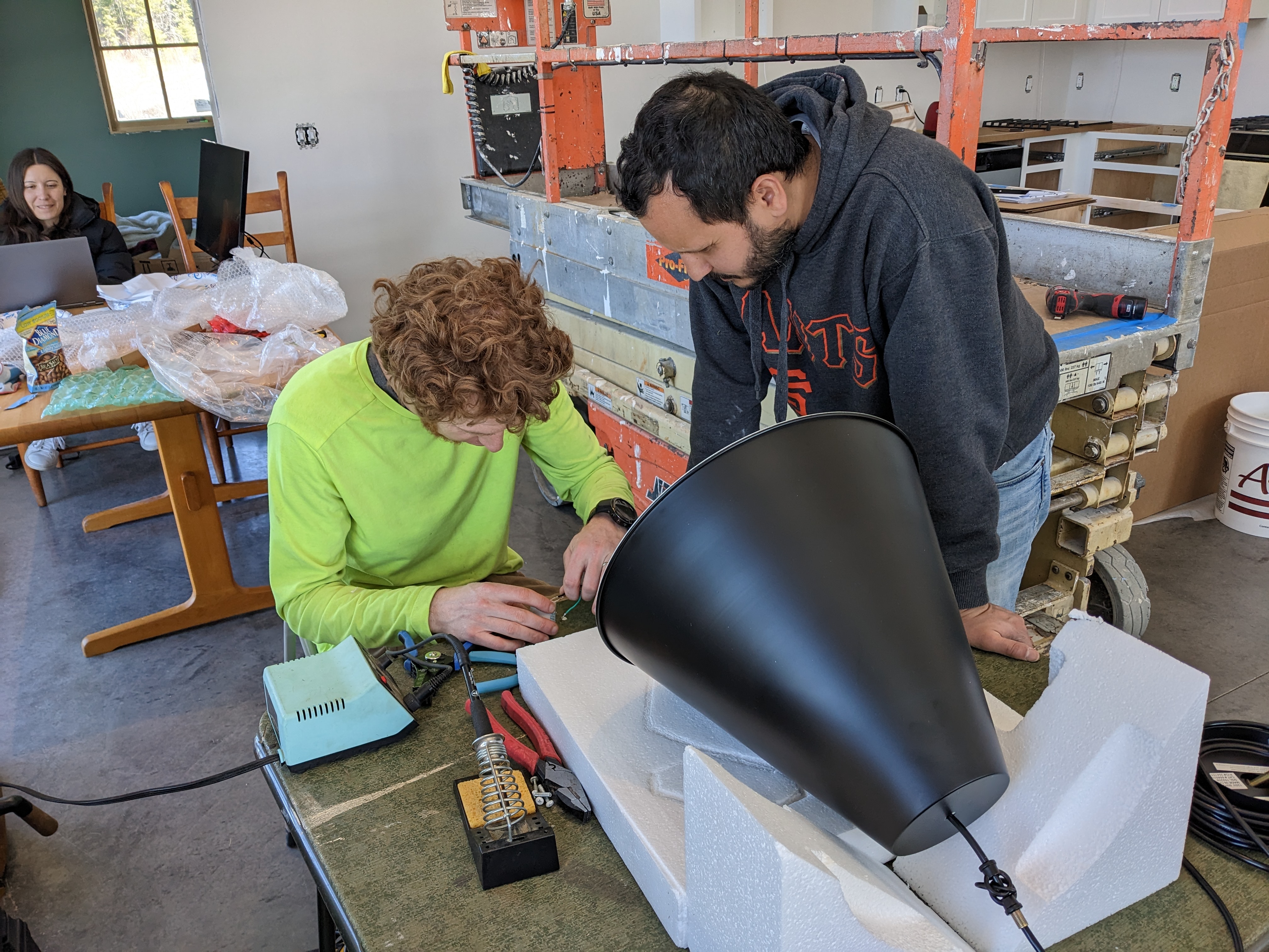 I wanted to use threaded rods to conceal the wire (even though it was nice wire), but of course the lights only came with three feet of rod. Sam ordered an assortment of rods, and we ended up using three different brands of varying quality. Once we assembled the 10 foot pole, we carefully stood it up, although pole vaulting over the scissor lift was tempting. Malee helped me picked the perfect height to set the lamps, and Sam and Mikko affixed them to the boxes in the ceiling.