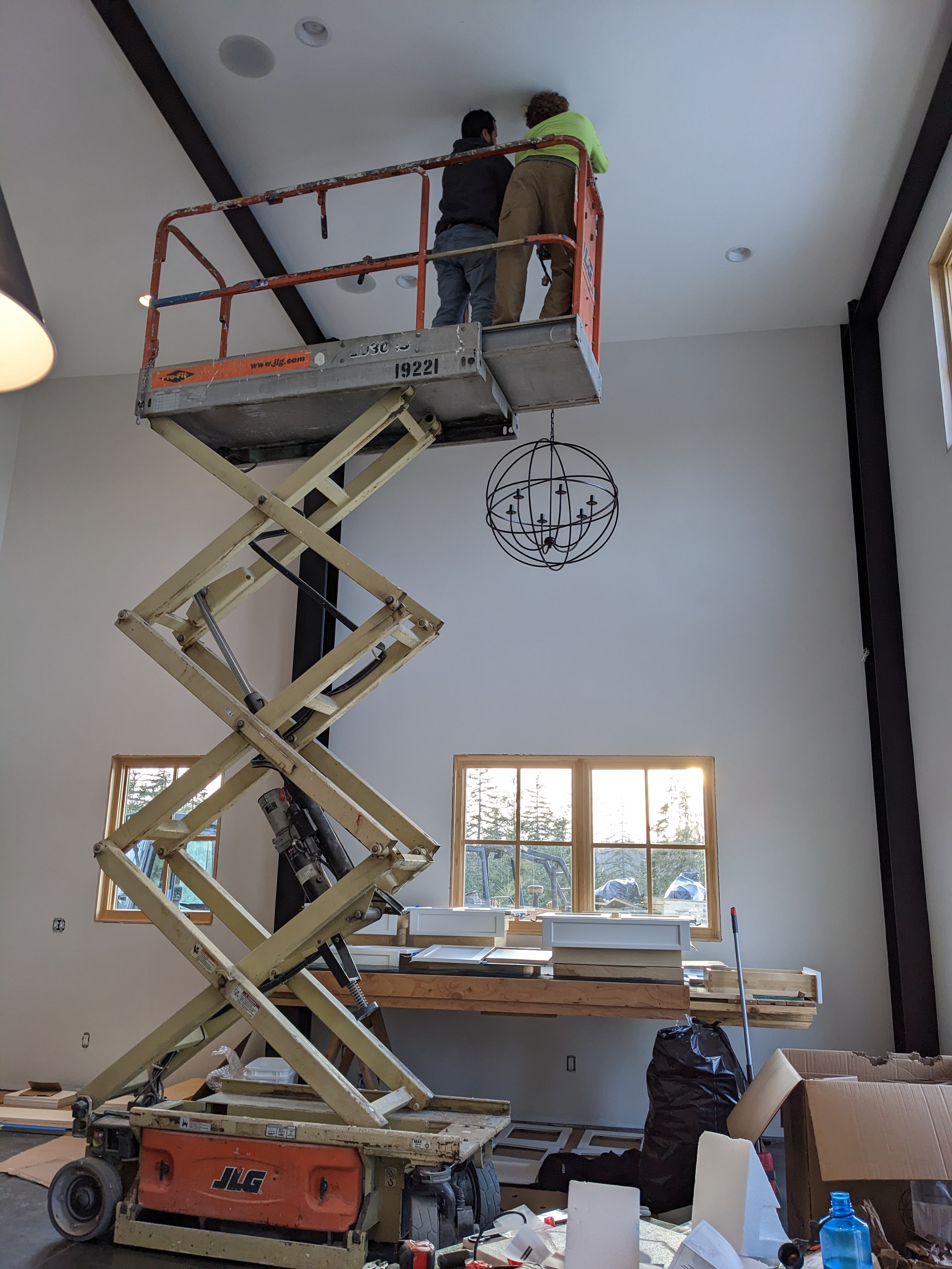 Since the scissor lift was already in the living room, we hung the chandelier too. I almost turned this into a similar project- rewiring and replacing the rods- but my consultants and I agreed that the chain and wire it came with looked great. Phew!