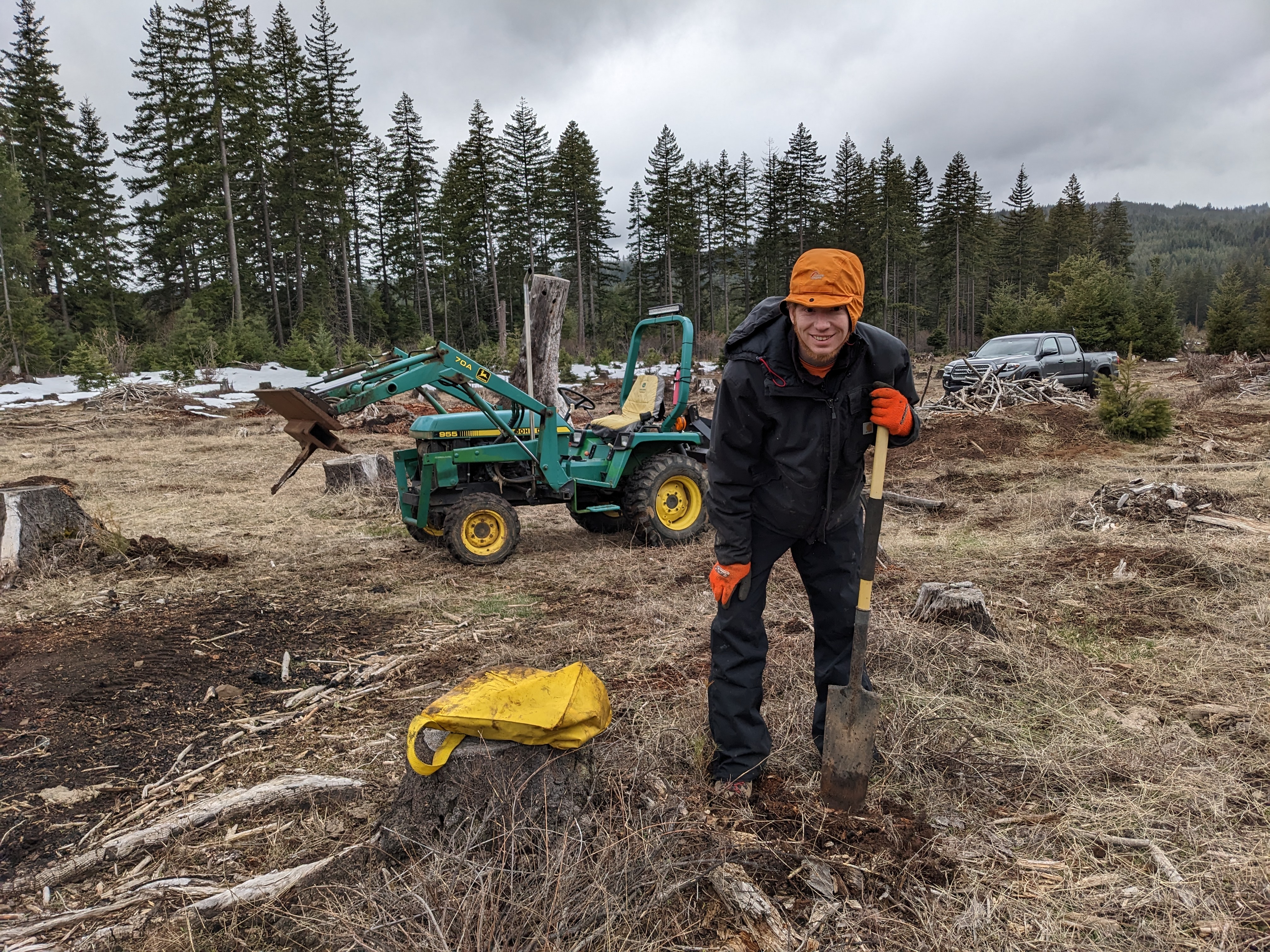 It was nearly noon after that debacle, and we hadn’t even started planting. Sam used the tractor to dig holes in our very hard and rocky soil, and I followed behind planting the trees. We planted them all in the clear-cut area we’ve been cleaning up over the last few years. (It was cold and drizzling, hence my ridiculous outfit.)