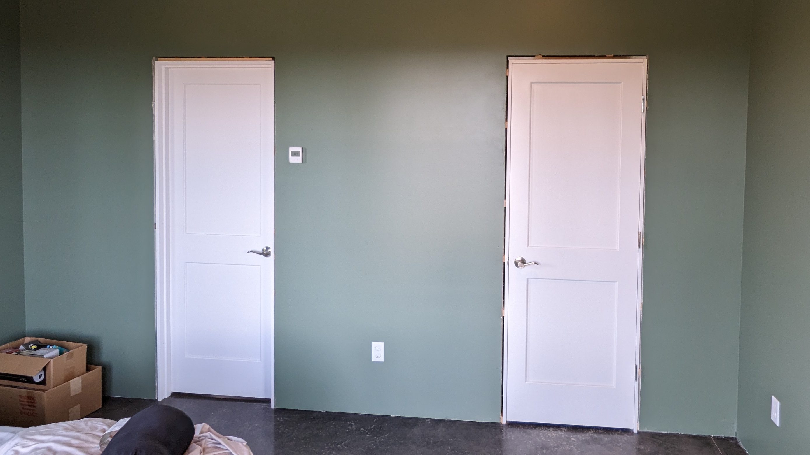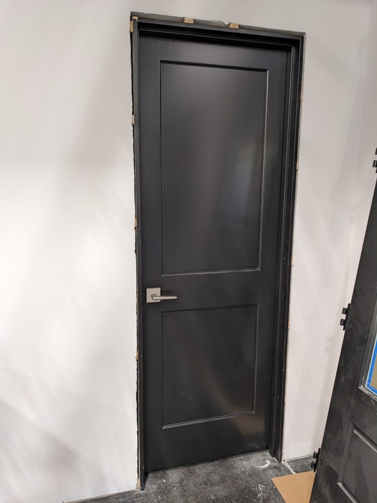 After a year of door drama (I’ll spare the details), I gave up. I shut down my computer, and I got myself a beer. Eventually we found fiberglass doors with a glass panel pattern that matches our window proportions. Yes! And after another few months of waiting, they arrived. Unpainted, of course. We masked and primed the doors and frames. Then we had the drywall painters spray them black.