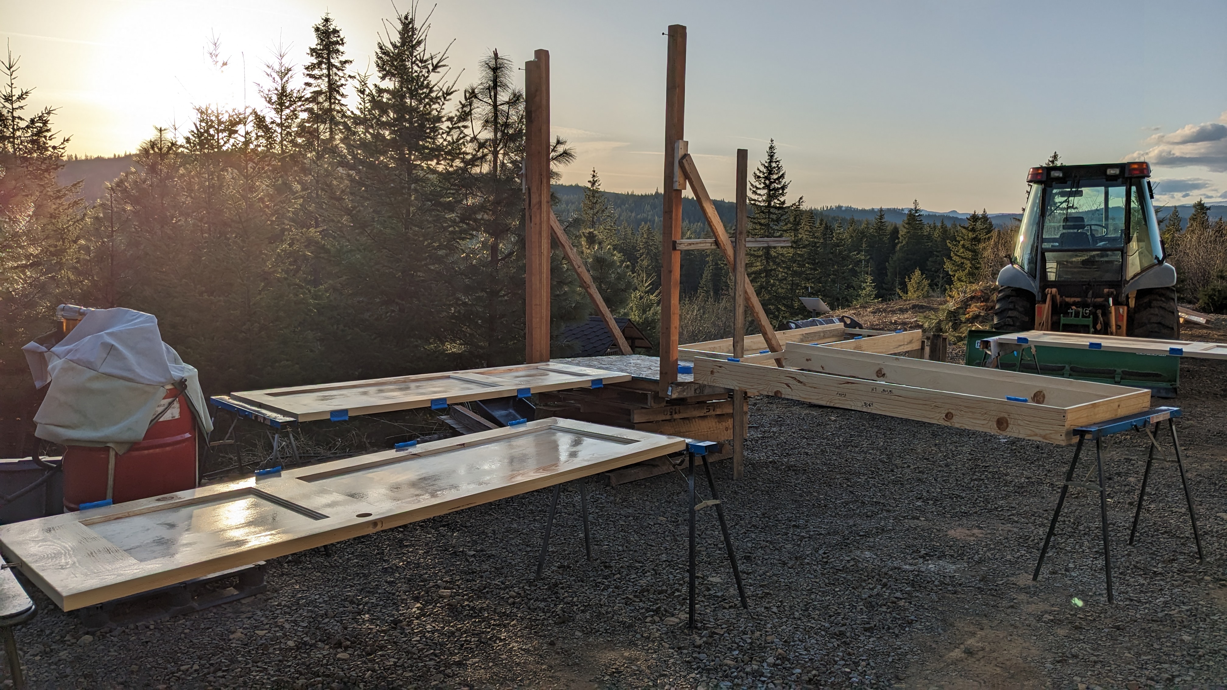 The sun stayed out for a few days, providing good conditions for painting the doors. We gave them a light sanding and two clear coats. Sam and I got really good at flipping wet doors over and carrying them in an out of the shop.