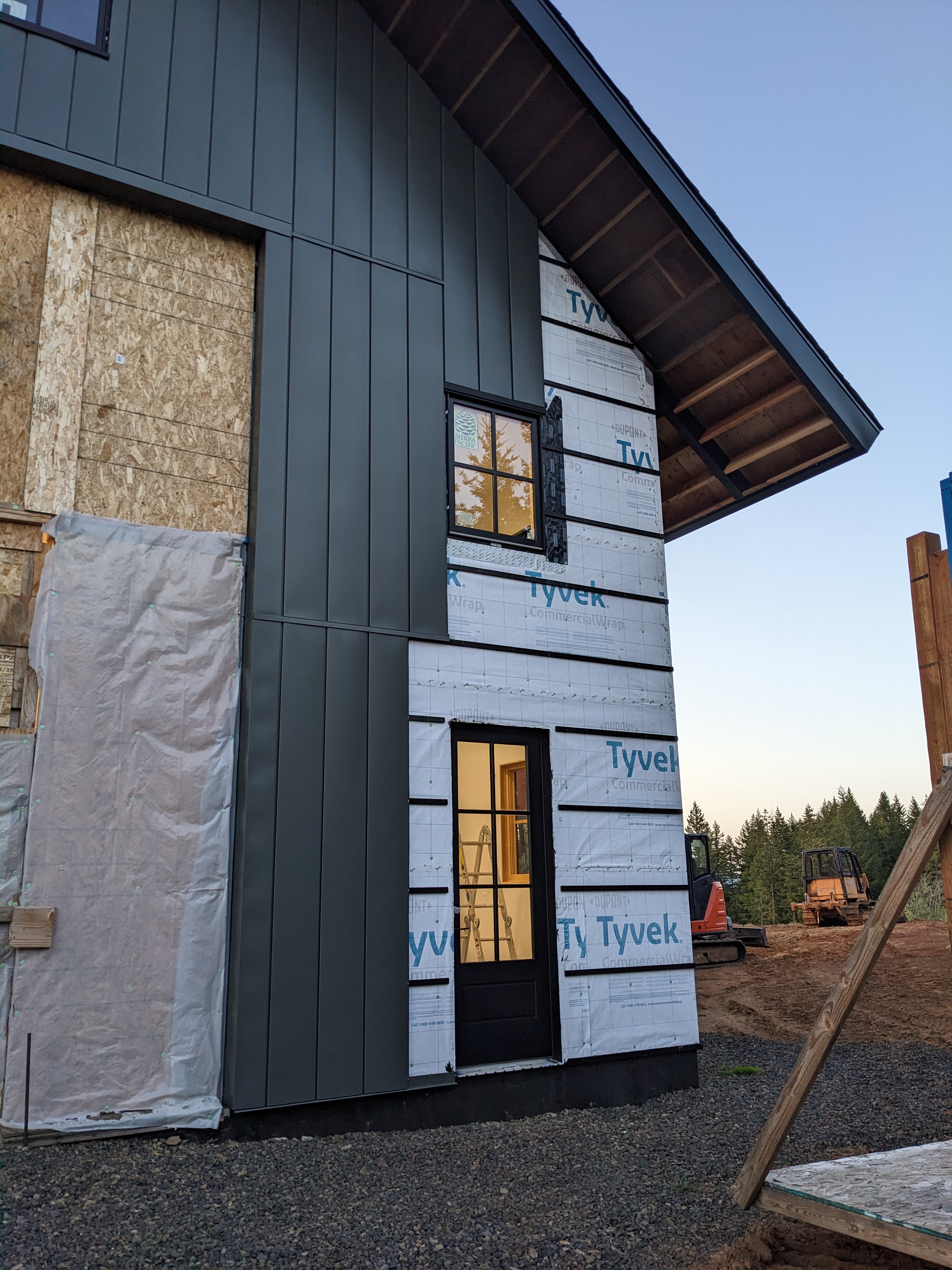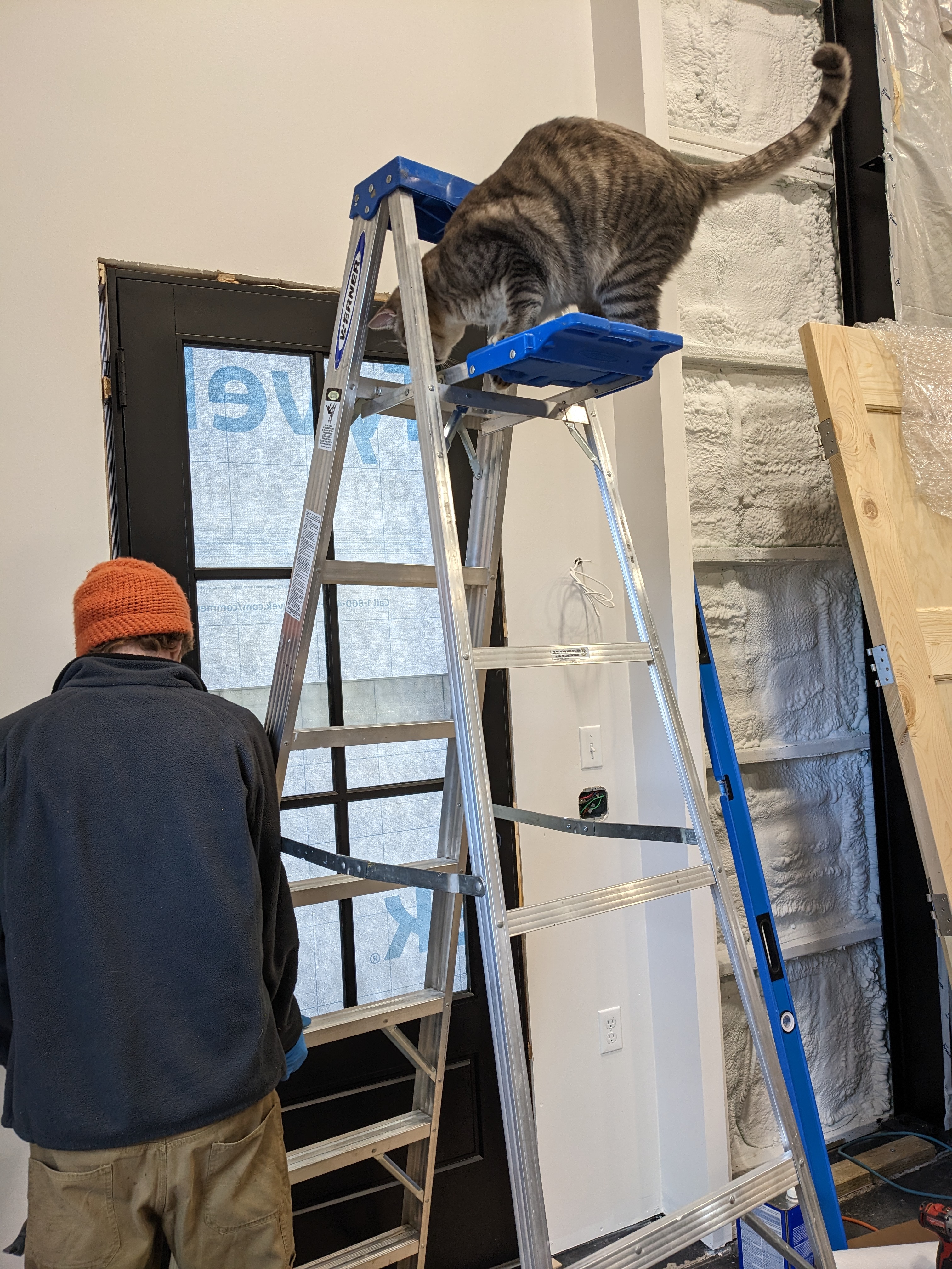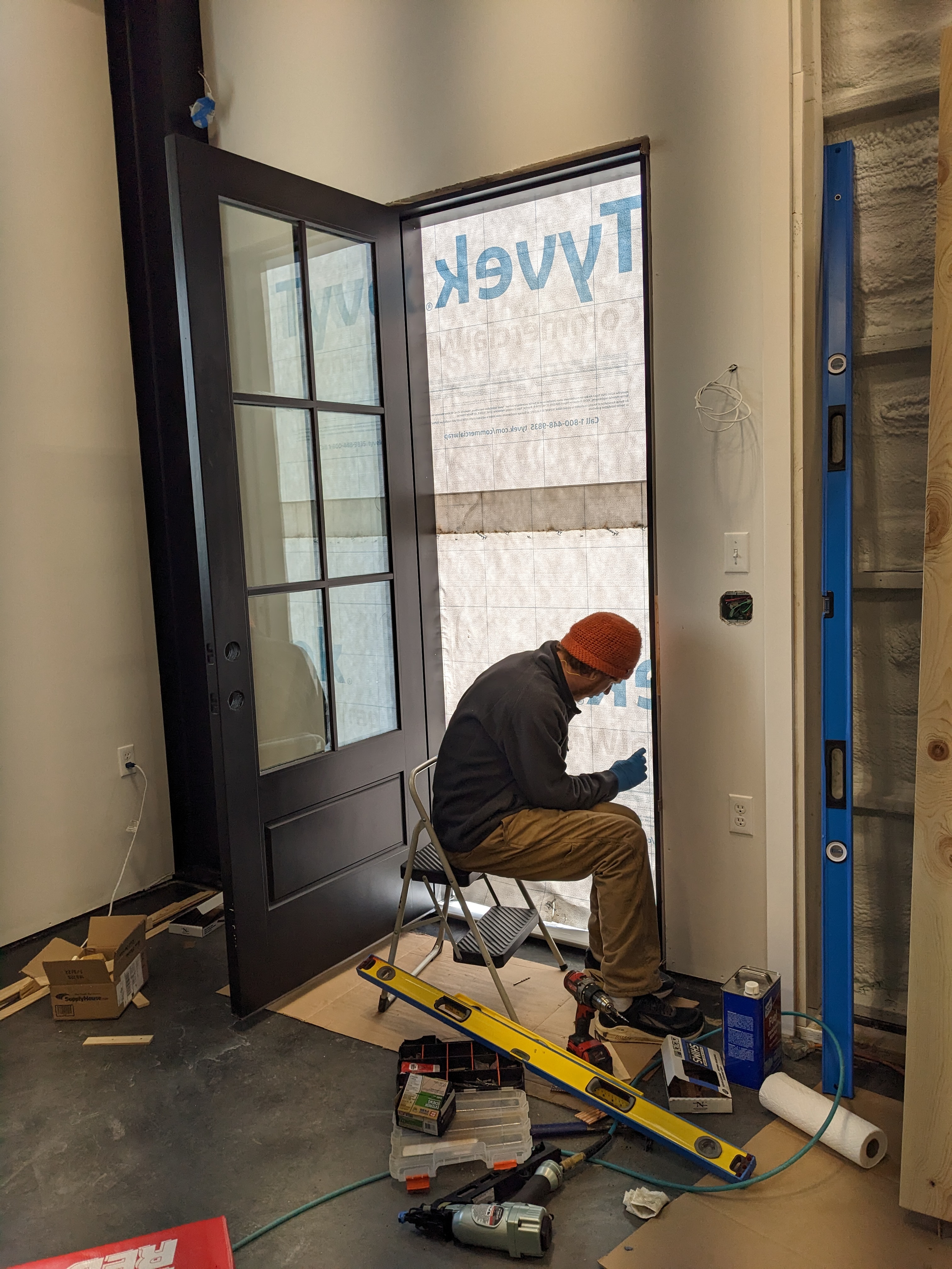 Sam and I finally installed the first of the three exterior doors. It went well with the exception of the cats constantly getting in the way and trying to rip the Tyvek.