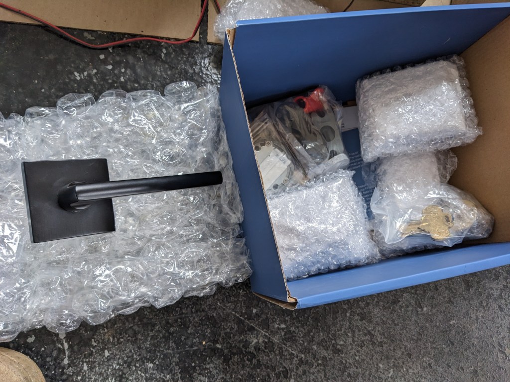 We didn’t have hardware when we installed the door, so a bubble wrapped piece of plywood is holding it shut. Sam said, “Casey, Casey, Casey, won’t you get a lock and key.” So I did, but Sam has to re-bore the holes and expand the mortise for the deadbolt to fit. The hardware is still in pieces in the box…