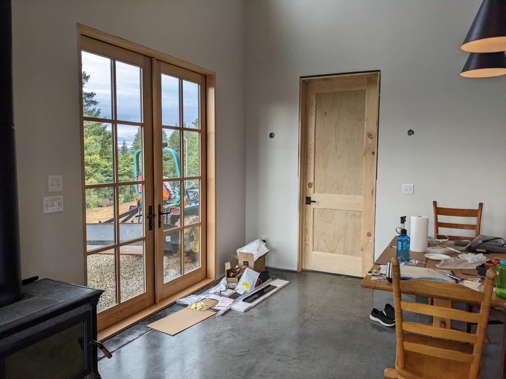 Once the paint dried, we installed the three pine doors. It wasn’t that easy, but they look great! The tall doors inside are very fun!