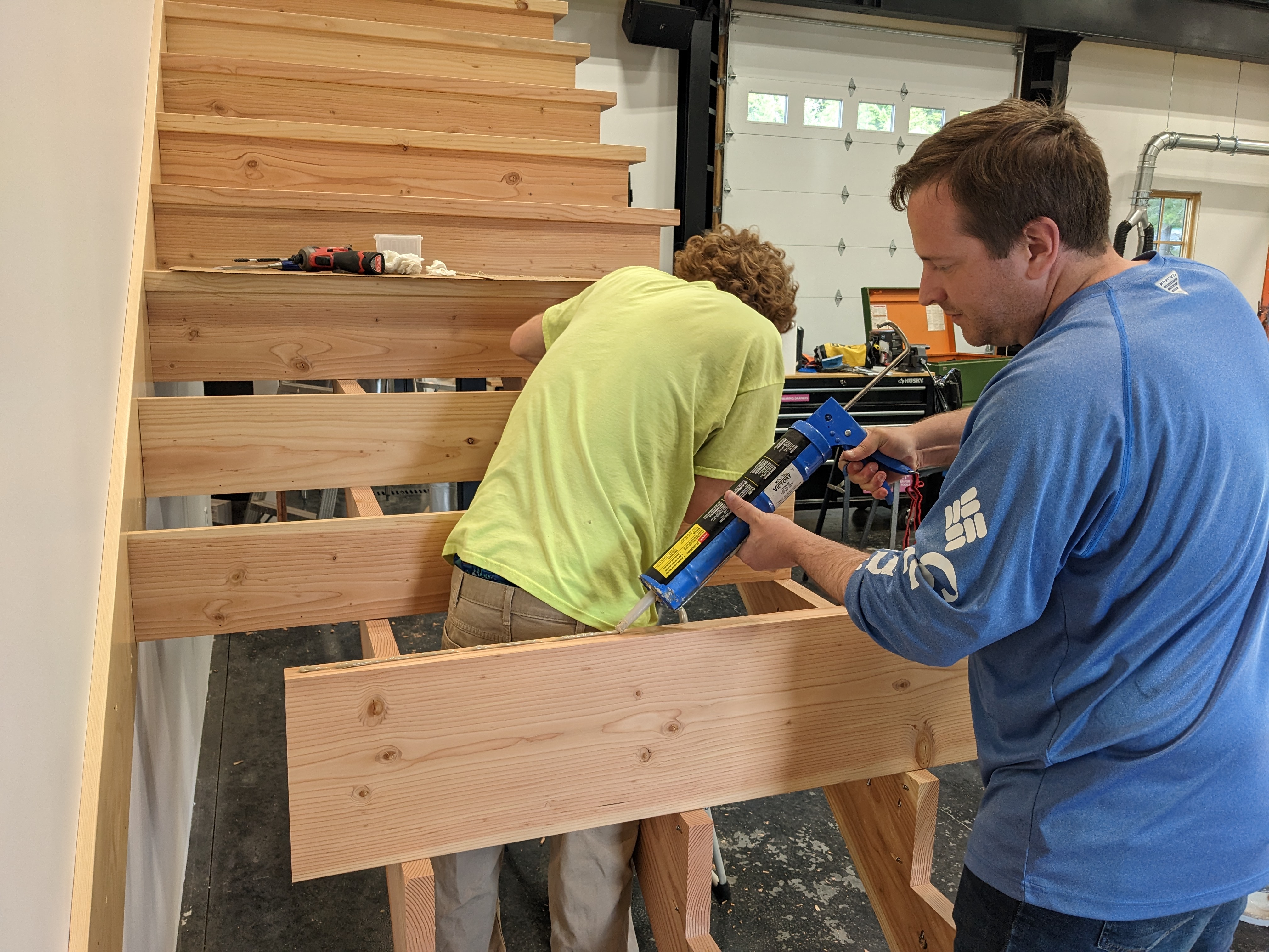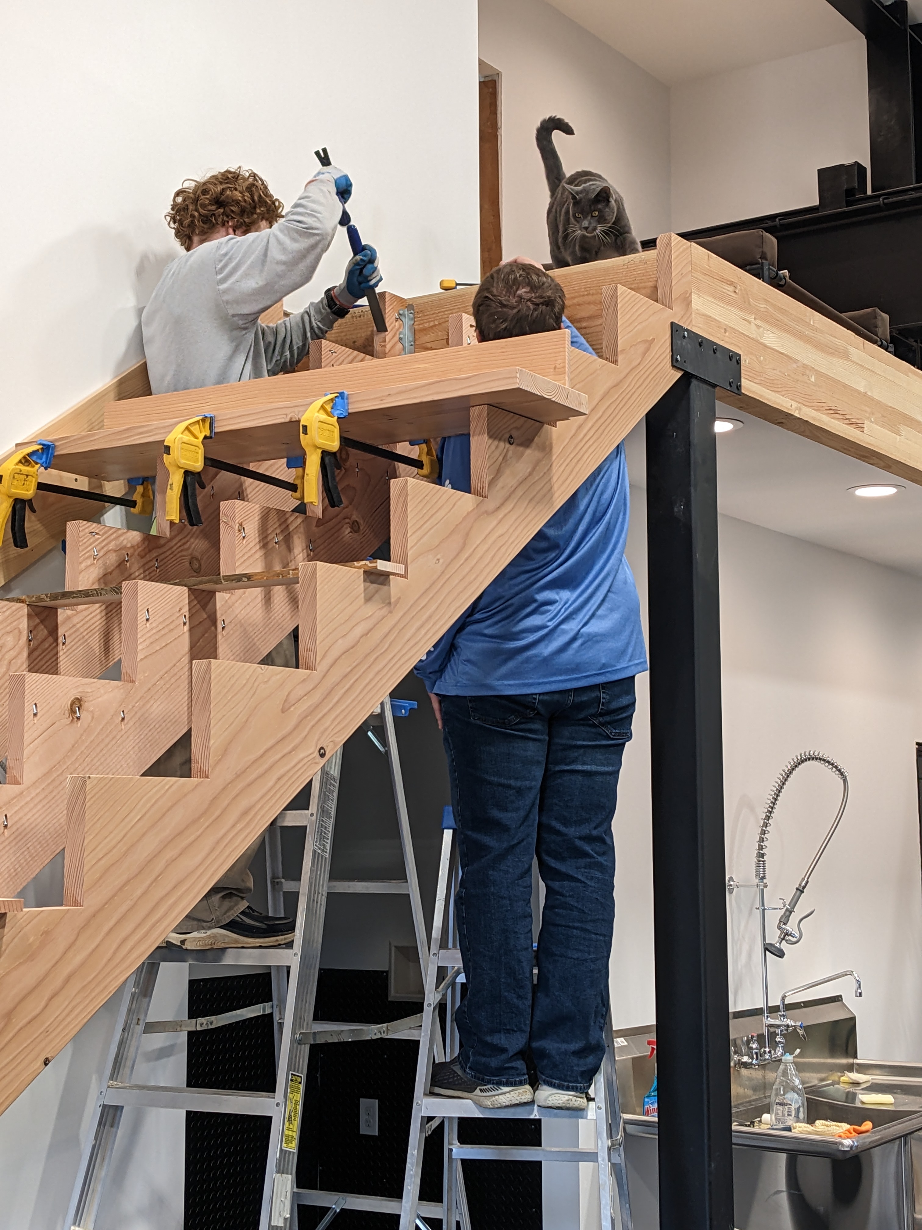 Then, Sam and Steve assembled the stairs from the top down while Smokey supervised.