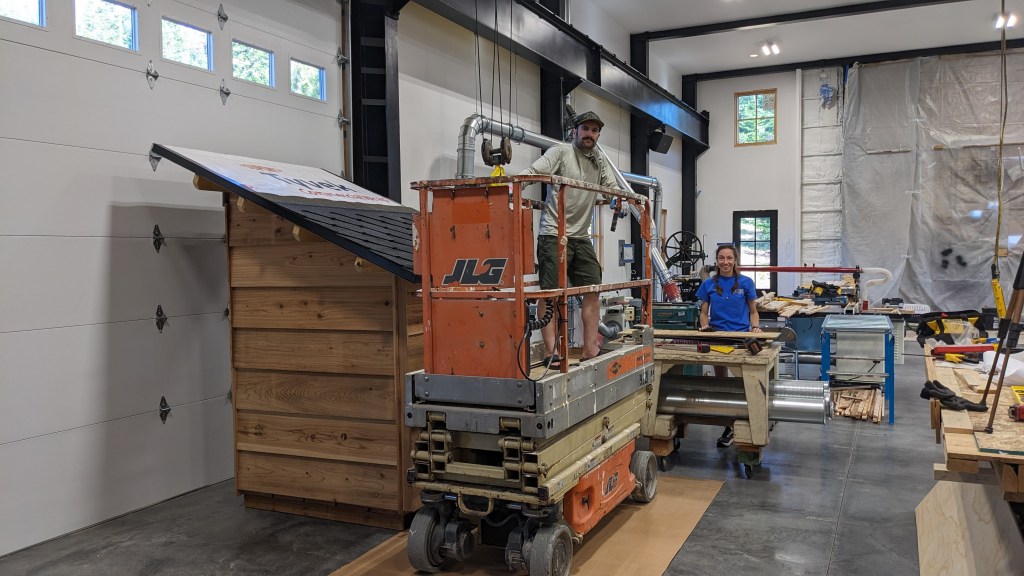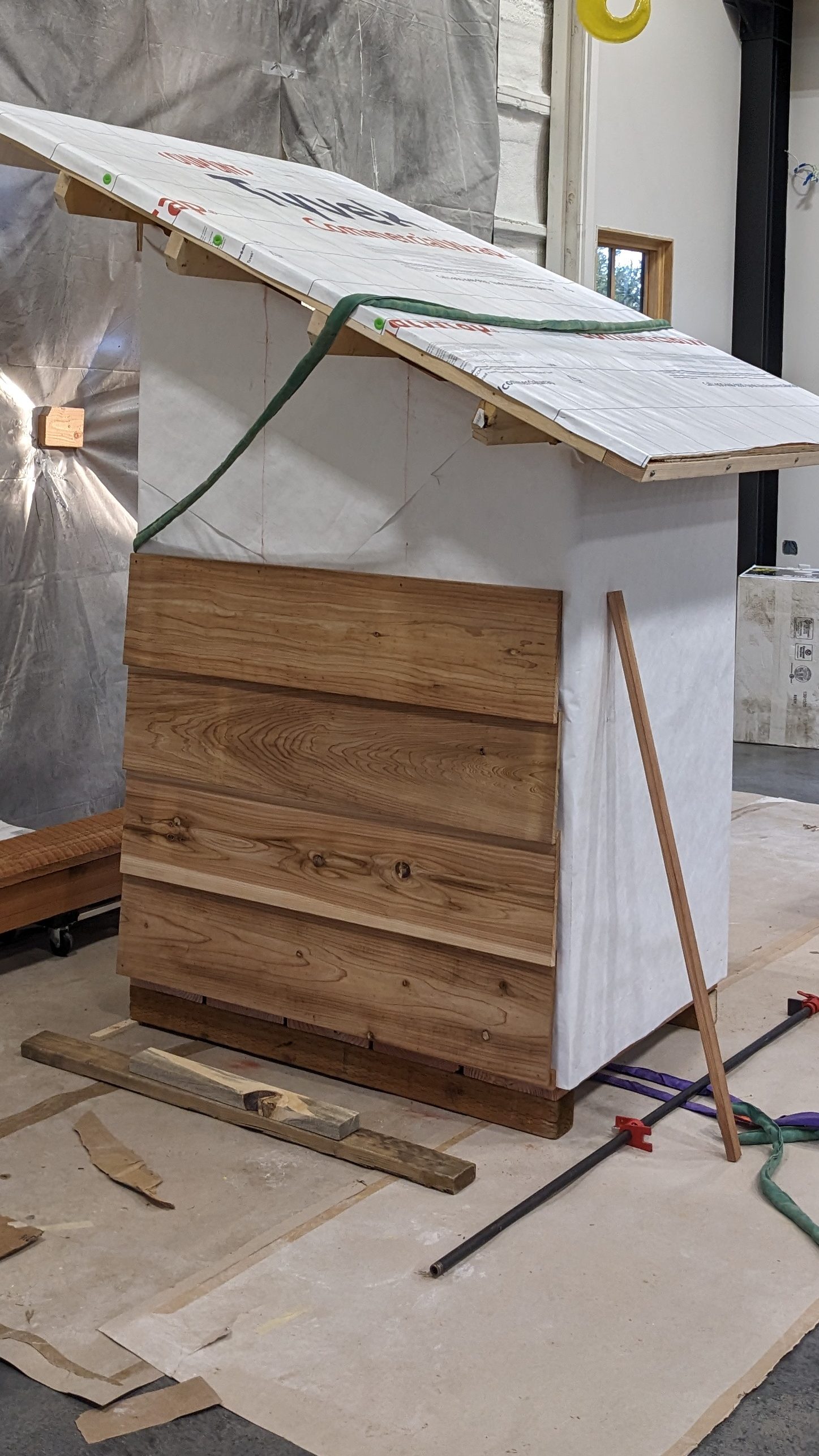 We wanted our shed to last a very long time, so Sam wrapped it in leftover Tyvek he found in the attic. Then, he brought the structure downstairs!