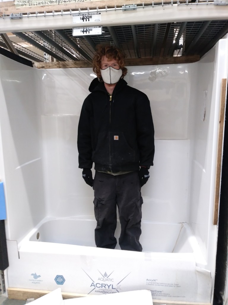 The master bathroom is coming along too. That bathroom design began over two years ago. Since the drain location on every single bathtub is slightly different, we purchased the bathtubs before we poured concrete to ensure the plumbing under the concrete would fit our specific tubs. Sam modeled bathtubs for me at Home Depot until we found one that was appropriately sized for an adult.