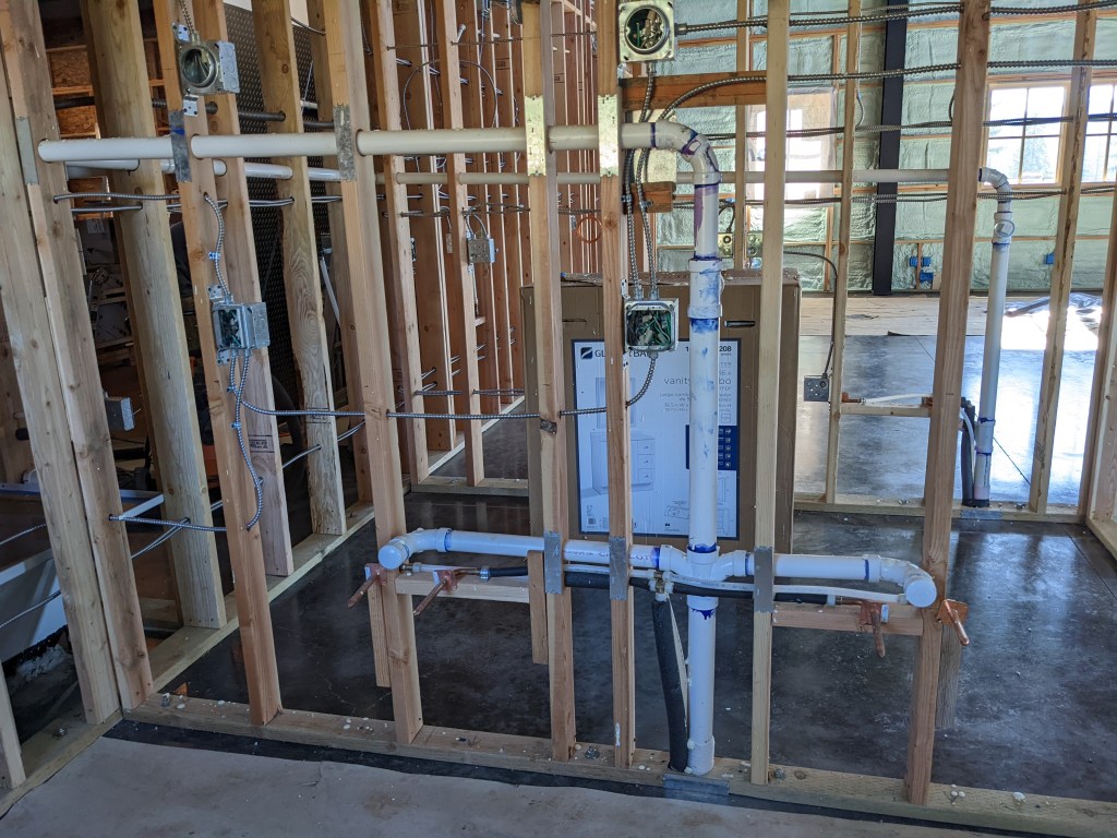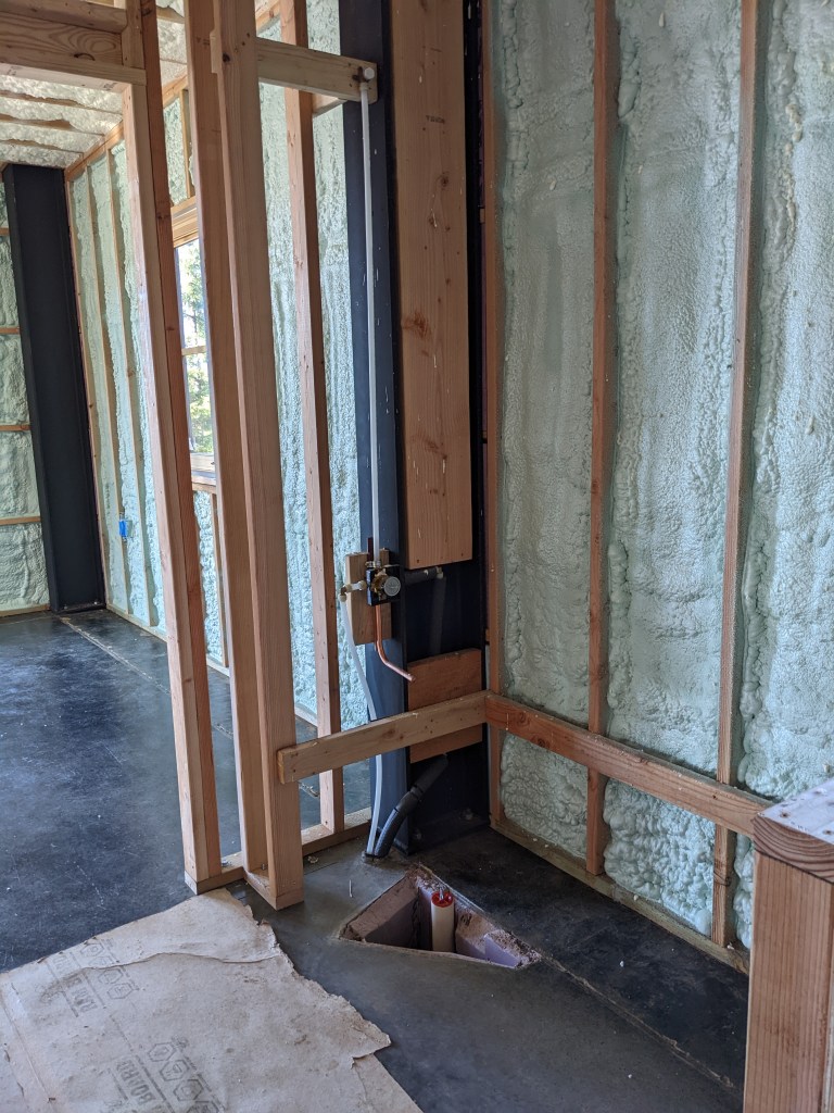 Shortly after we had a foundation, Sam designed the above-ground plumbing and I had to provide the master bathroom layout. The main design constraints were a steel column in the room, a window, and Sam’s request to have minimal plumbing on the exterior wall. These ended up being a lot of requests. I decided the steel column wasn’t adding anything, so we hid it inside a wall and added some wood to support plumbing lines for the shower.