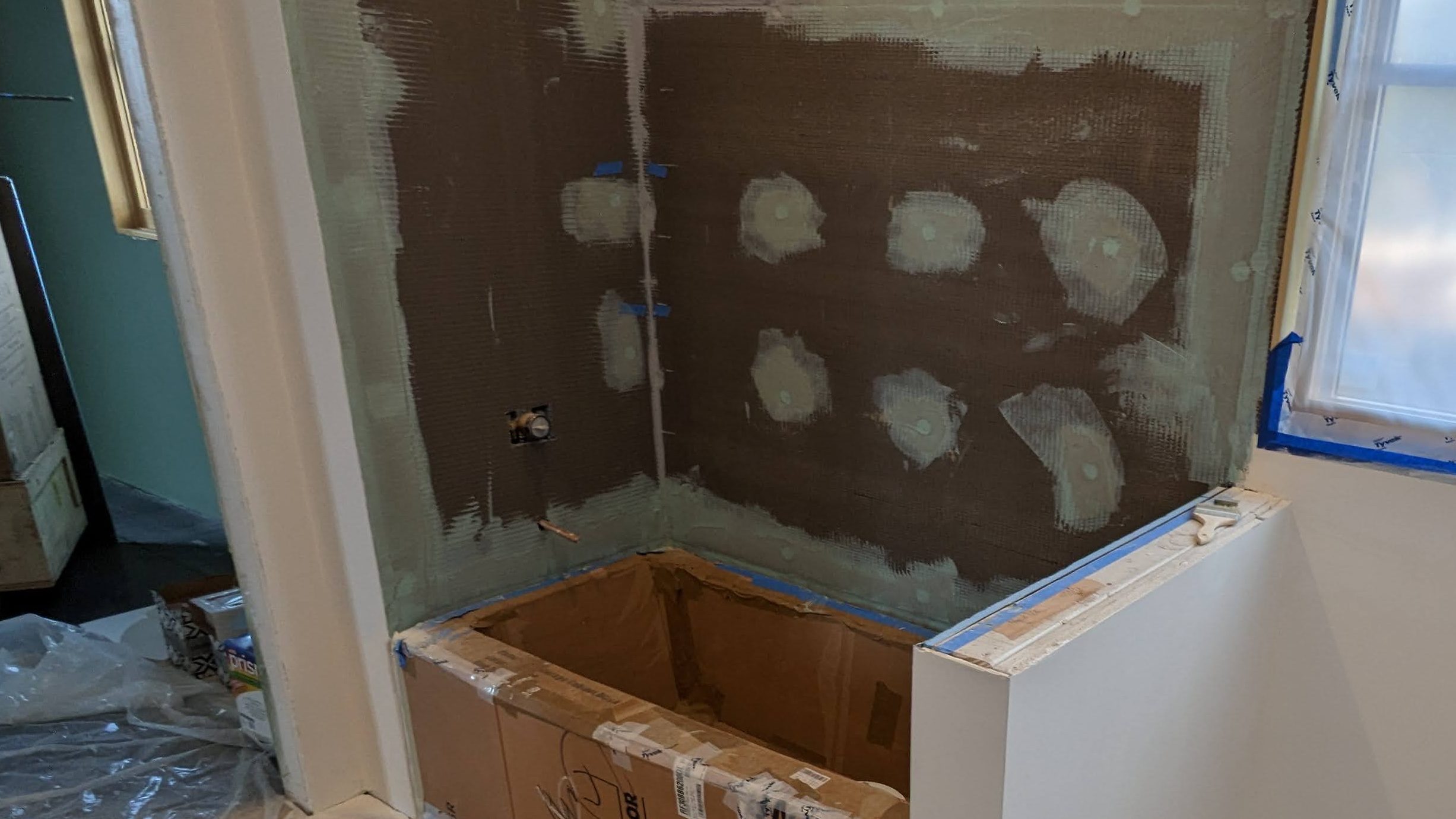Sam set the bathtub with plaster, and we hired someone to tile the wall. I chose a porcelain tile for easy maintance. Carlos, our tile guy, used Wedi backboard which is a little lighter than cement board. It’s some sort of waterproof foam material with a crumbly cement coating, so it still makes a mess when you cut it.