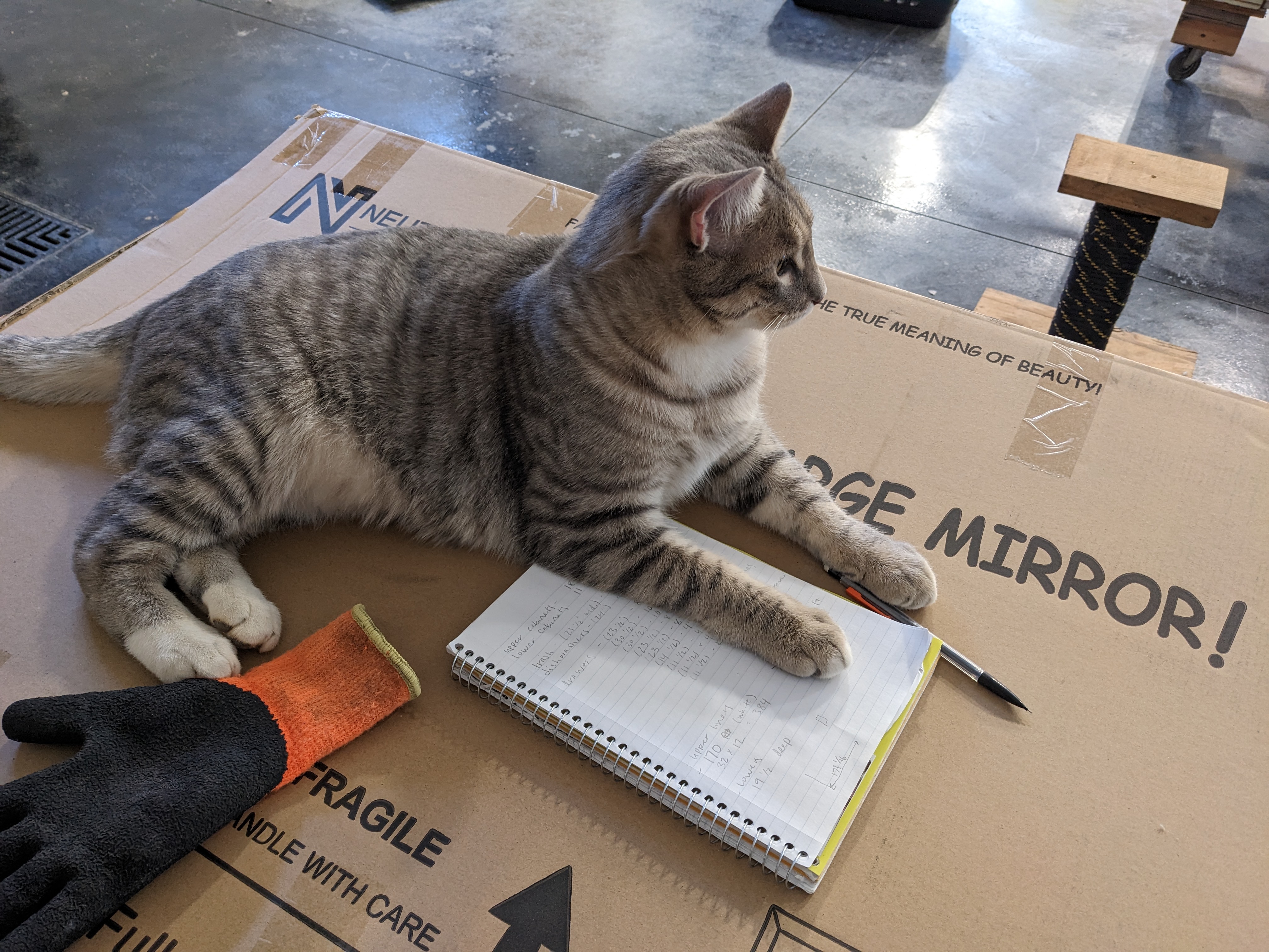 Ordering the glass turned into a big saga due to our incompetent local glass store. They eventually produced a glass panel which was cut a little short on both sides. Steve was in town to help install it. Buster supervised, of course.