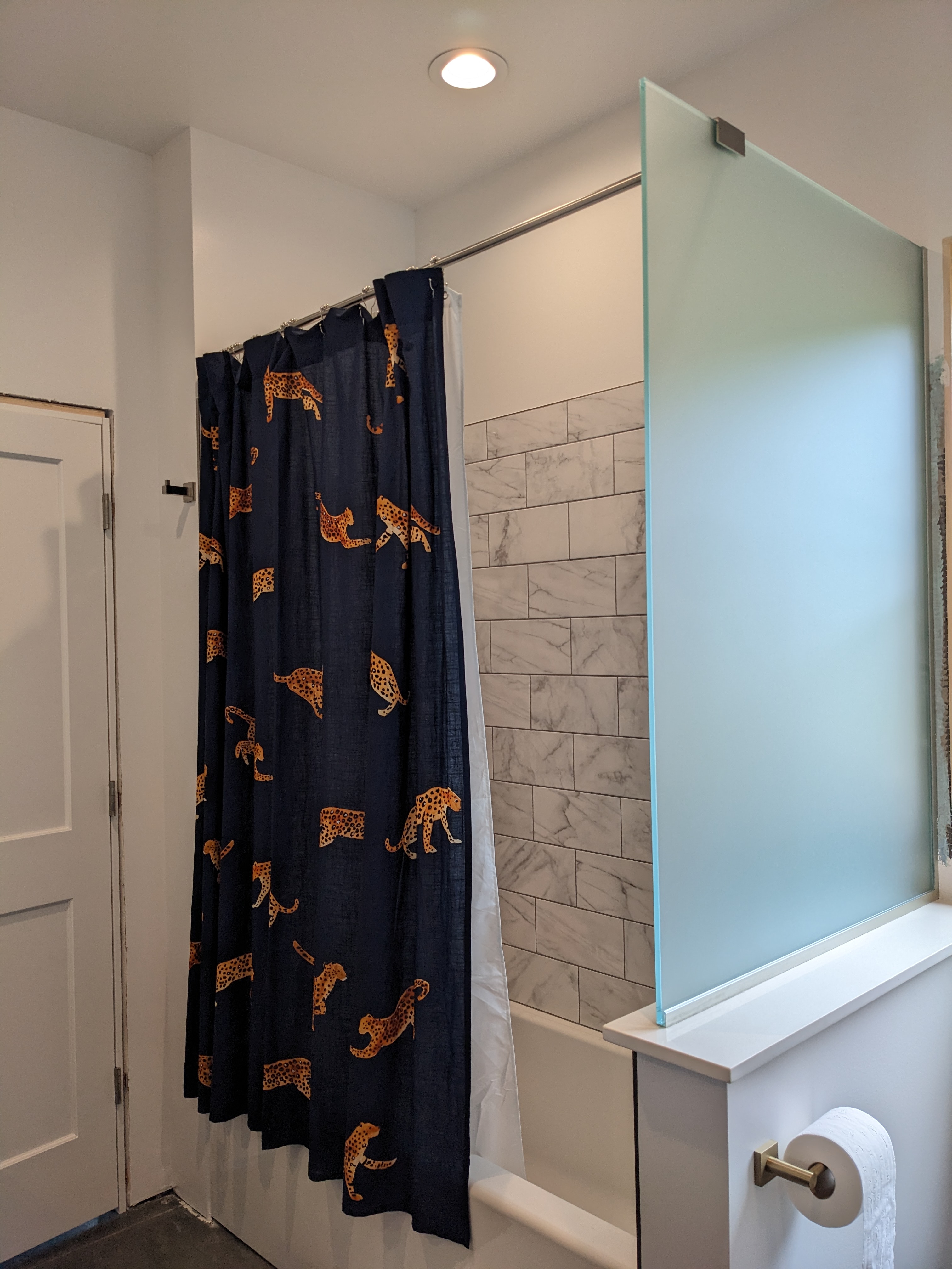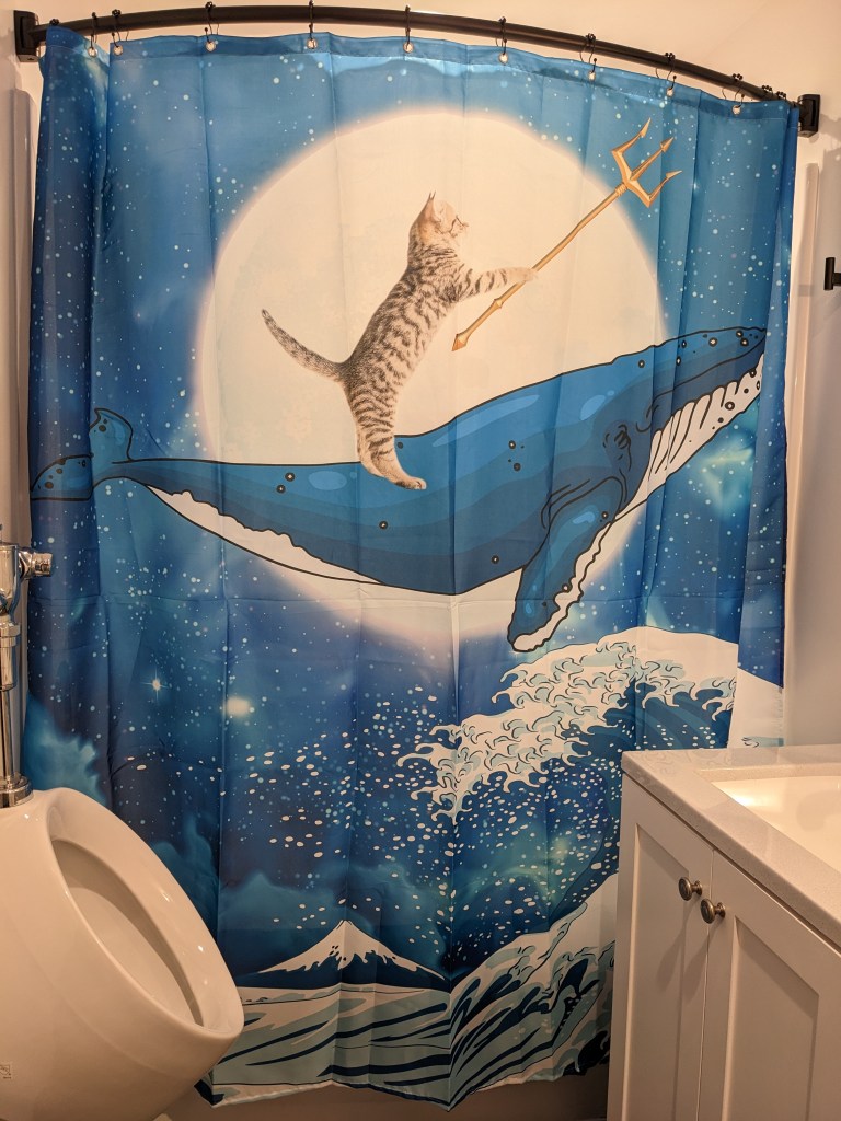 I couldn’t help myself and ordered another cat-themed shower curtain, only this one is a more sophisticated jaguar pattern. I need to add some jungle plants and colorful artwork to the room.