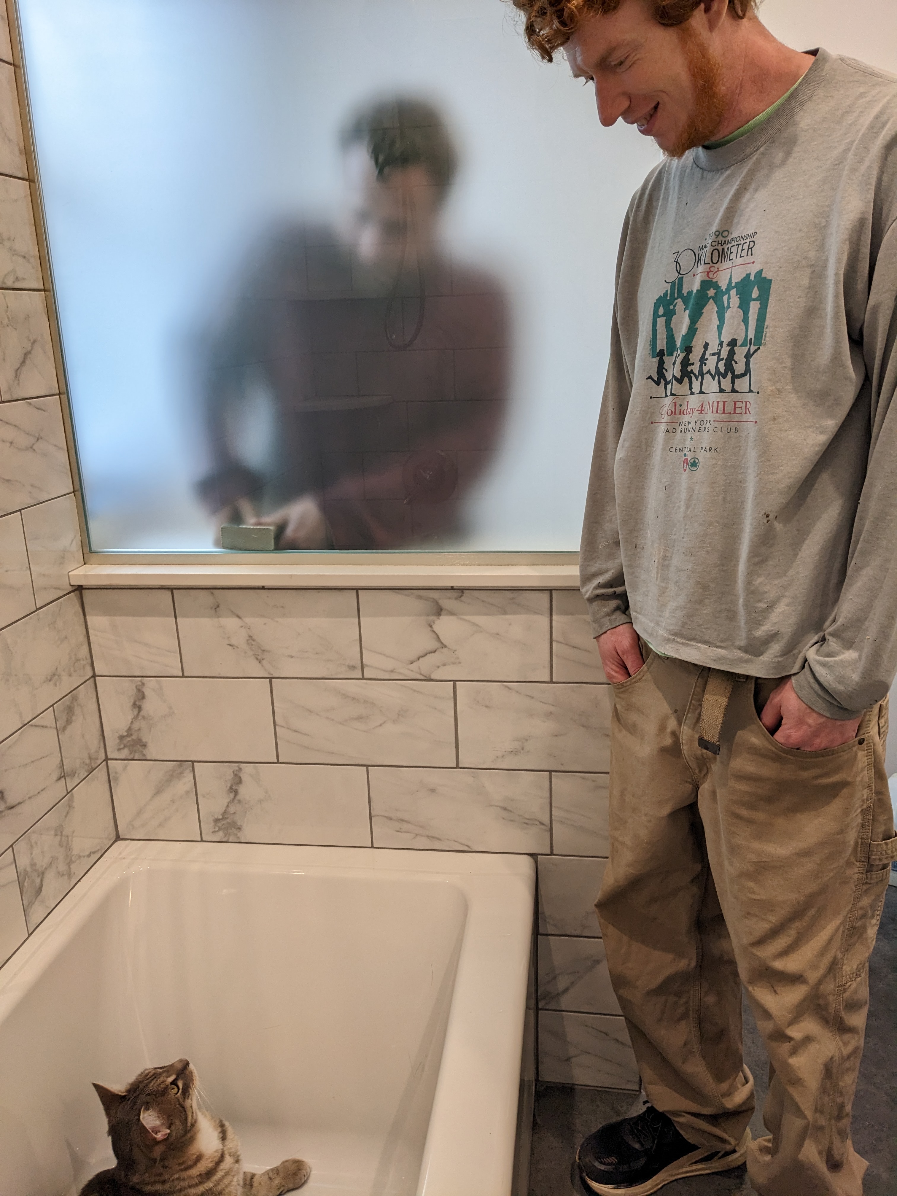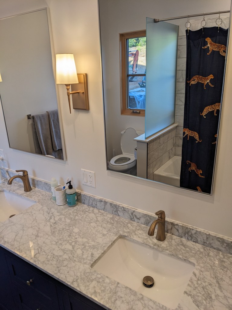 We still need to do all the trim in the master bath and finish decorating but it’s pretty luxurious already. We don’t have to don shoes and a headlamp to walk to the shop bath in the middle of the night.