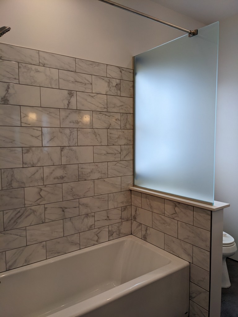 I thought about closing off the toilet zone with walls and a door; however, the window was by the toilet and I wanted to maximize the amount of natural light in the bathroom. So, we built a pony wall as a partition and set a frosted glass panel on it for a little privacy.