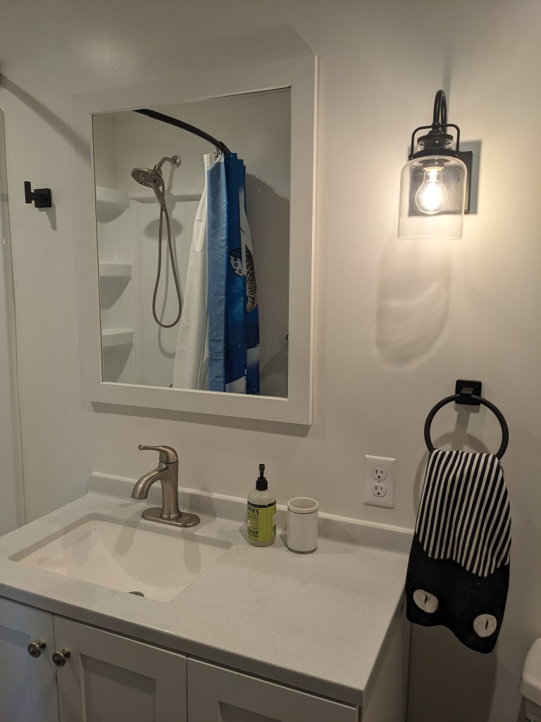 Equipped with a shower curtain and better lighting, we moved some toiletries over and started showering at the shop! (I won’t show a picture of that.) The only unfinished items in the shop bath are baseboards and door trim.