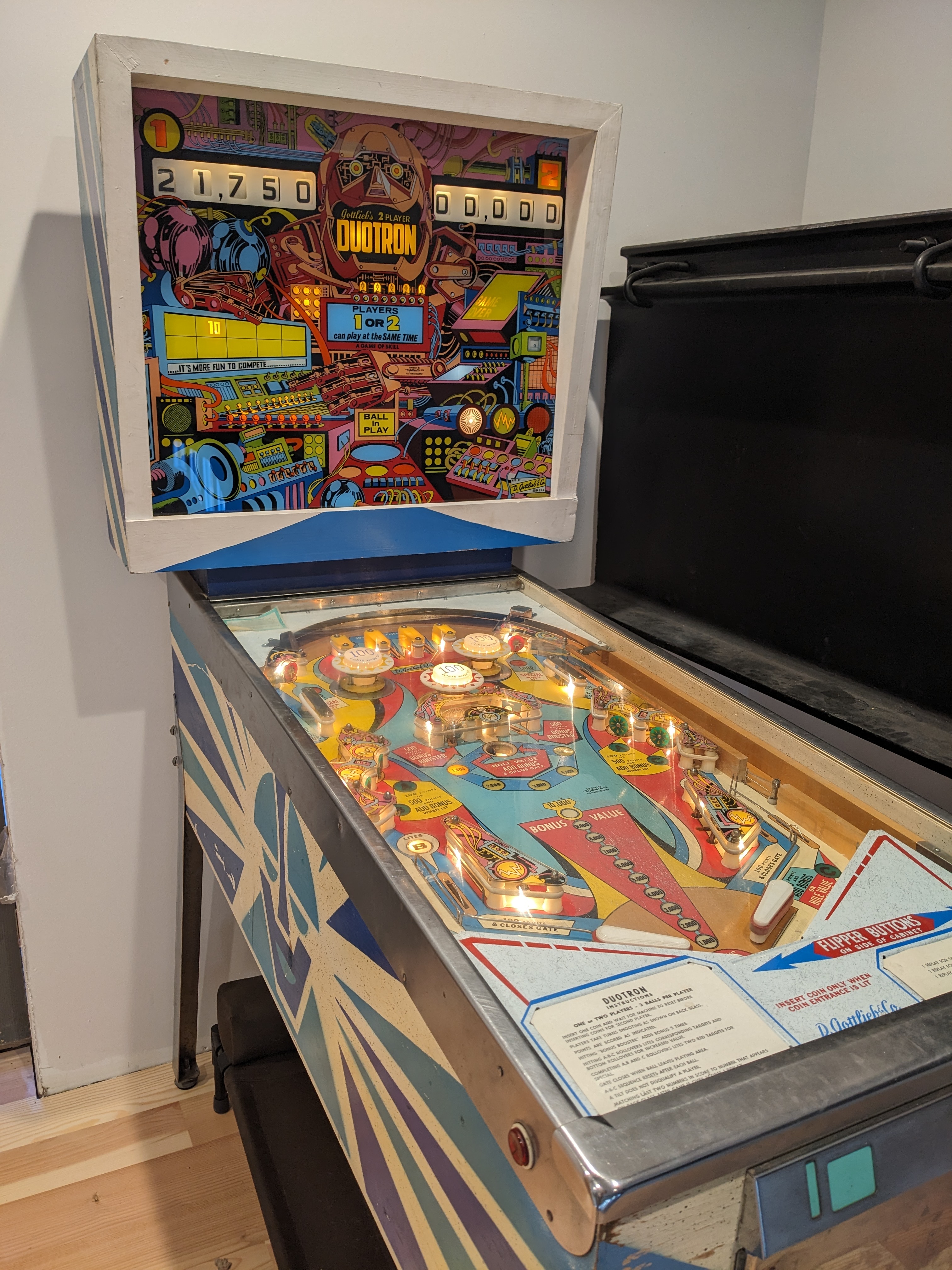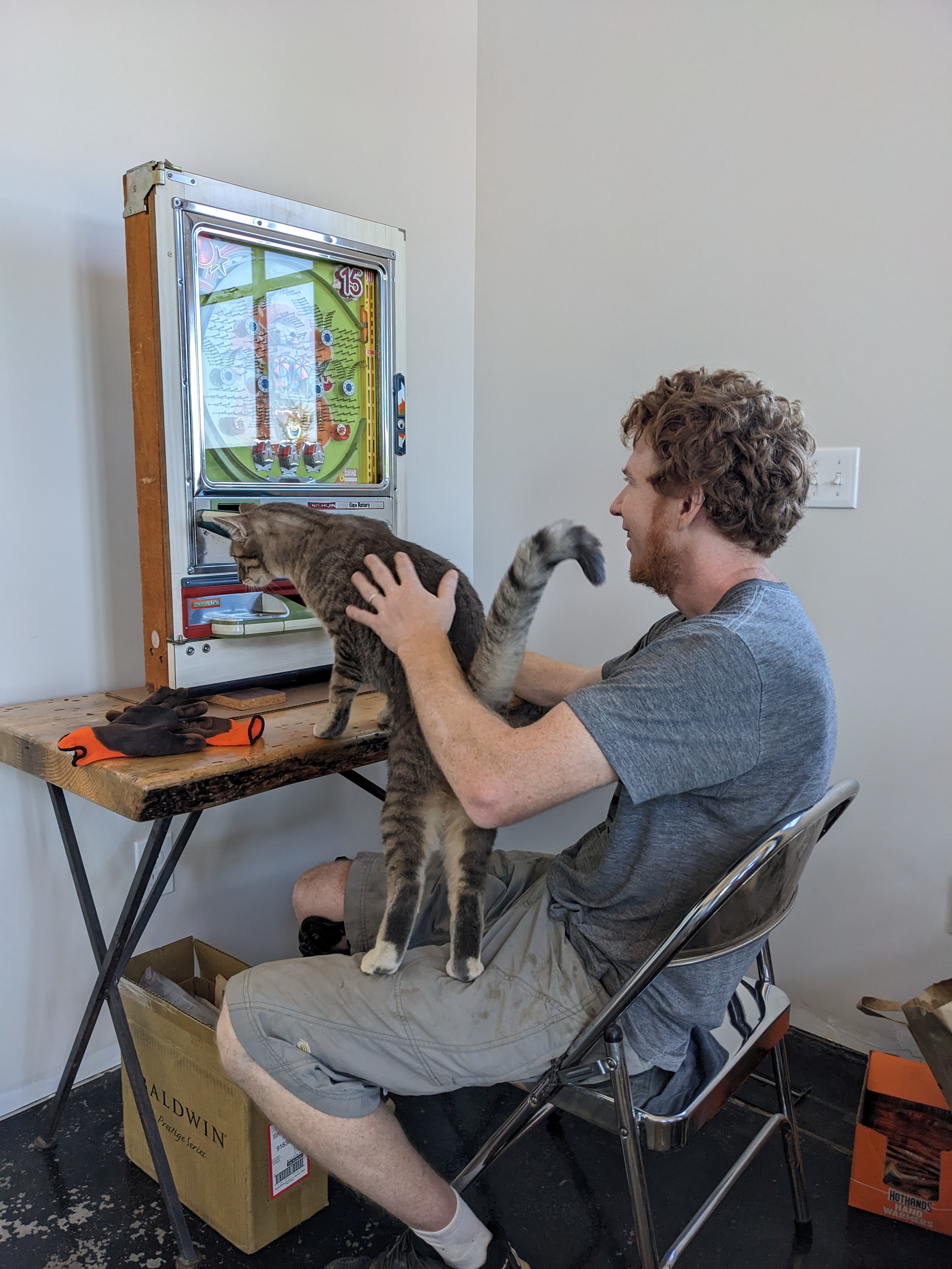 We took a break from unpacking to set up the pinball and pachinko machines.