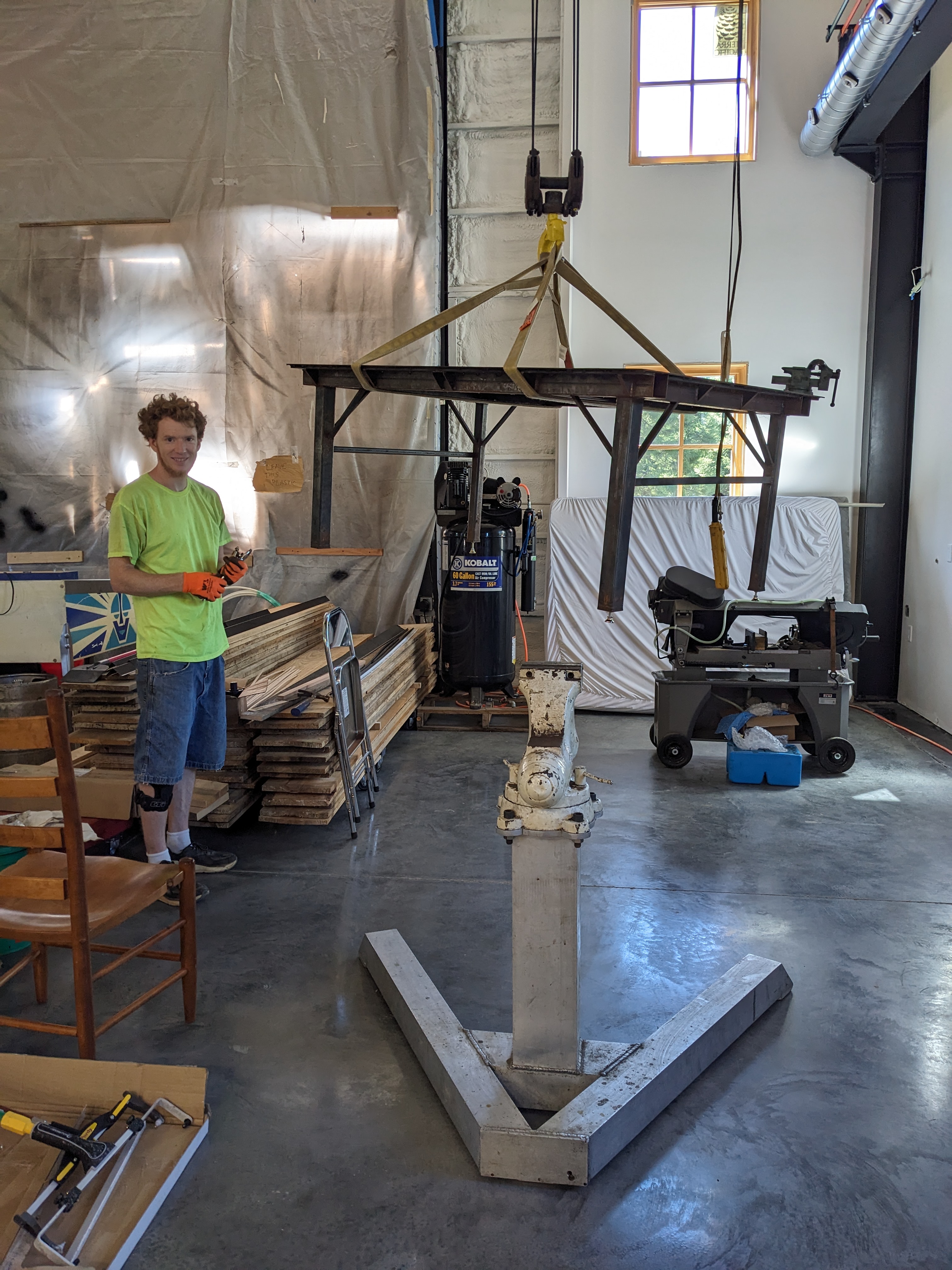 After a hundred more anecdotes and complaints, he removed the motor from the top and fit four skates under it (the yellow things). It was ready for transport! It was a bit teetery and nearly impossible to steer, but luckily didn’t have a long way to travel. Each turn required some rearranging of things. Hours later, as the machine was about to see daylight, it was stopped by a low hanging pipe! We had to find a low spot on the floor in addition to lowering the “adjustable” feet on the CNC. Finally, we cleared the last pipe!