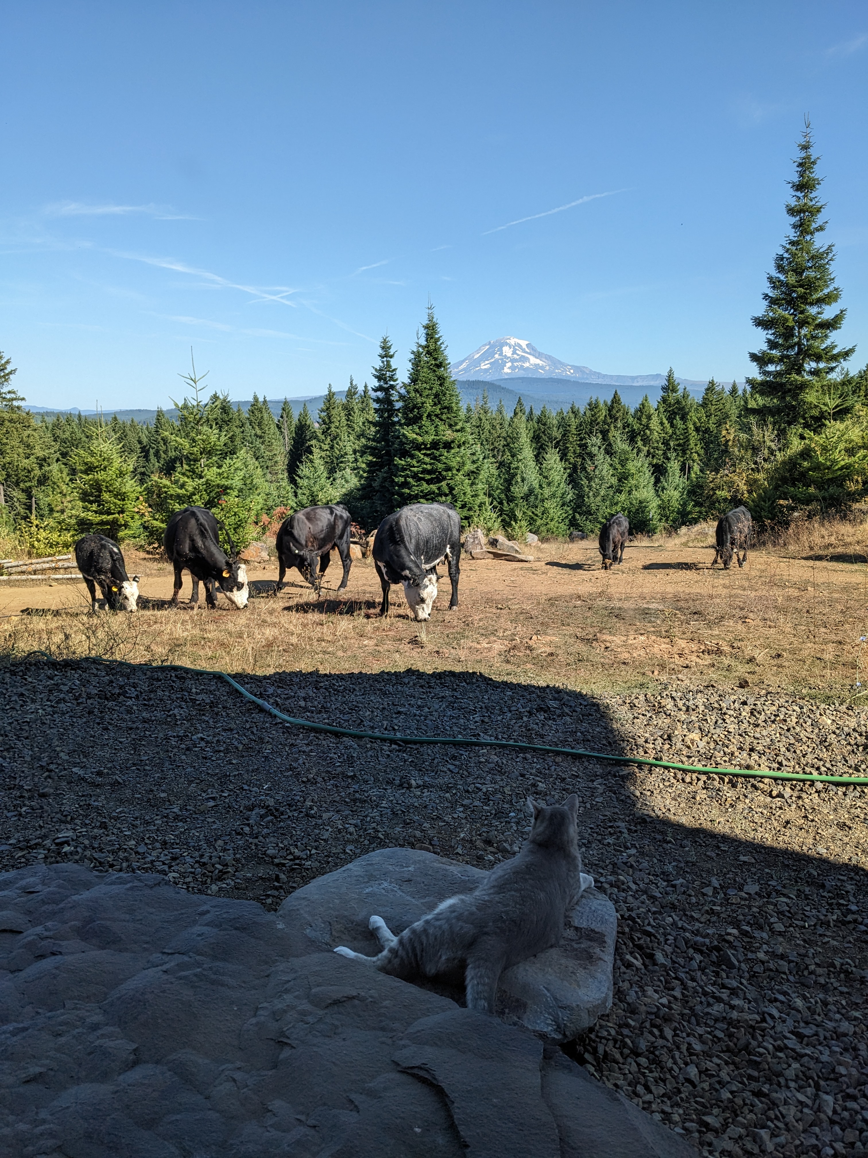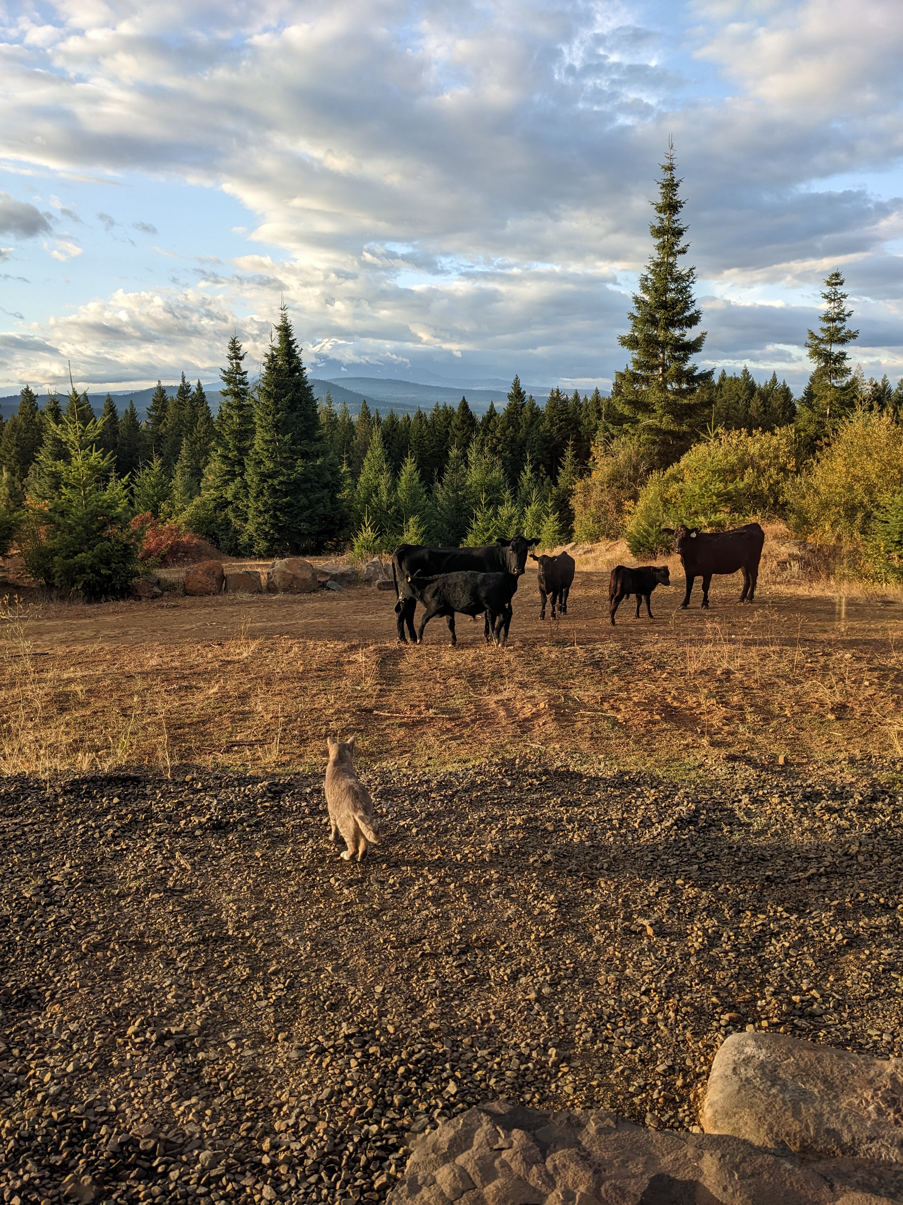 We weren’t the only ones moving this fall. The cows finally made their way up to our shop to graze. We hadn’t seen them all summer, so the cats had never met them. Buster was instantly interested in them and occasionally got a little too close and spooked the cows.
