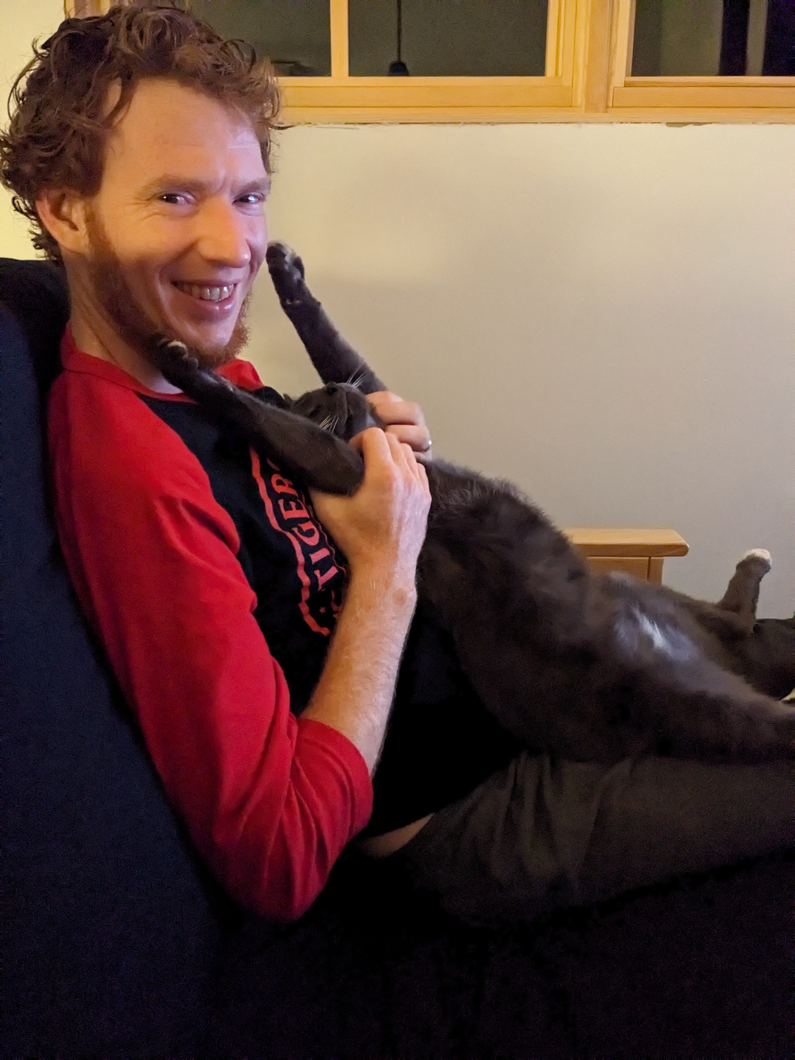 He wore himself out playing in all the dunnage and ultimately retired in his new chair. Yes, it was once Sam’s, but Buster claims it first every evening when we sit down to watch TV.