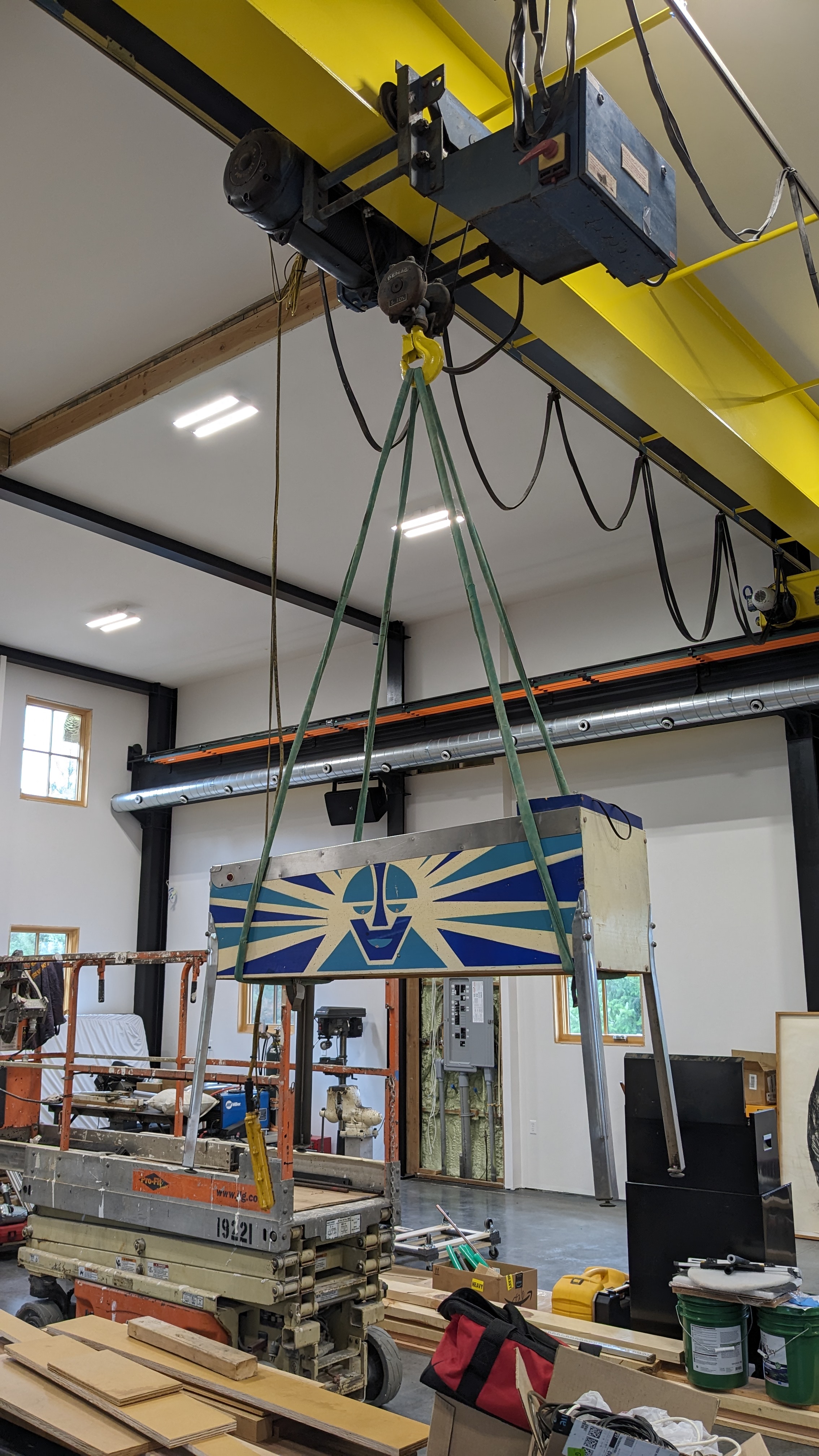 There wasn’t quite enough height on the crane to lift it over the wheel well, and it became a puzzle to rig it. Sam eventually solved the puzzle, and we craned it to its final resting place.