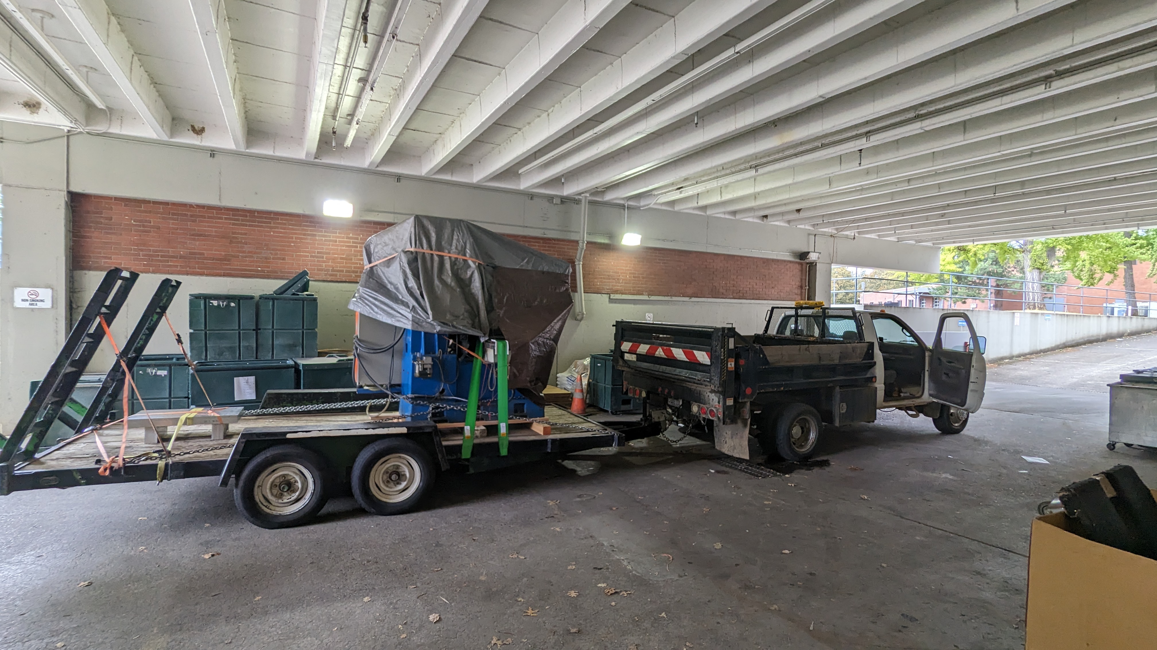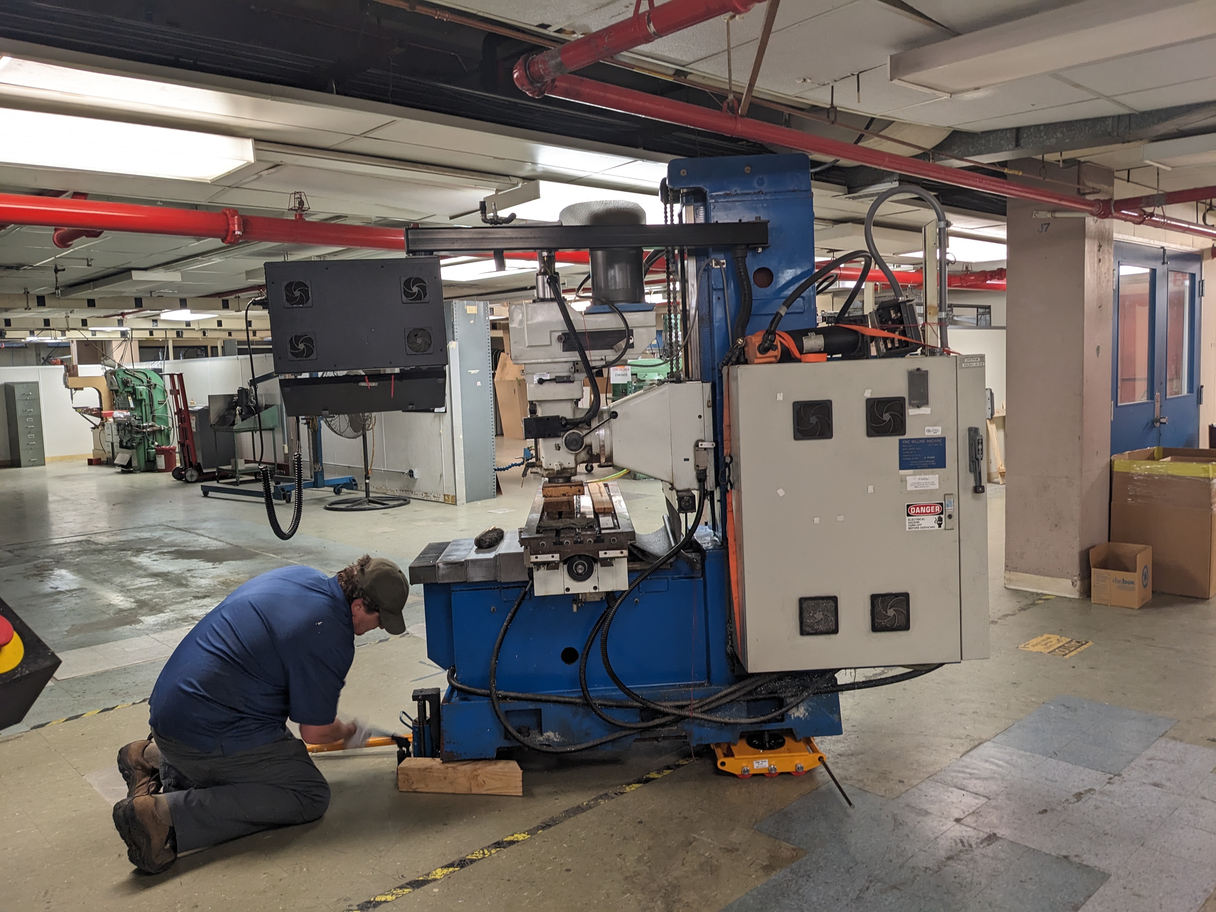 By that time, a couple of recently retired 70-year-old men stopped by to observe the action. One was the previous CNC operator and gave us a brief history. The two retirees stuck around for a bit and helped with the final push. Yes, their strength was actually required to get it up the 1% sloped ramp! Once it was outside, the moving guy built a pallet under it, and we called it a day.