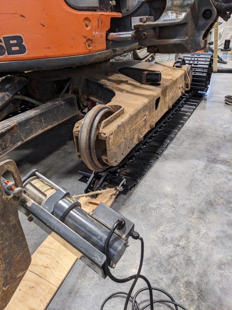 Sam swapped out the tracks and sprockets by himself with a little help from the crane. Some of you might recognize the old Christmas tree bailing winch pulling the new tracks on.
