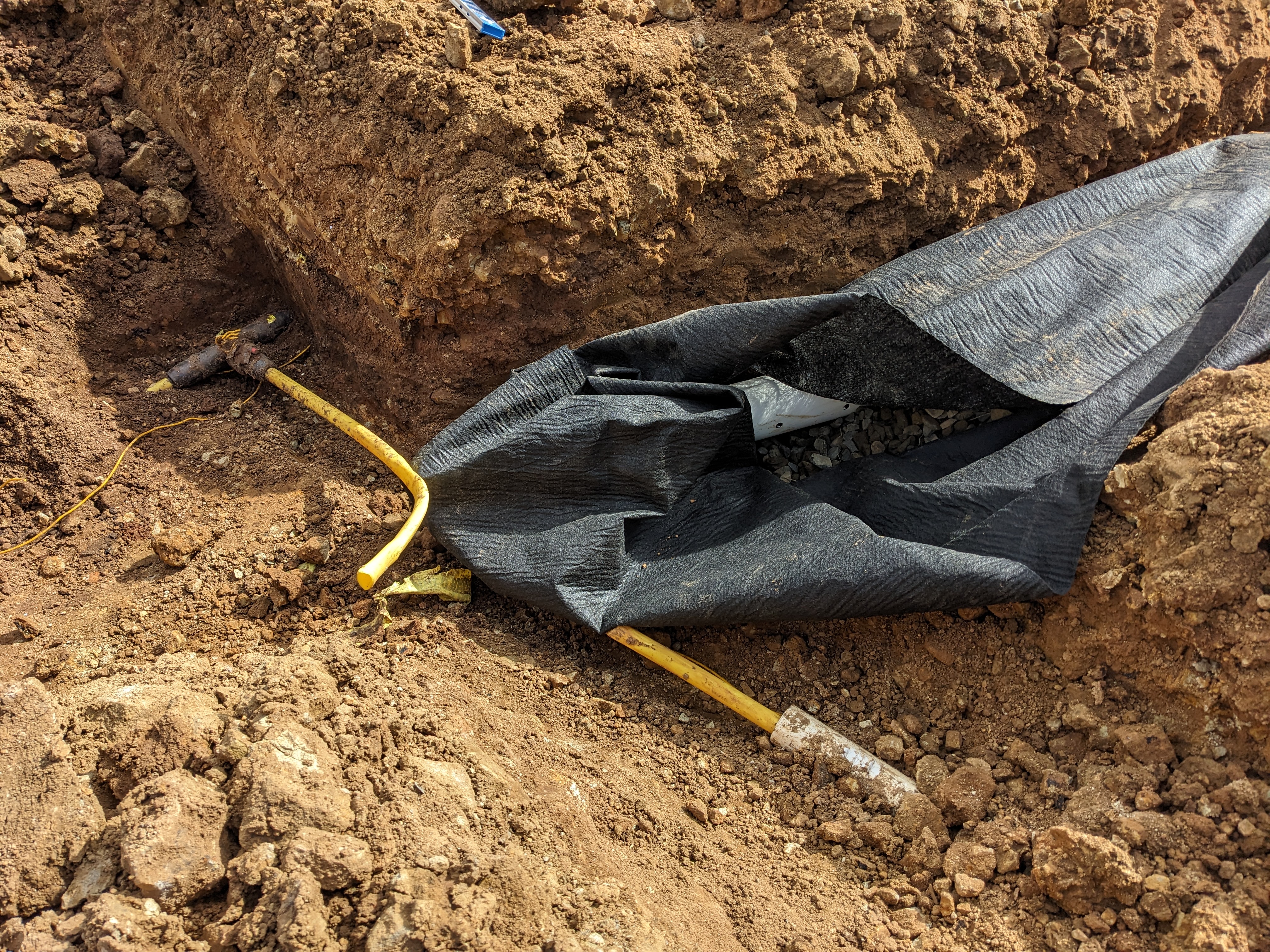 We installed part of the French drain, first laying fabric down and making a cocoon around drain rock and 4″ perforated pipe. Then we held the fabric shut and sprinkled another layer of drain rock over everything.