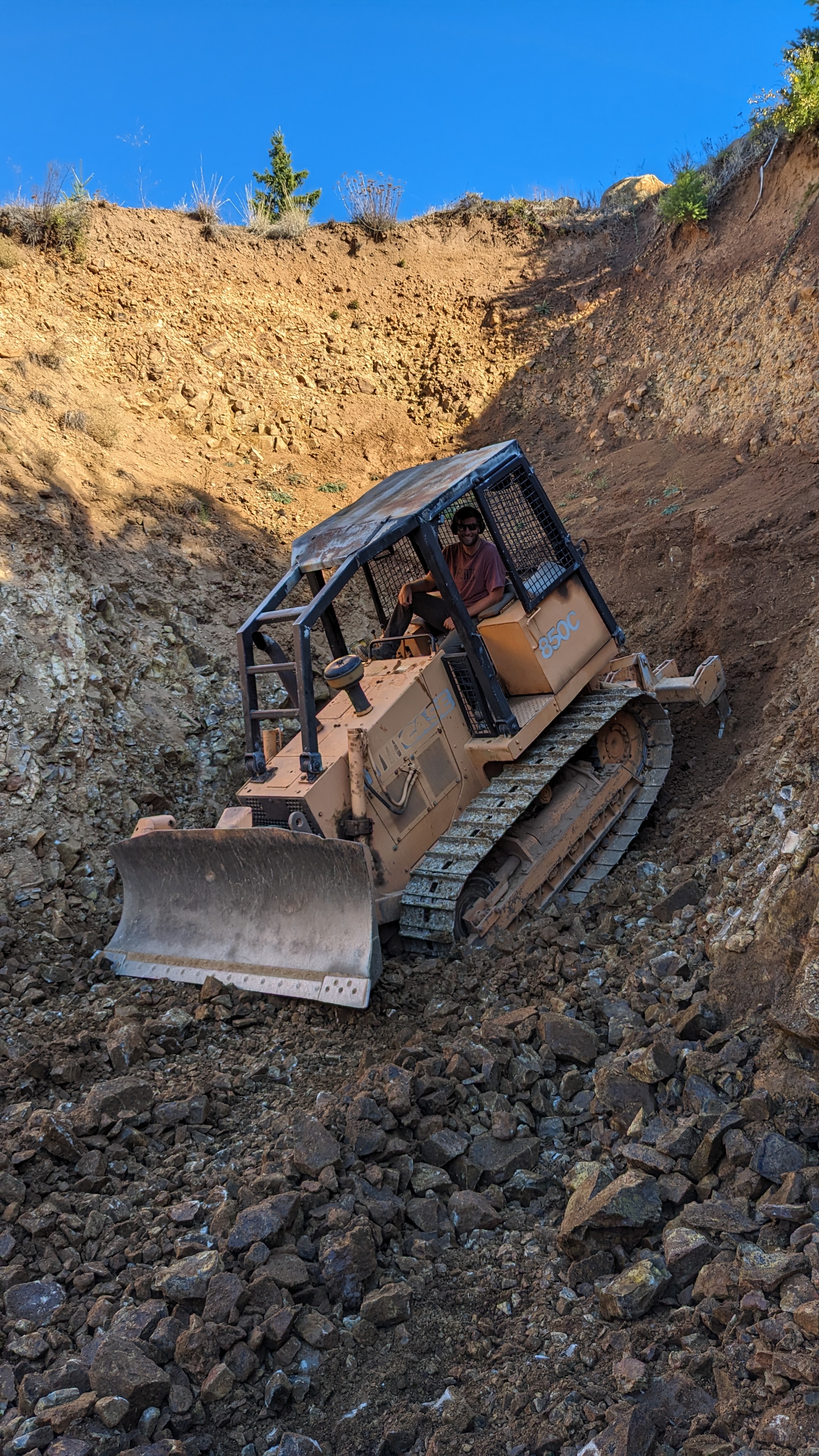 The first part of the project involved building a new section of the driveway to shuttle rocks up from the pit. Fortunately, there weren’t too many trees in the way of the path. Unfortunately, the new road was on a side-slope, so Sam and Jackson had to remove a lot of dirt to make a level road.