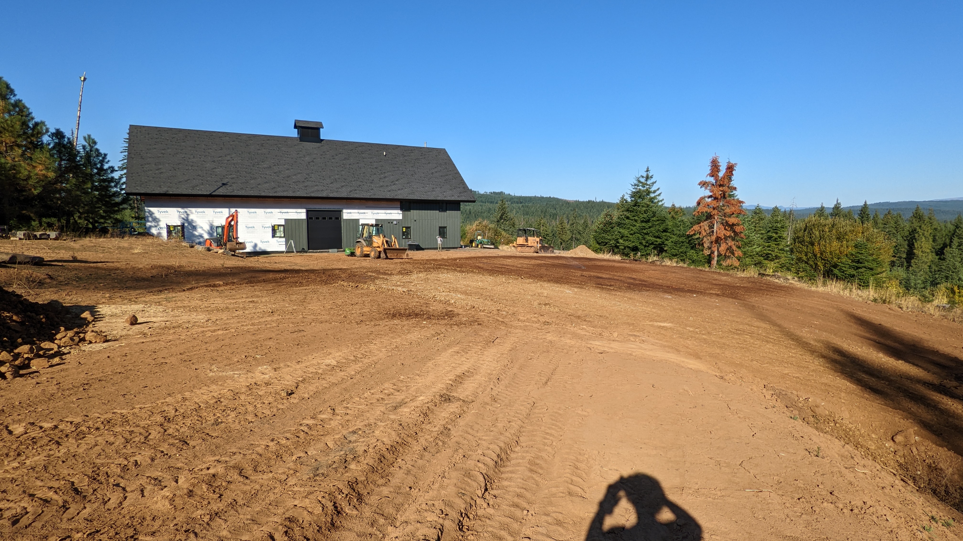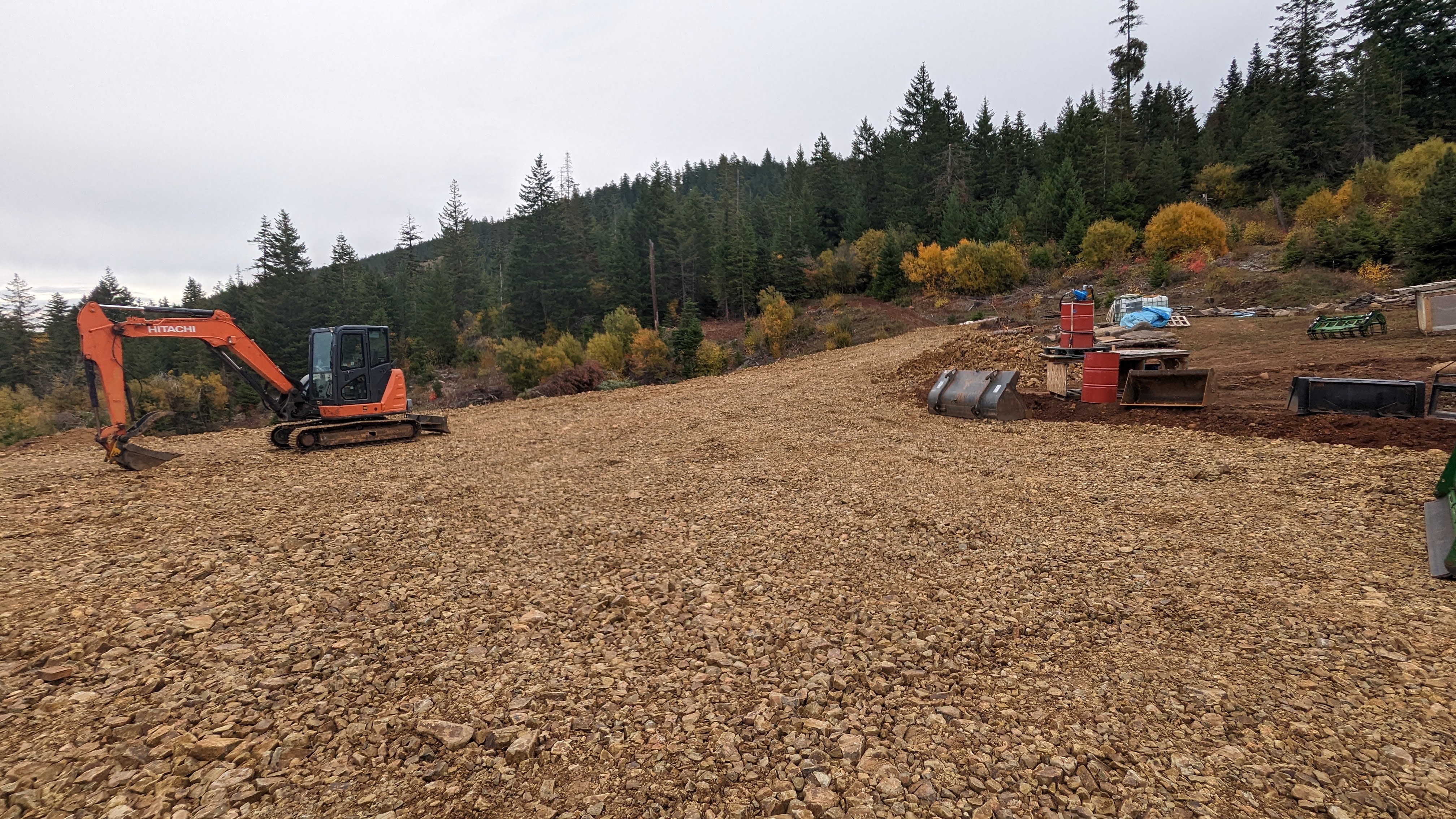 This process went on for a few days, until the compacted rock was about 8+ inches deep everywhere. The area in work was over 20,000 sq ft – almost half an acre! That equates to 500 cubic yards of rock, which is 100-200 giant loader buckets.