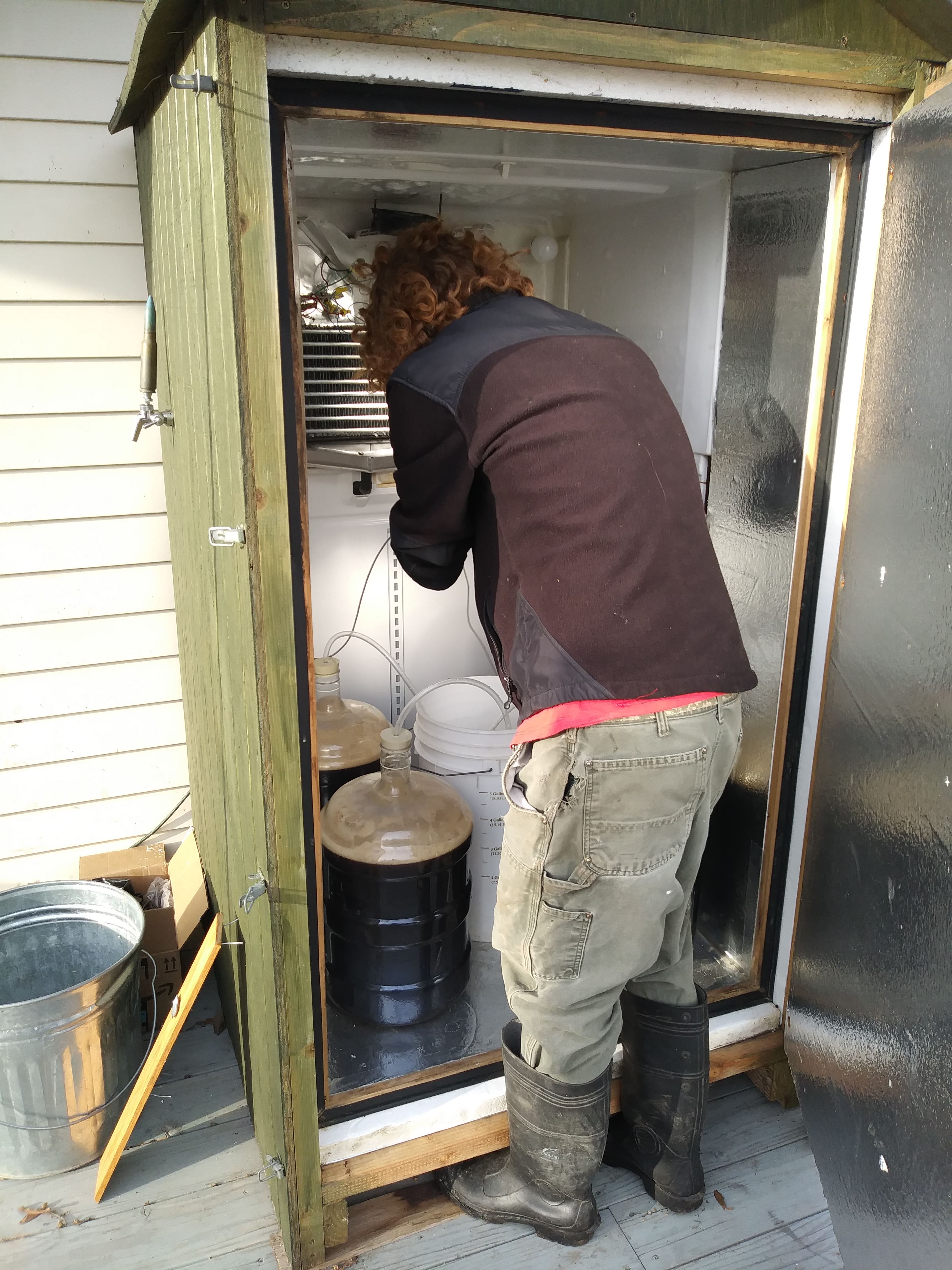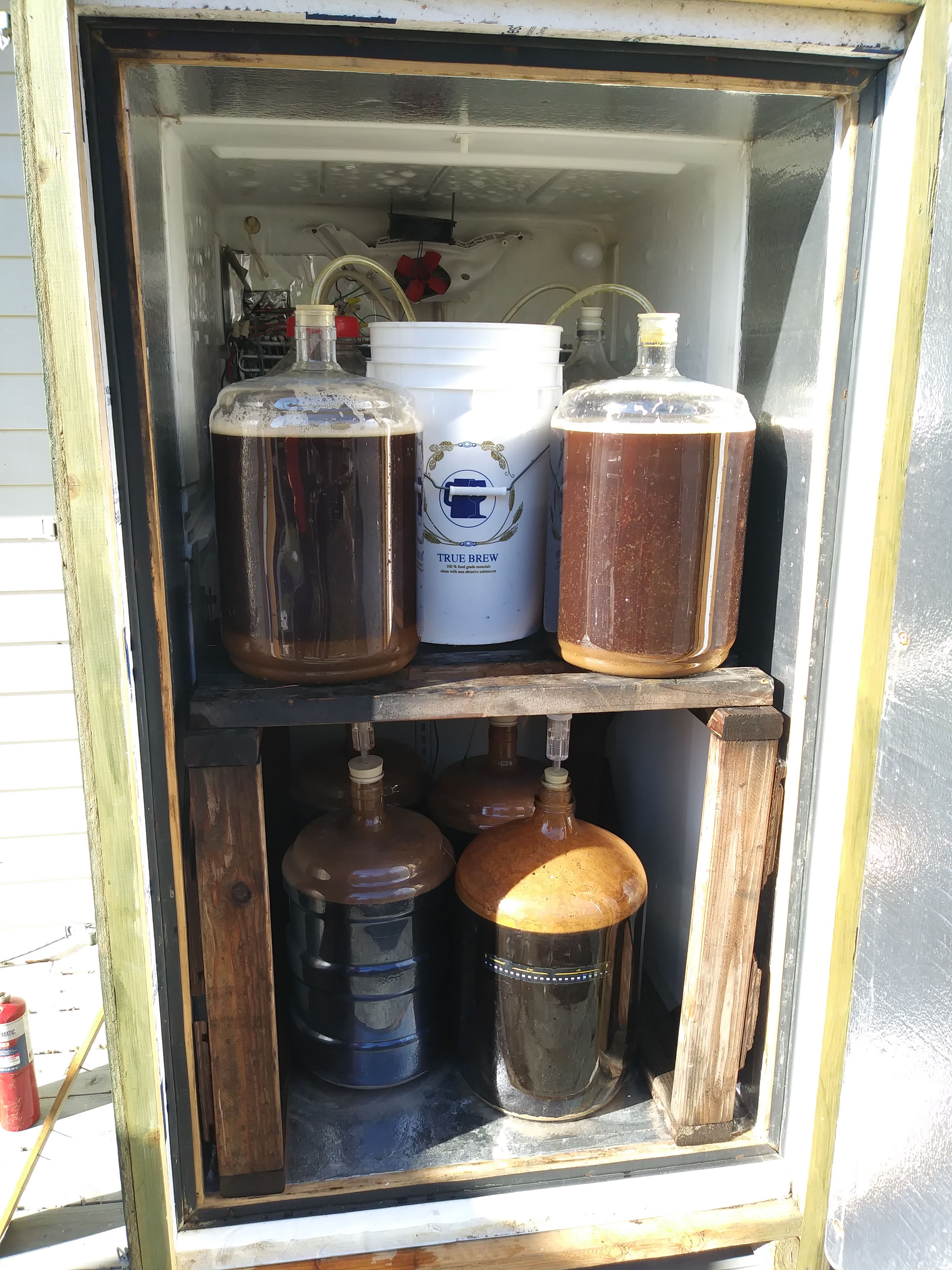 A shiny conical fermenter! Instead of filling 4-5 cumbersome carboys, we can pump the whole batch of beer into the fermenter. The fermenter not only replaced the carboys but also the lagerator fridge. (See the old setup below.)