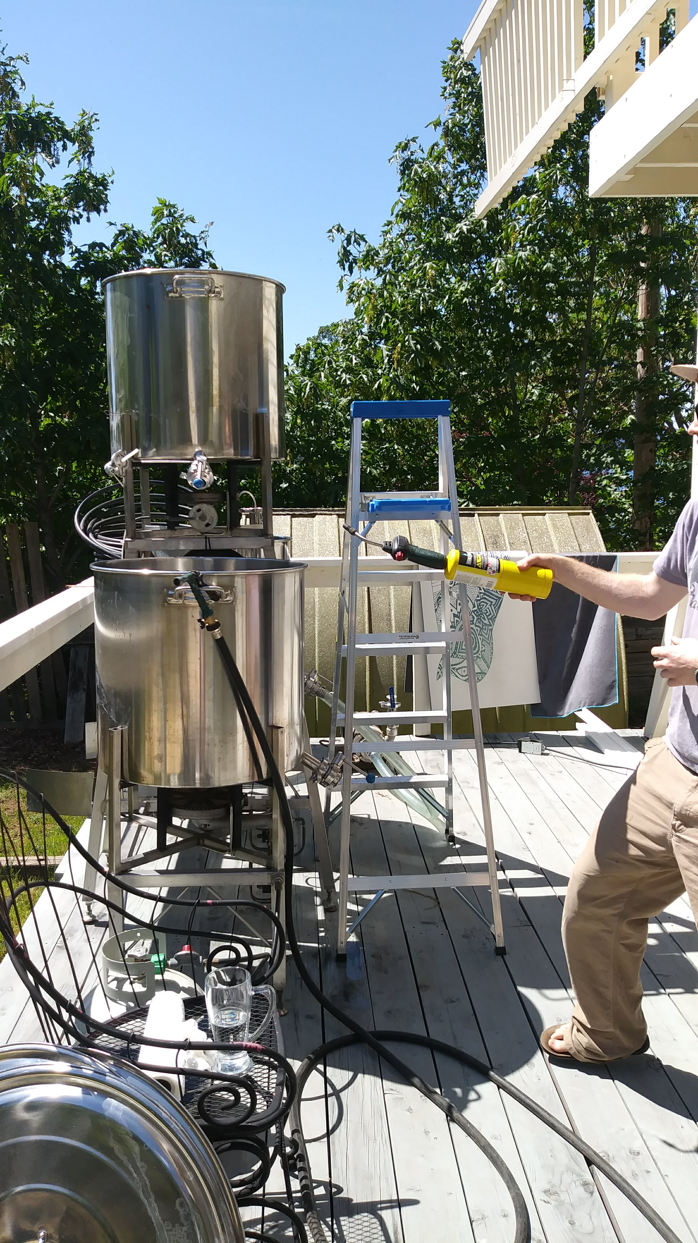 Brewing in the summer wasn’t a dream either. The winds blew yard debris into the pots, spiders occasionally dropped into the boil, frogs took refuge in the stand, and worst of all yellow jackets nested in the valves.