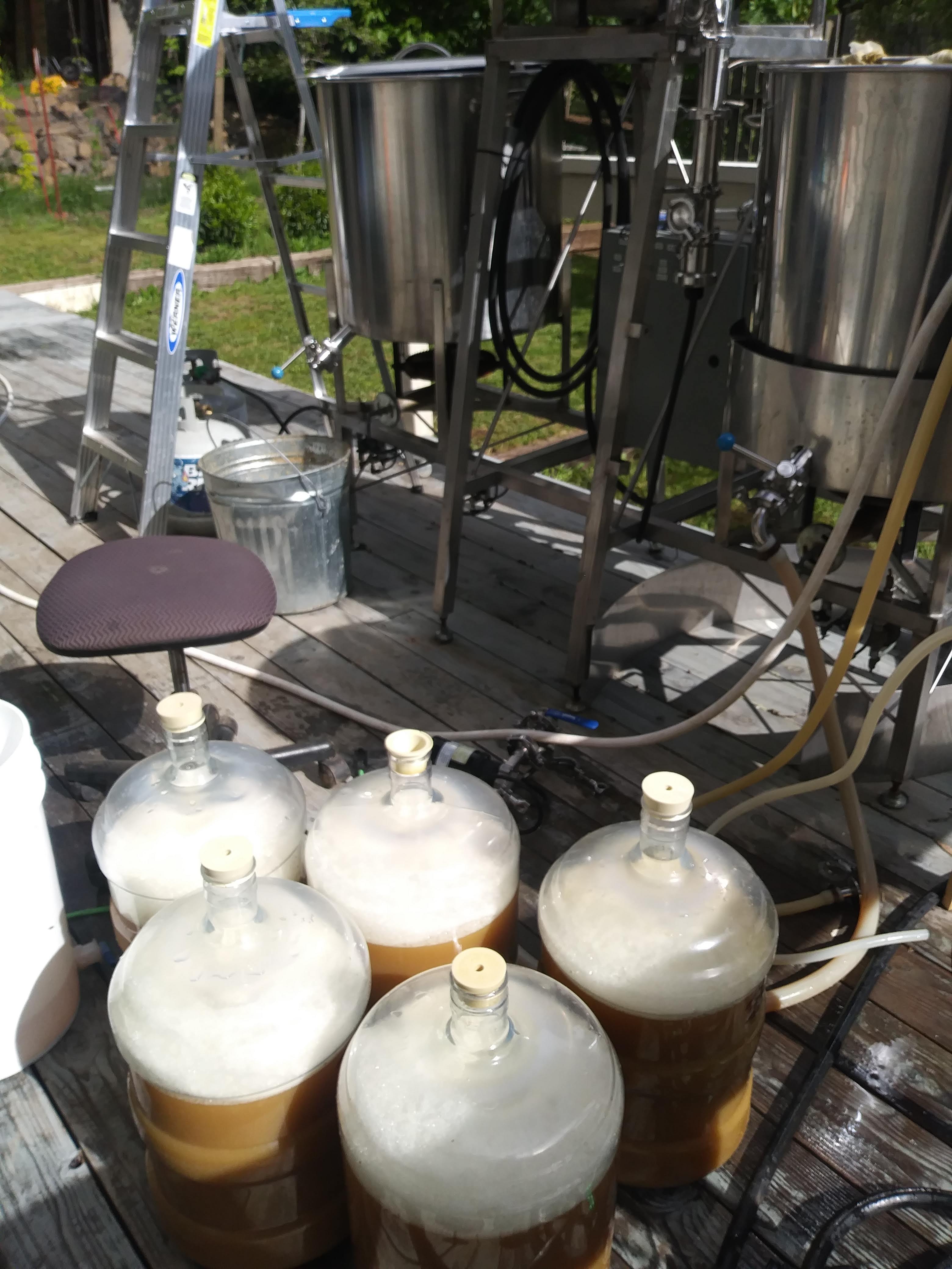 The fermenter really simplified things at the end. Our old method involved oxygenating each carboy once it was filled. Then we measured out the yeast and added some to each carboy, being careful not to contaminate anything. Sam had a designated stool for this step because it took so long.