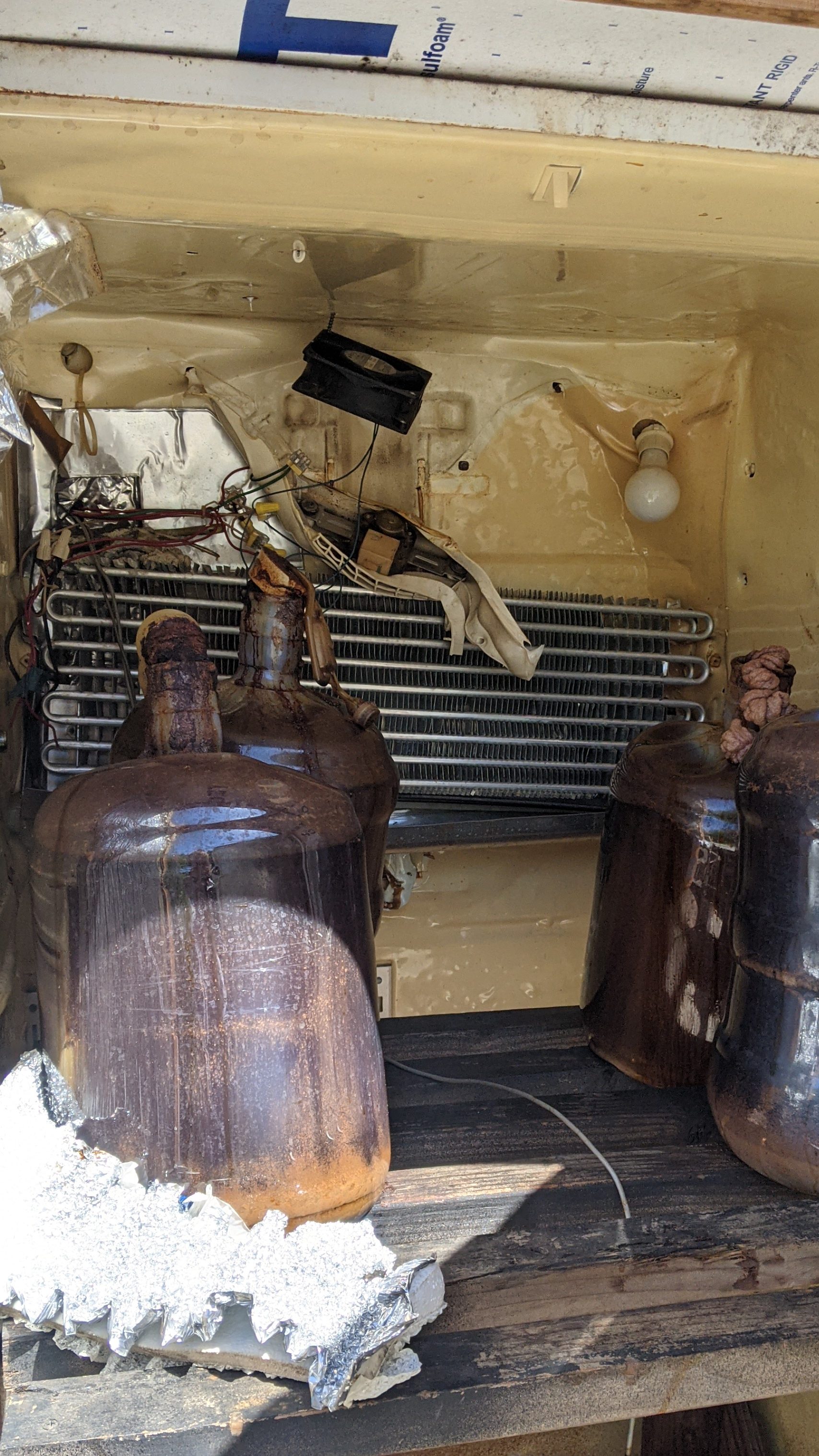 Some of you may think that we chose not to brew for two years because we were too busy. It was actually the lagerator that was the ultimate demise to our brewing operation. We had just brewed 25 gallons of a refreshing IPA to get us through the first summer of construction in 2021. Sam checked on the beer one night to see if it was ready, and we went to retrieve our first keg a few days later. On the drive over, we heard devastating news on the radio that many local cherry orchards lost their entire crop due to an unexpected spring freeze. Little did we know we were about to discover something more devastating. We opened the lagerator door to see melted plastic everywhere, charred insulation, and deformed plastic carboys full of an undrinkable dark liquid. Apparently the temperature sensor slipped out when Sam shut the door, and the lagerator nearly set itself on fire trying to combat the freezing temperature that the sensor was reading.
