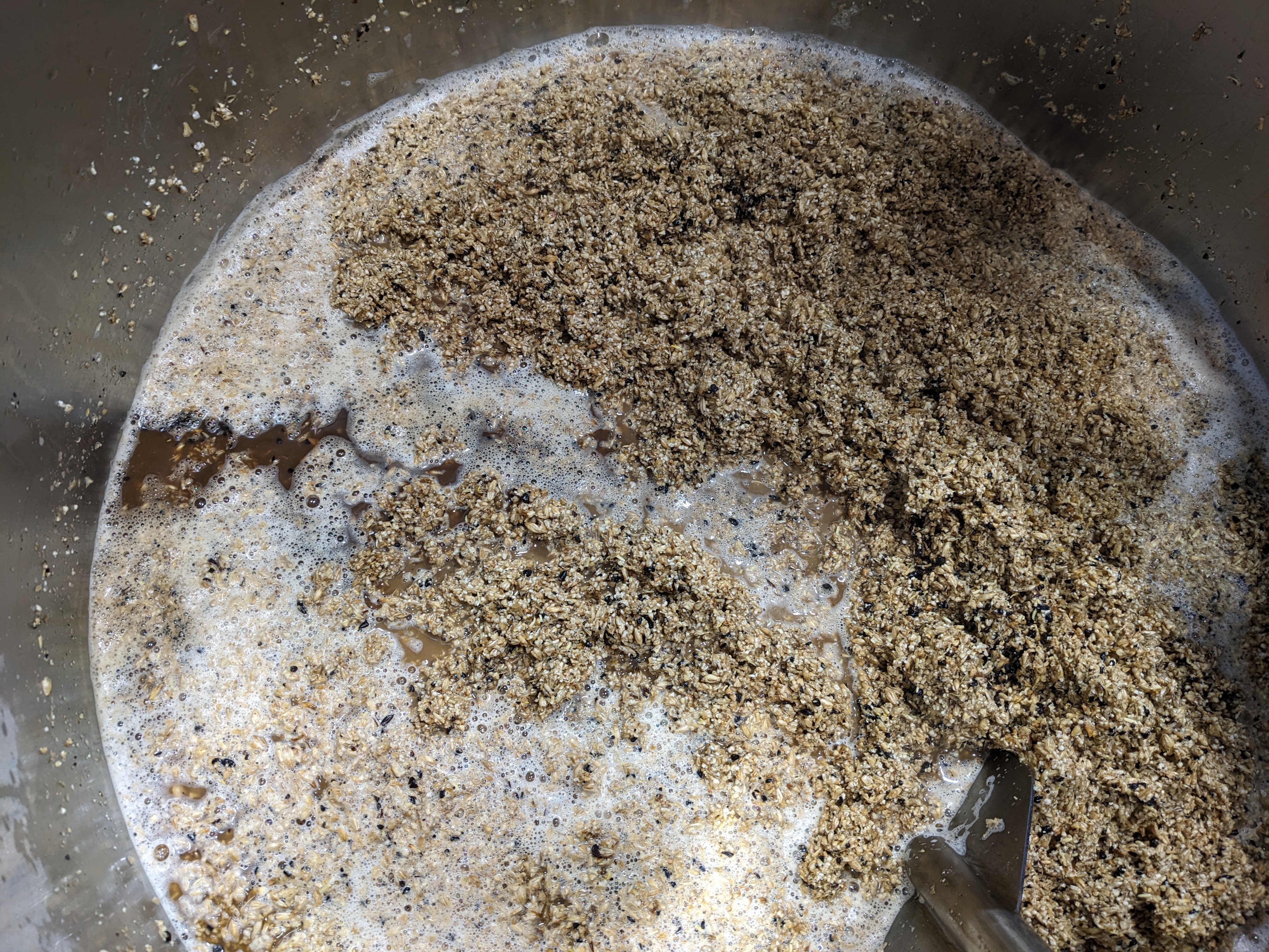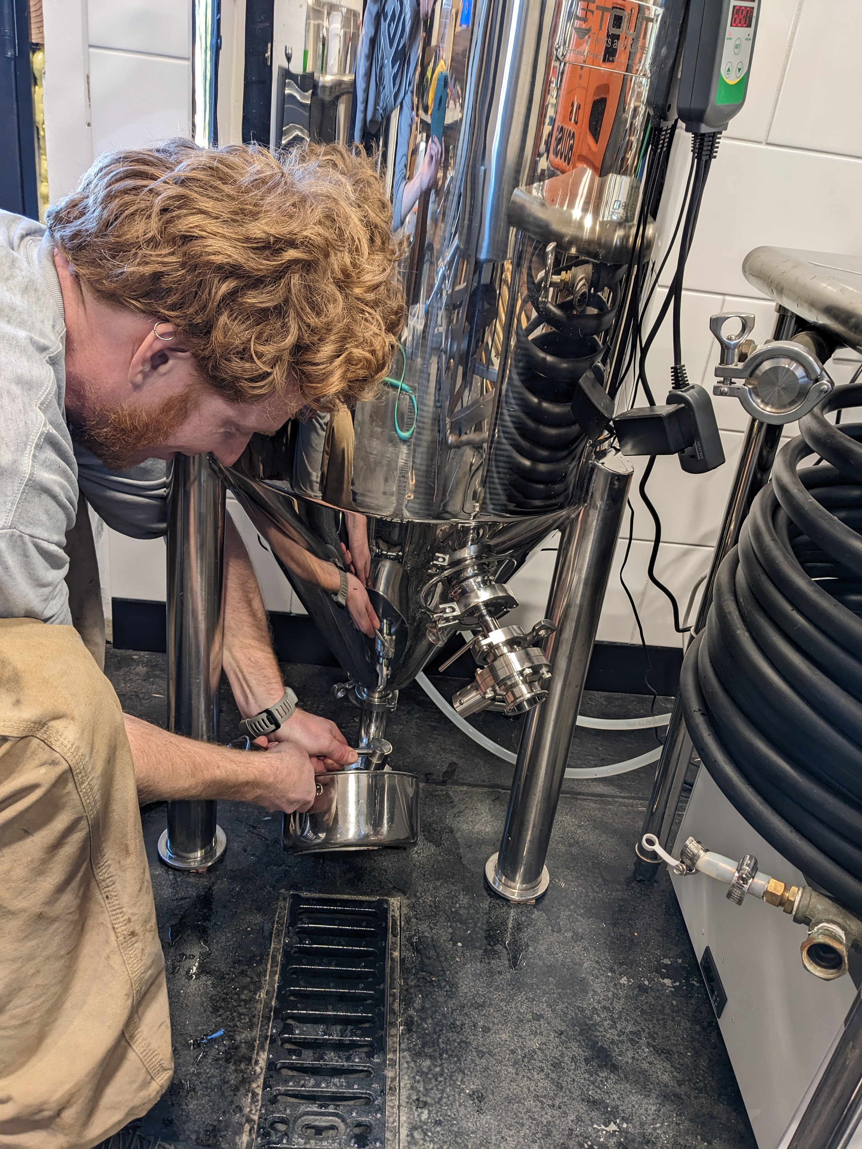 Two weeks later we drained some of the sediment and collected yeast off the bottom. This was quite messy. We didn’t release enough pressure before opening the valve, and brown sludge came gushing out everywhere.
