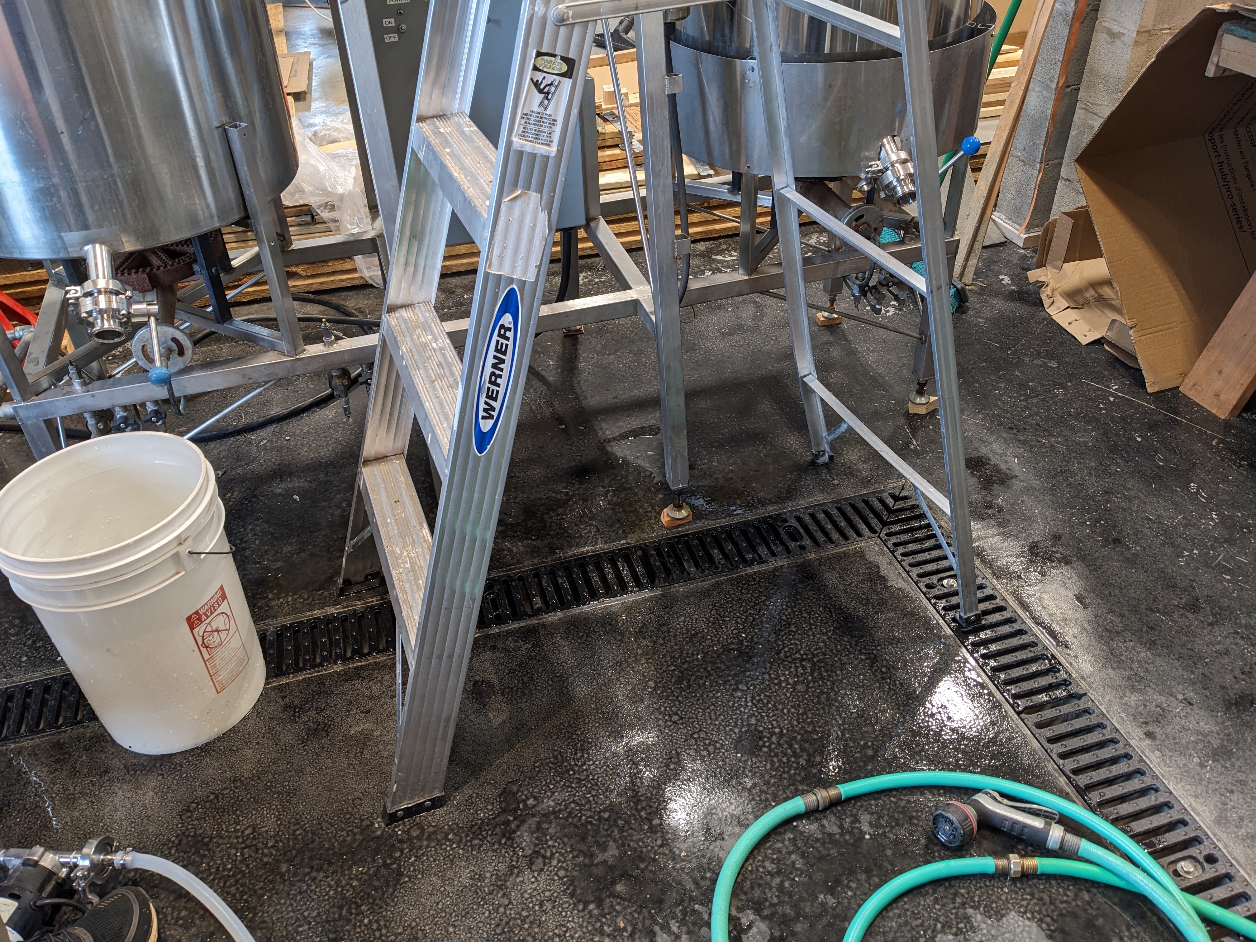 We also have hot and cold water lines coming up through the floor in the brewing area, which will make filling the pots and cleaning them more convenient. The pipes aren’t hooked up to anything yet, but next time we’ll unpack the faucet and have this set up.