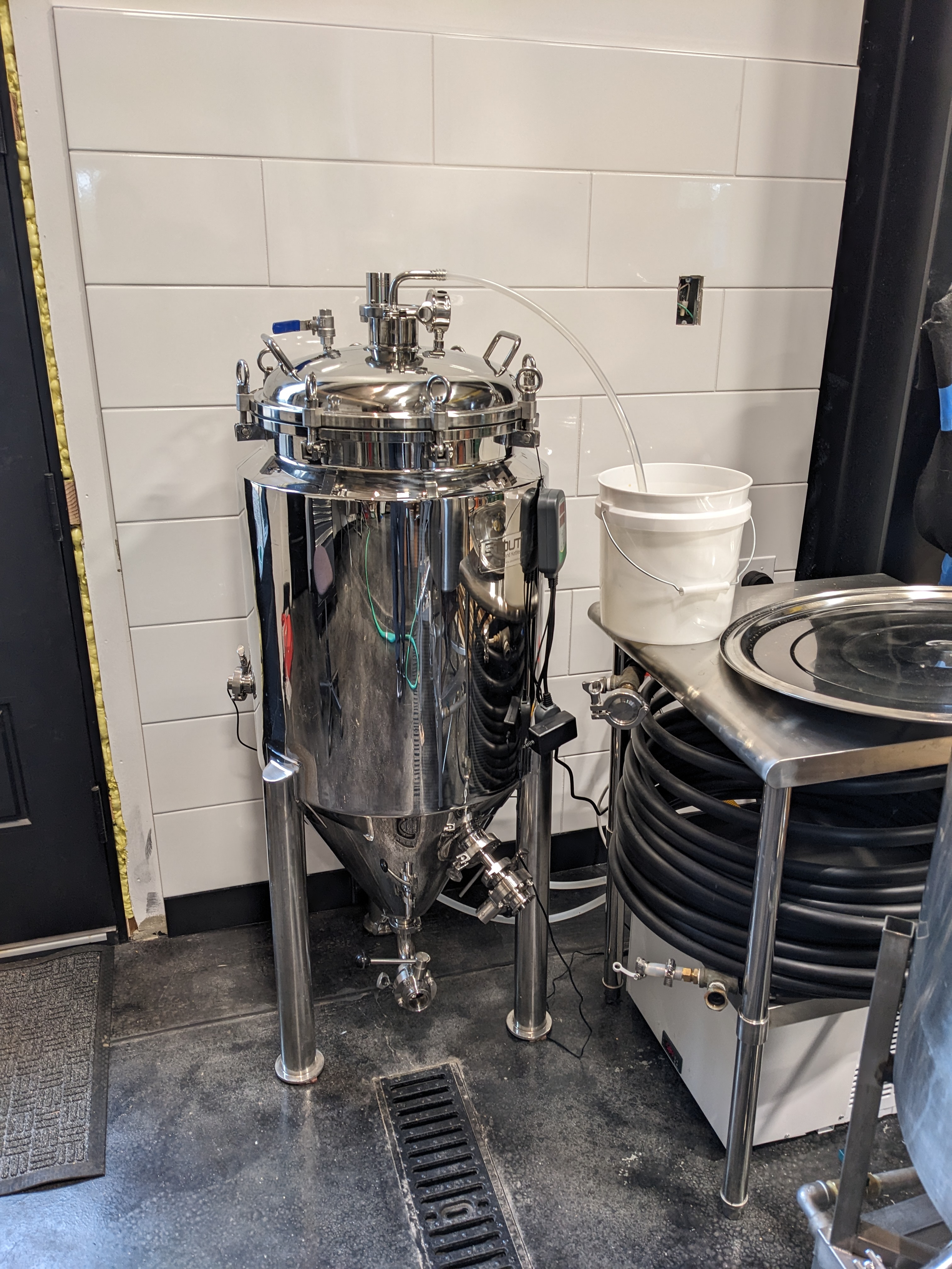 We had to throw everything away, including the lagerator. It’s impossible for us to have a meltdown now! Our new fermenter has a cooling jacket between two of its steel walls. This tiny glycol chiller circulates the refrigerant through the cooling jacket.