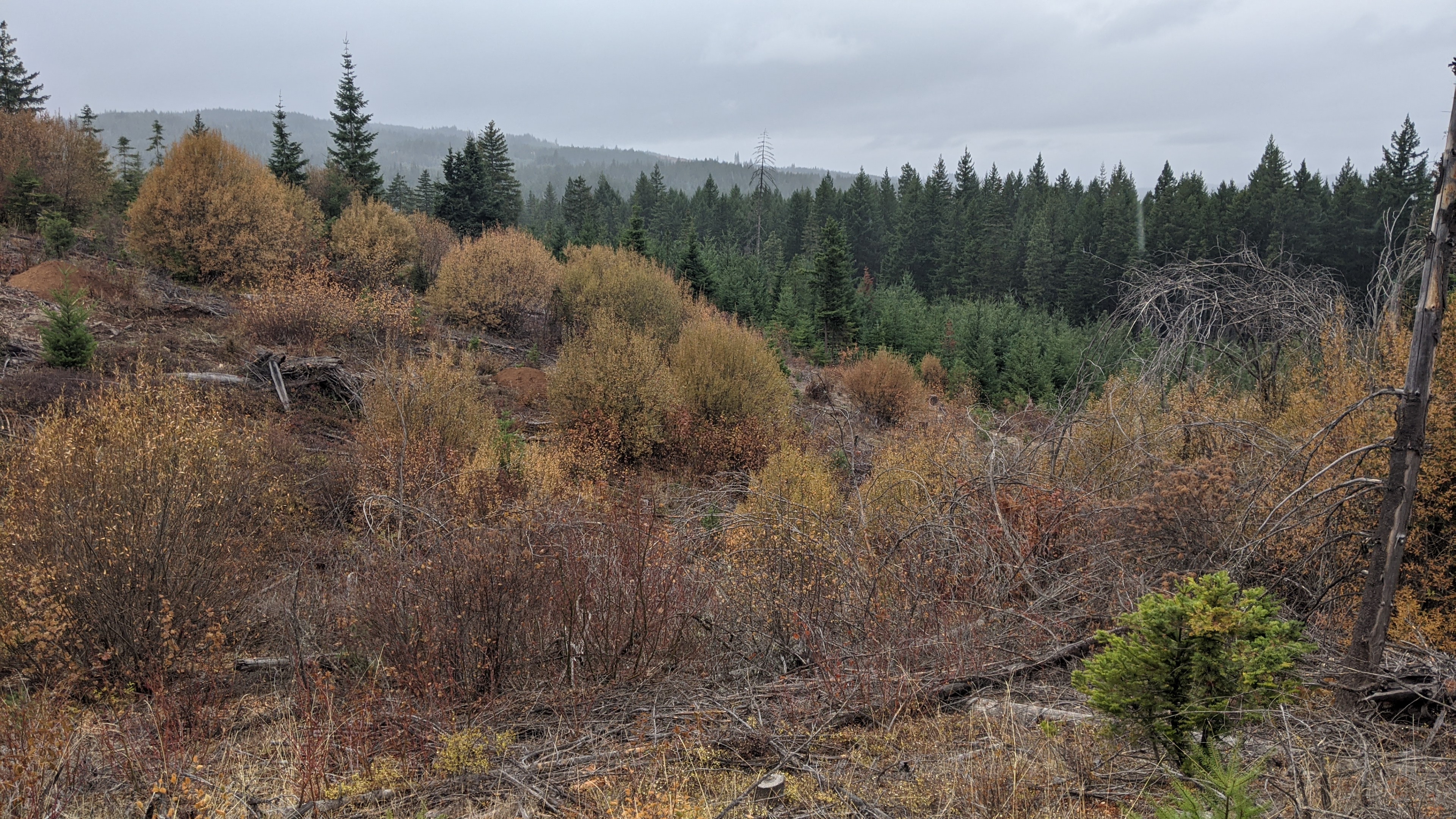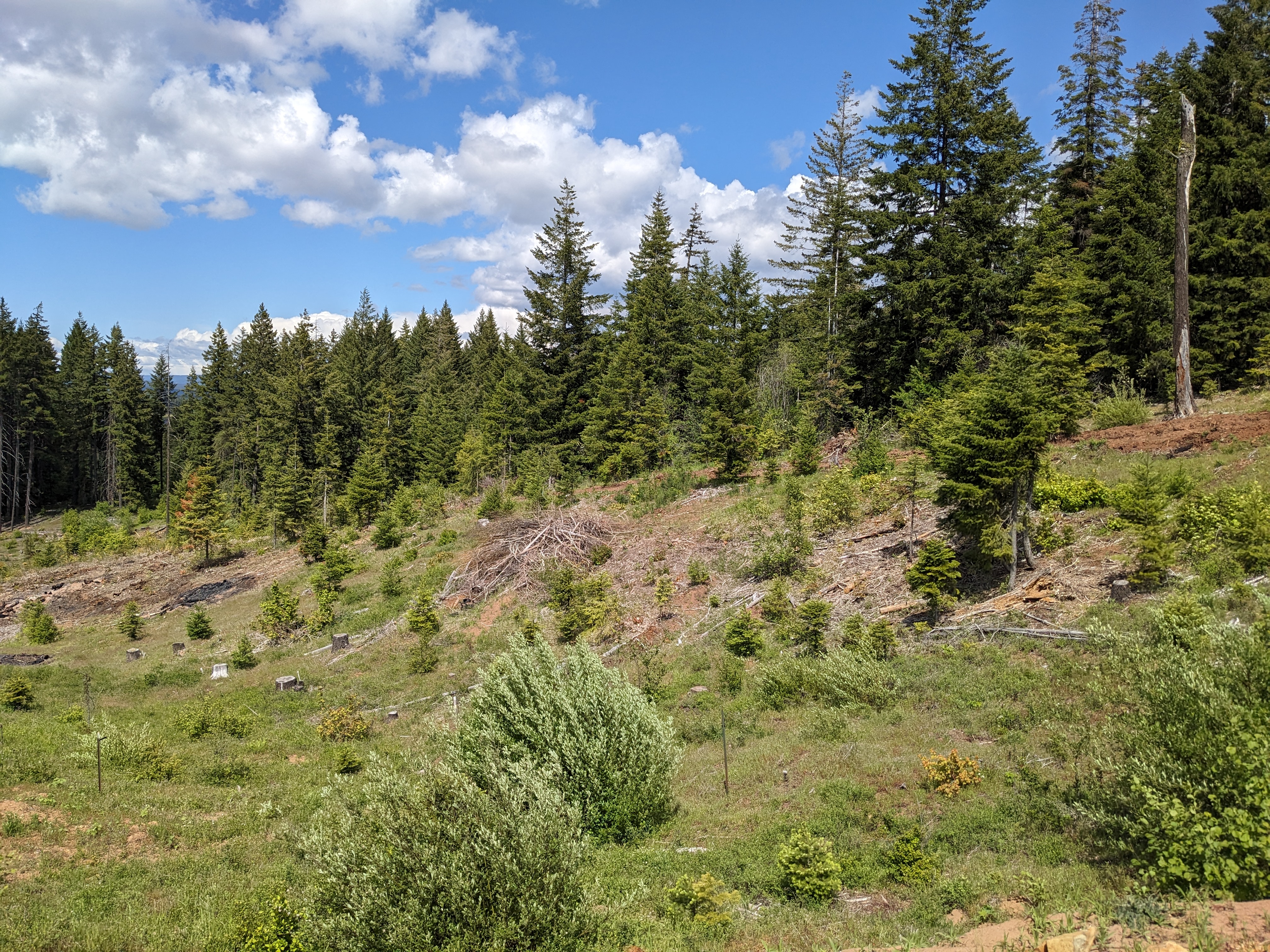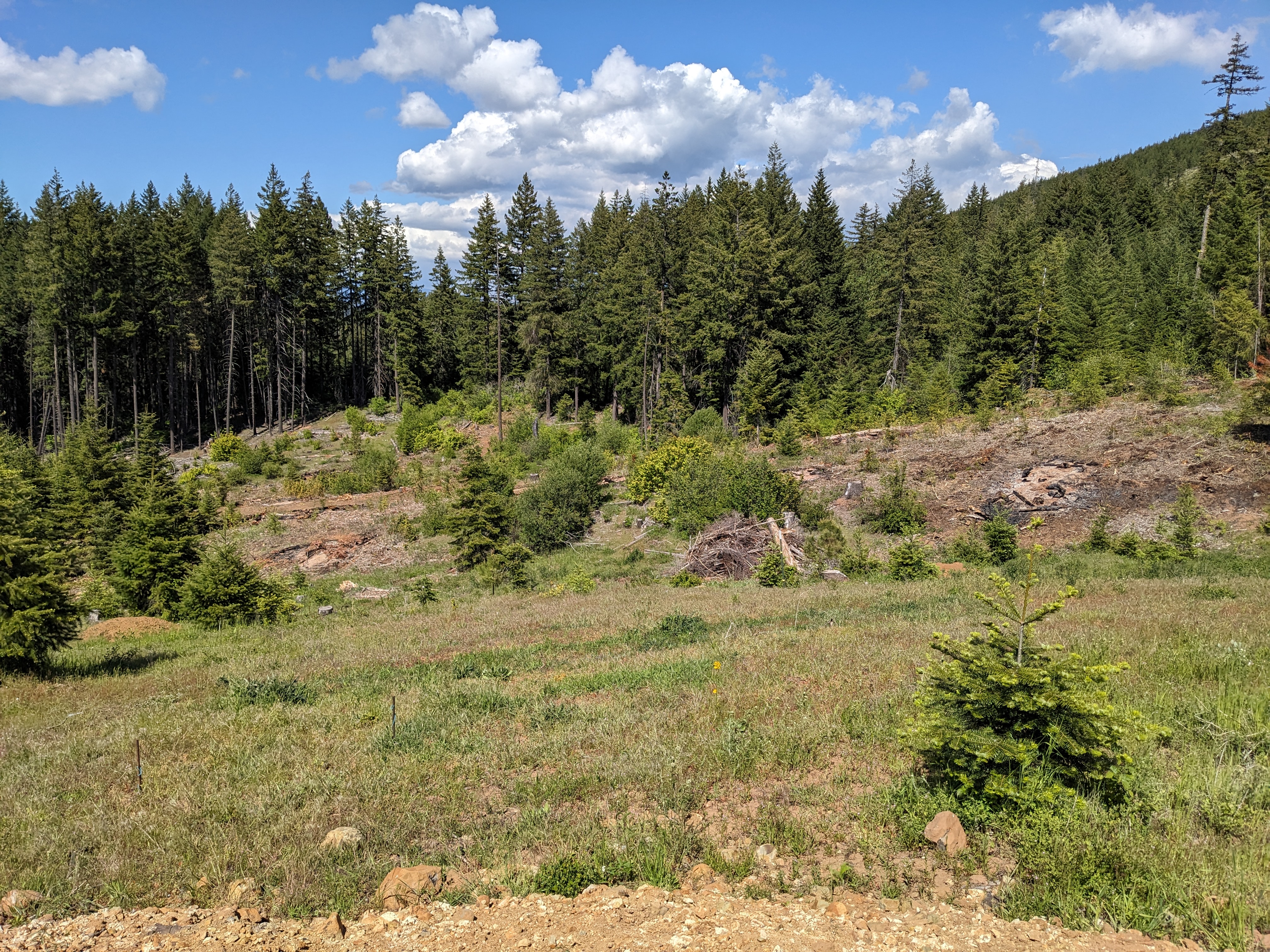 When we got the property, about 20 acres had been clear-cut and littered with knee-deep slash, aka fuel. We’ve been chipping away at this area for a few years and are almost done cleaning up the slash. We made hundreds of piles (by hand and machine) and burned most of them. Then we re-planted the areas. This spring, we planted about 150 pine tree seedlings and 50 larch, bringing our total to about 1700!