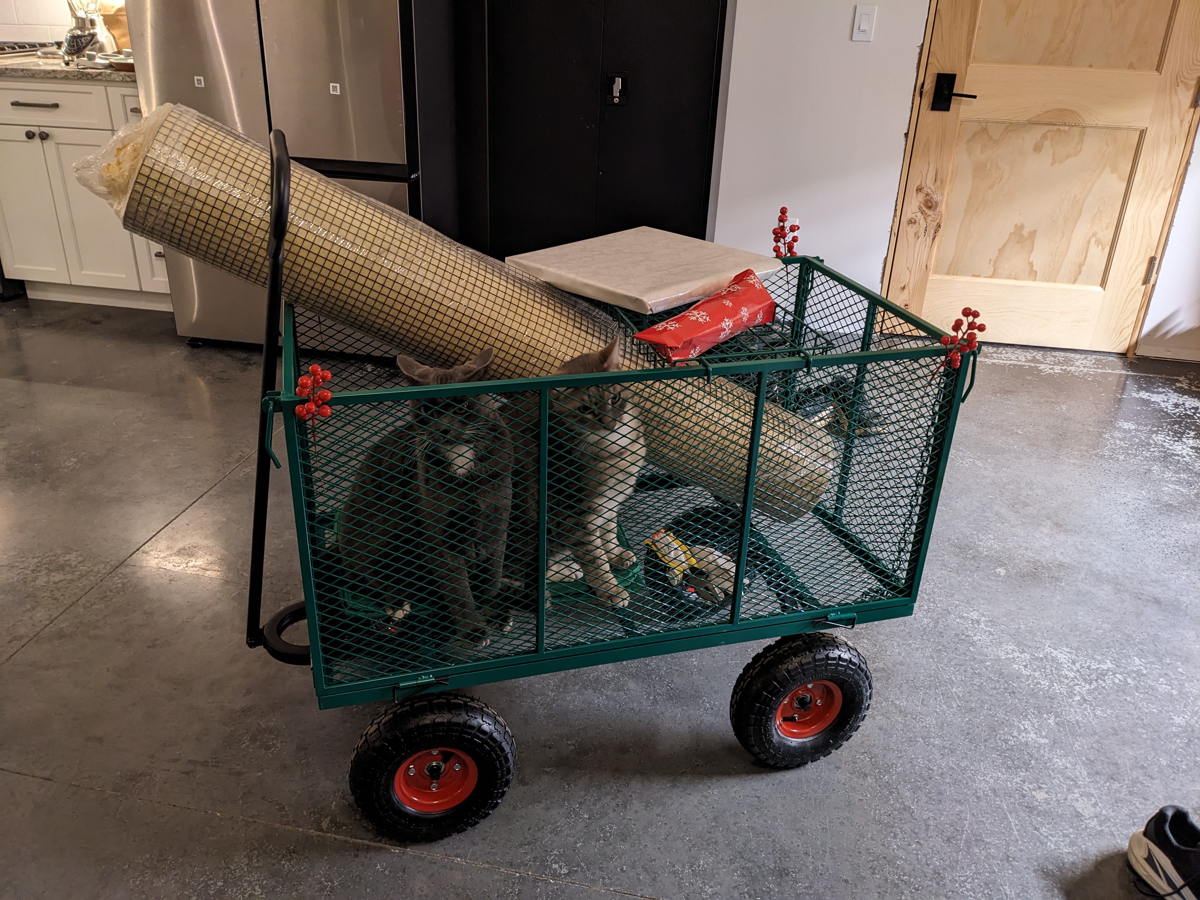 Far from complete, I was eager to get my plants outside. My seedlings were getting too big for their little pots inside. I already had to put the bush beans in 1 gallon pots and take them outside most days since they no longer fit under the grow lamps. I moved them around in this fun gardening cart that Sam got me for my birthday. It doubles as a cat wagon, though Smokey prefers to walk.