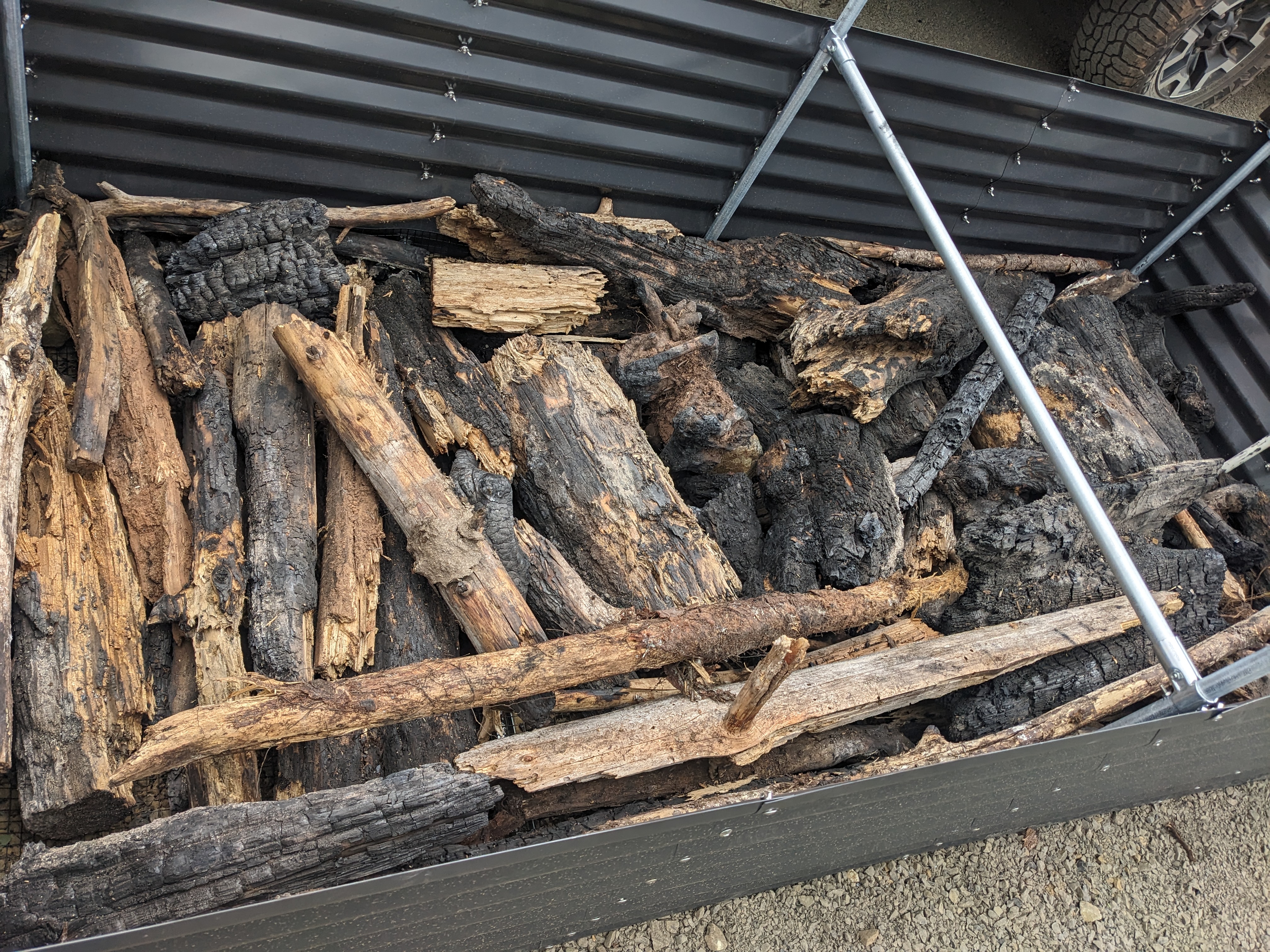 Next, we filled the planters. I had heard of Hügelkultur and was intrigued. It’s an old German technique of making beds from rotten logs and plant debris. The spongey matter helps the beds retain water, and as the logs decompose, they release nutrients back into the soil. True Hügelkultur seemed too difficult, so I decided to incorporate some of the techniques- mostly to save 50% of the soil cost. We collected a few truck loads of sticks and logs from old burn piles.