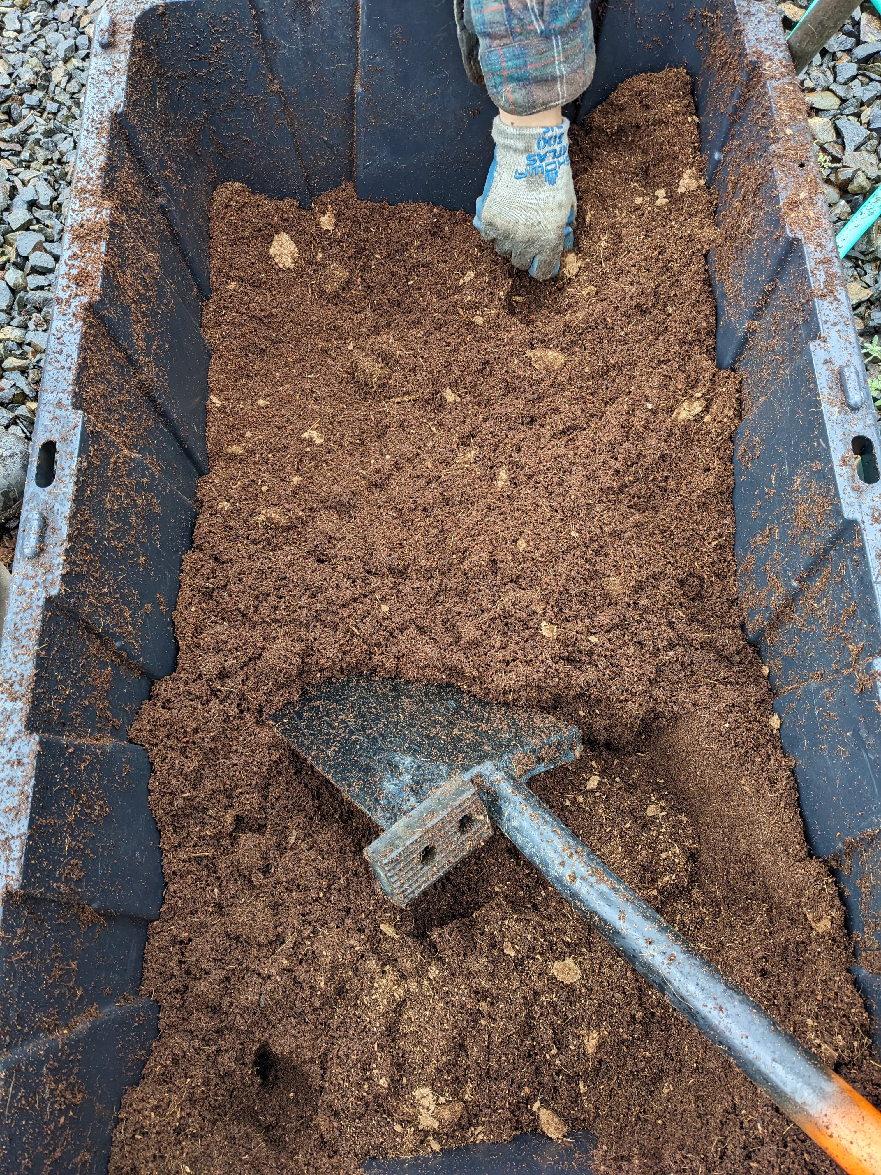 We added horse manure and top soil to the mix. Oh yeah, let’s not forget coconut coir, which we had to rehydrate first.