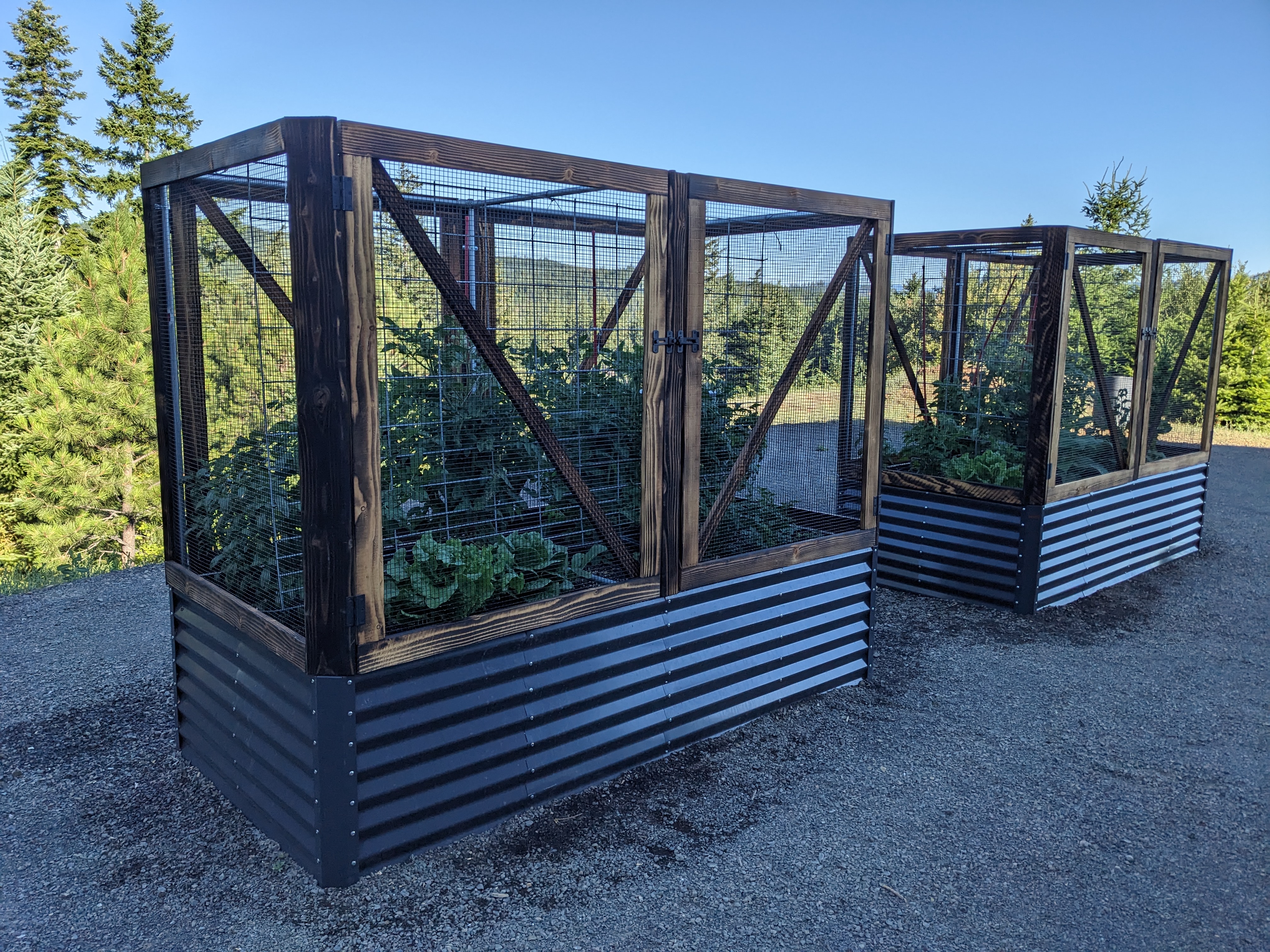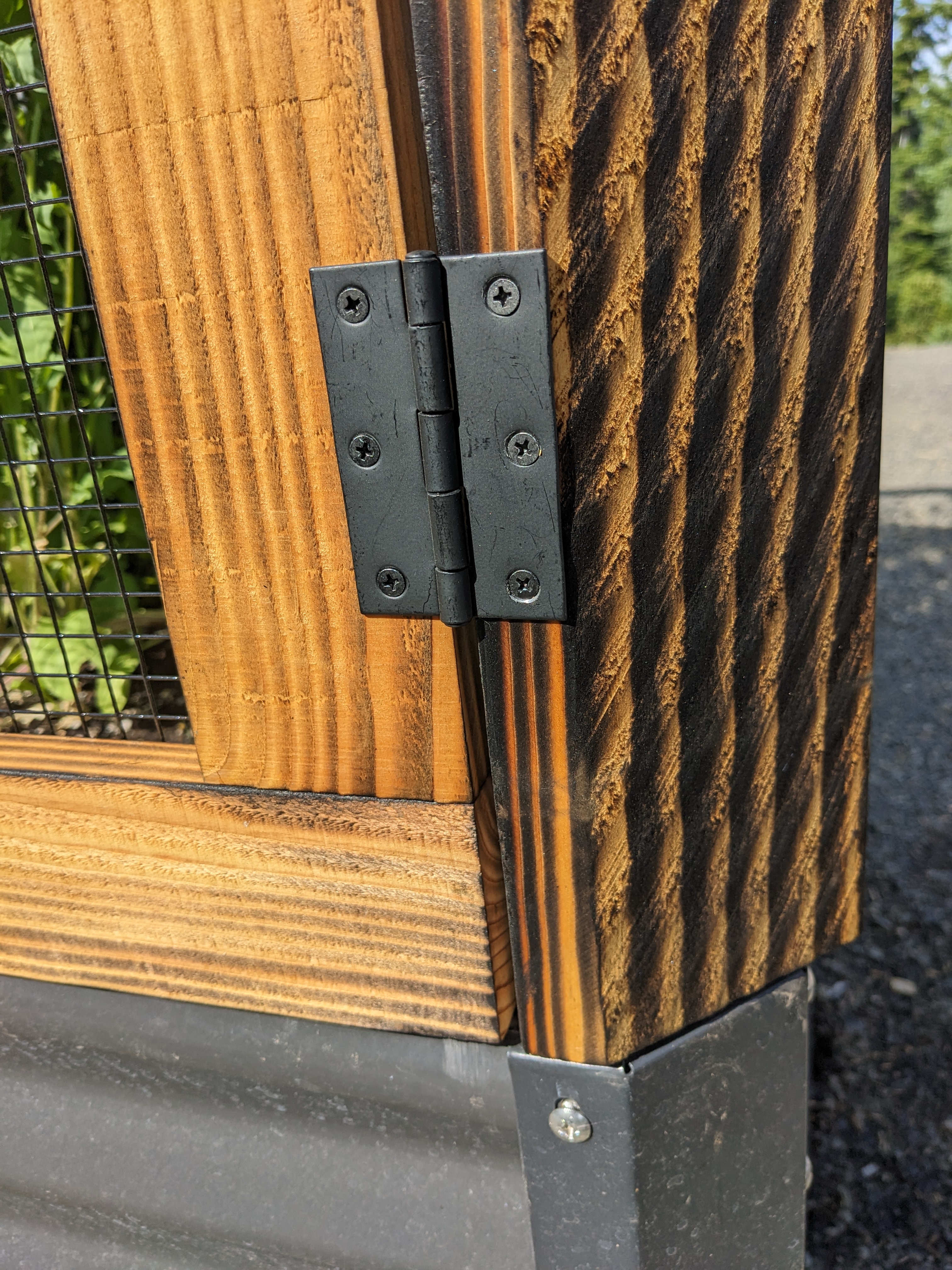 The cold weather passed, and no one was harmed. We moved on to the cages. Each planter has four doors for easy access. We made the frames with some fir we had. Sam treated them with su shugi ban- an old Japanese technique of charring wood to preserve it. The charring makes the wood more resistant to fire and water/rot. Plus it looks cool.