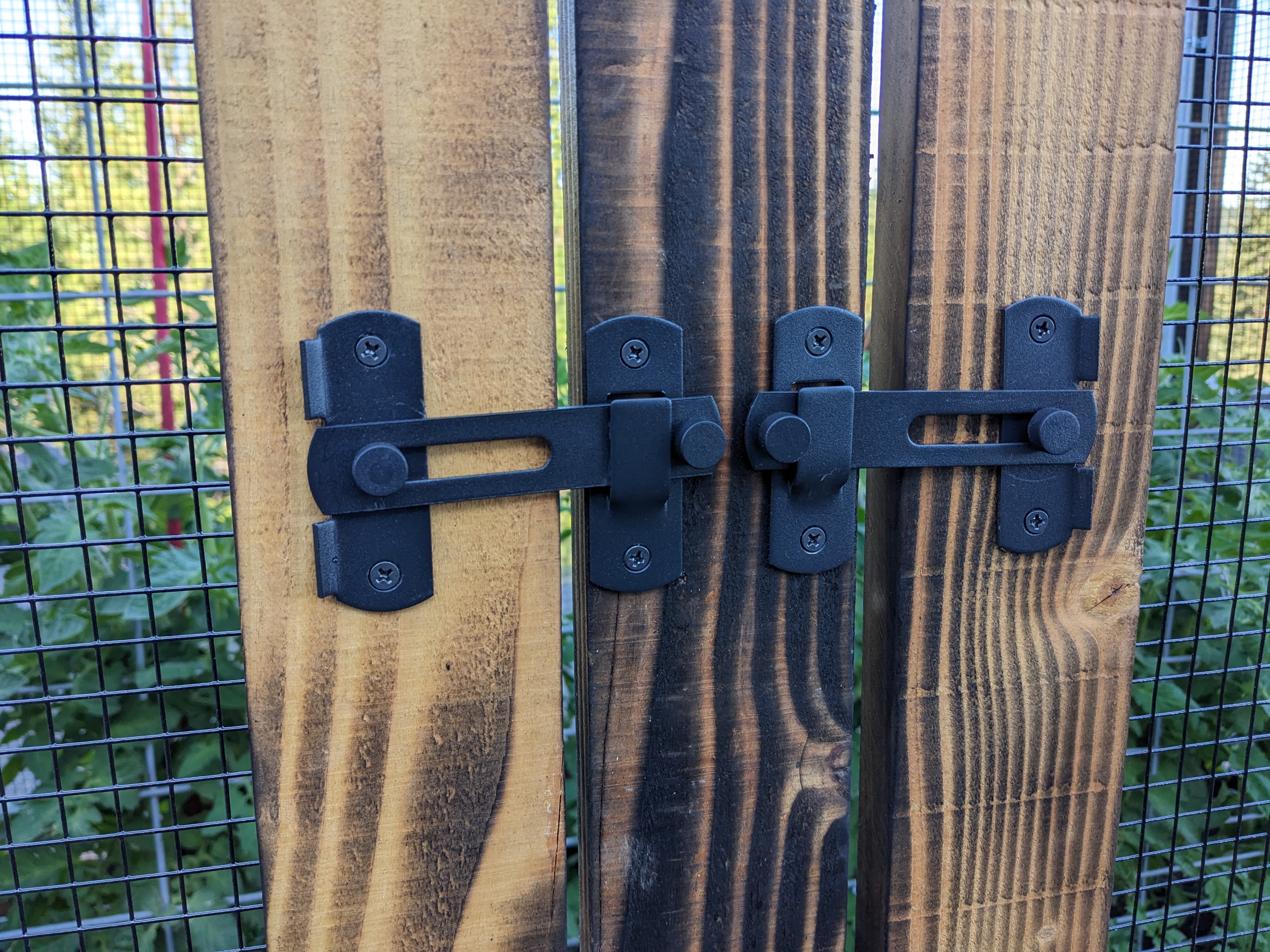 It wasn’t difficult, but it took awhile to make eight doors. They better last a long time. We hung the doors off the wood corner posts with some black hinges. For the finishing touch, we added matching latches.