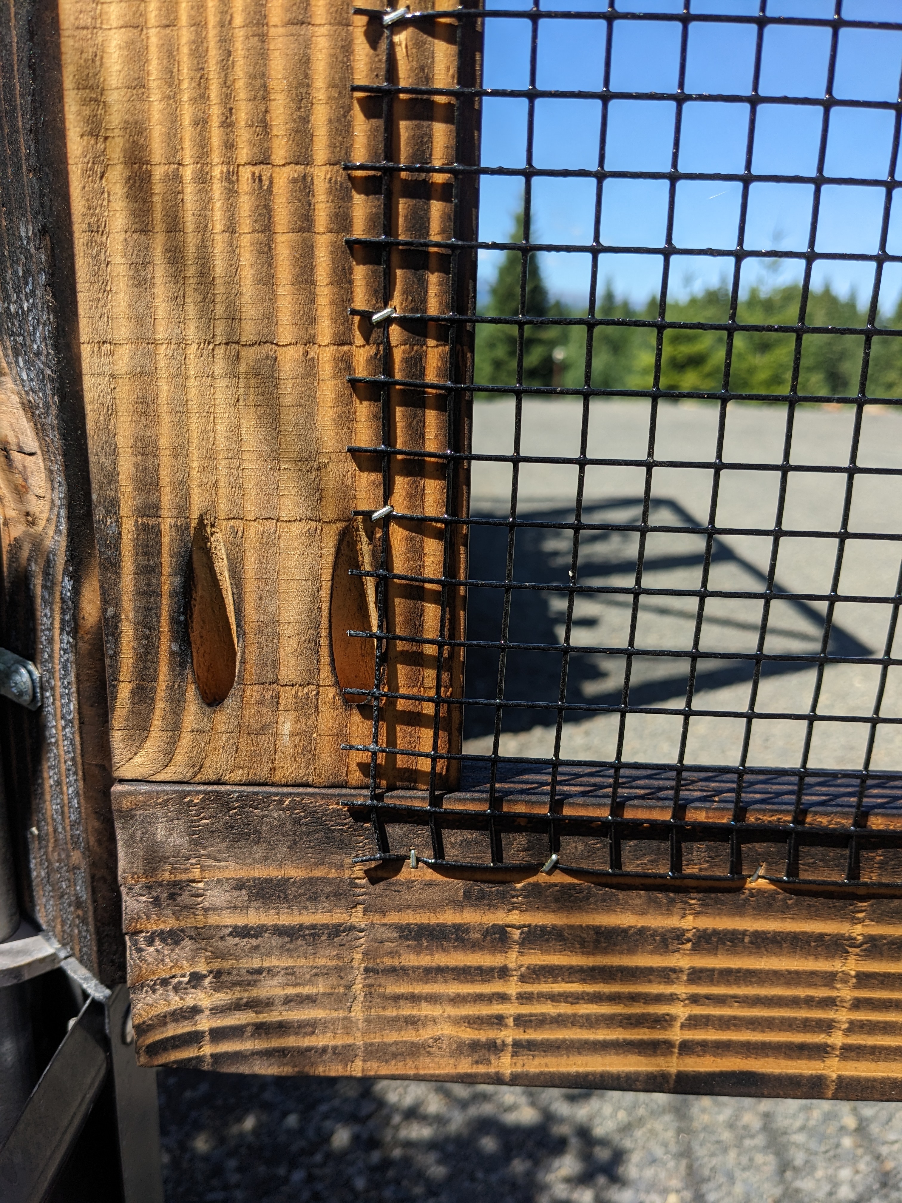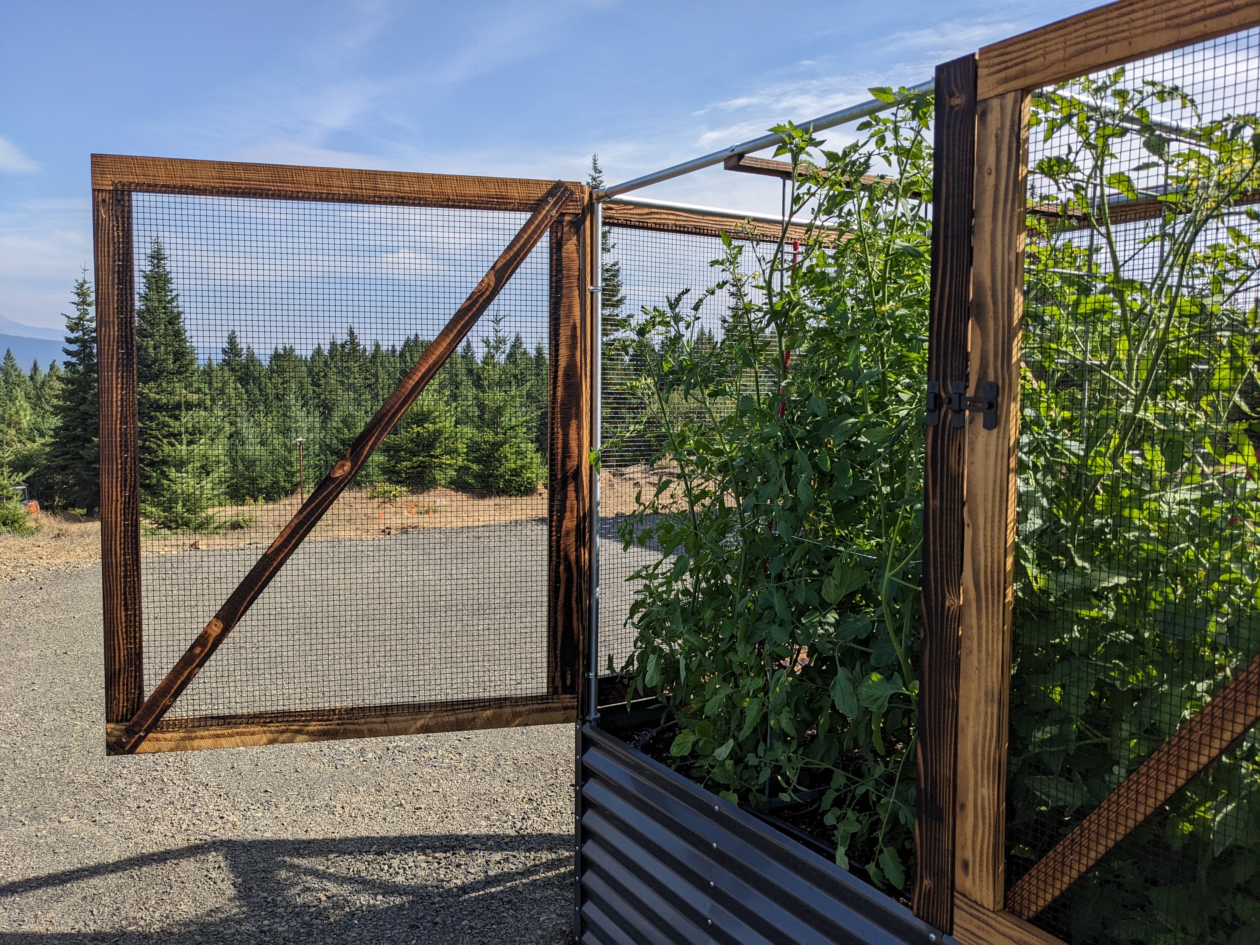 We secured the wood corner posts to the conduit with some clamps. Then we stapled wire mesh to the door frames and to the short sides of the planter boxes. The mesh is black PVC coated steel. It was challenging to stretch it tight enough to lay flat, but we overcame with minimal finger damage.