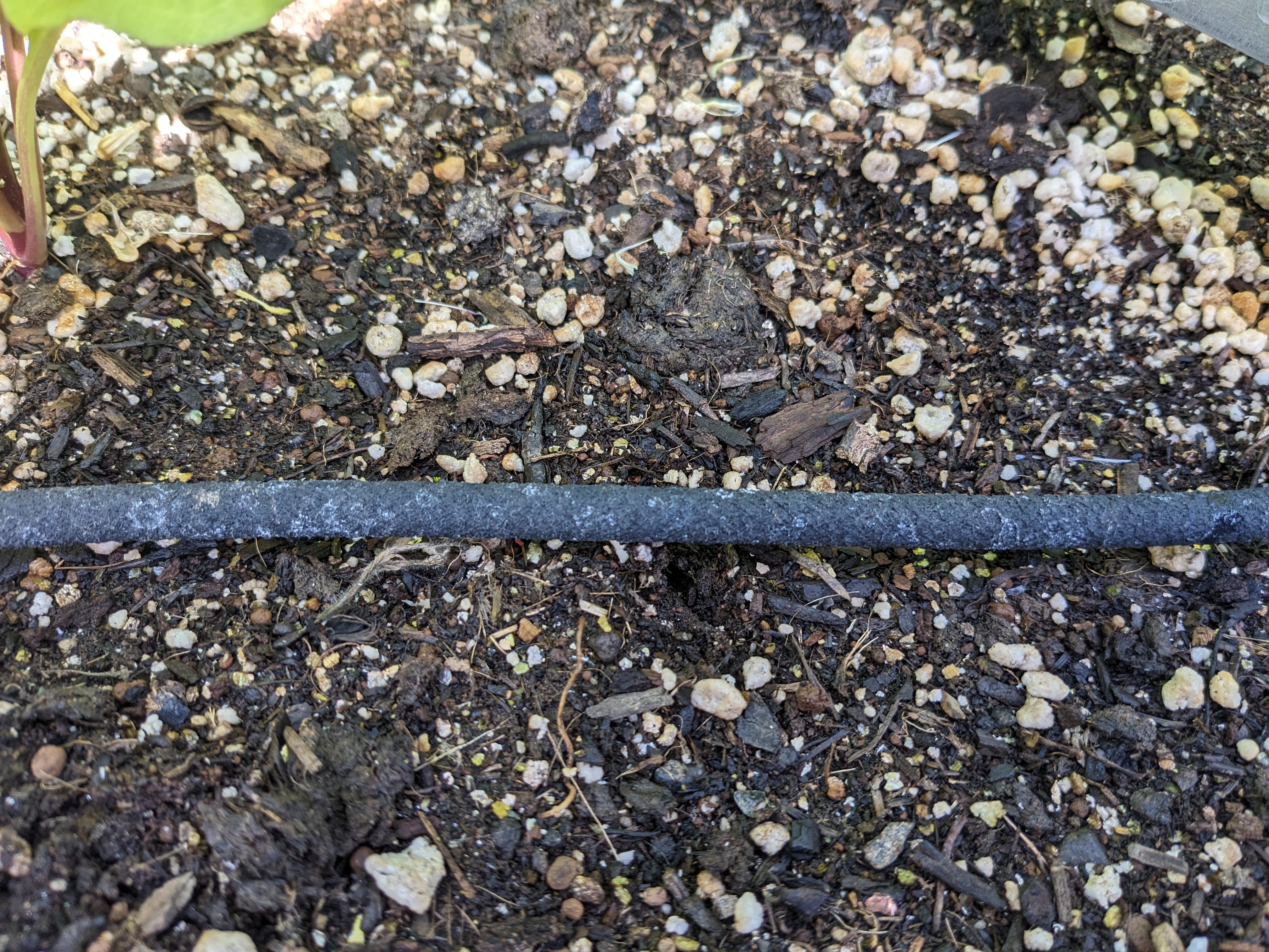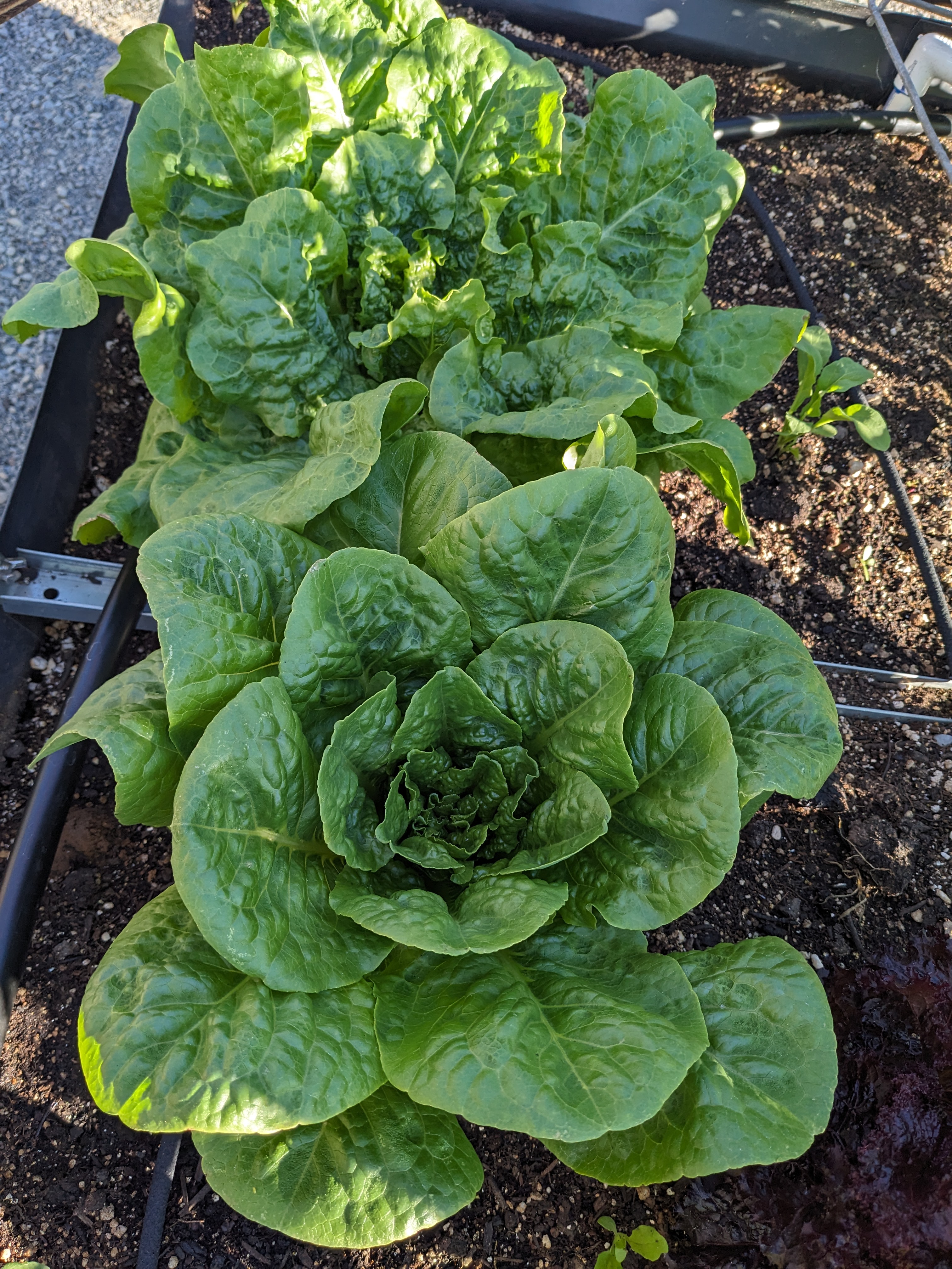 After hand-watering the beds for a few weeks, Sam convinced me it would be in my best interest to spend a few hours on the irrigation system. We had a stash of 1/4″ tubing and drippers, so we put that in one of the boxes. The water distribution didn’t seem great, so we got a “soaker hose” for the other box. It’s a perforated rubber material that water seeps out of. We set the timer and let everything be!