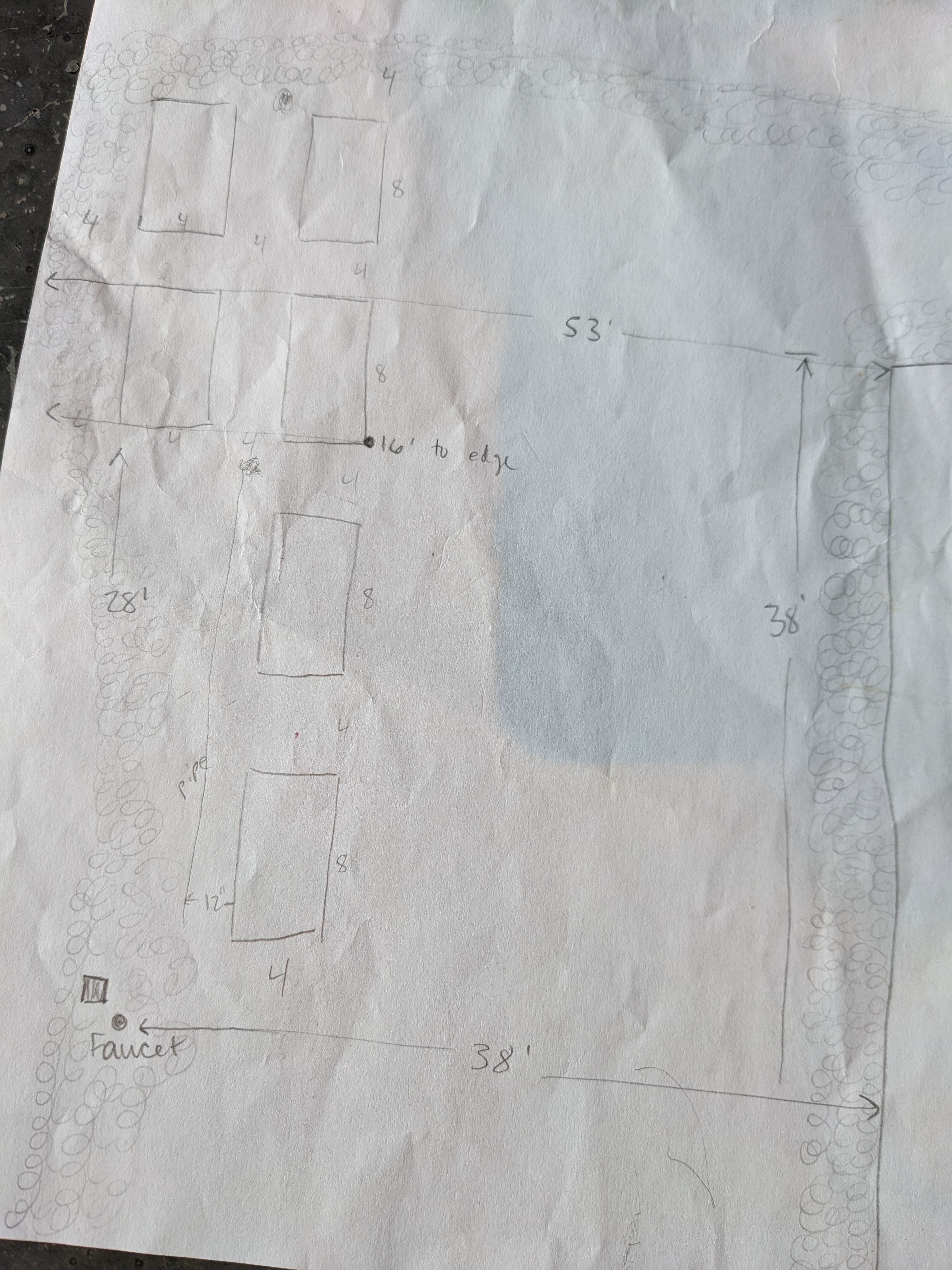 I had been dreaming of setting up a garden at our new residence, but we never had the thyme. Sam and I picked a sunny location for the garden a few years ago and installed power and water when we dug the utility trenches for the whole building. It wasn’t until this year that we sorted out the details for the garden. We came up with a layout that can accommodate six 4’x8′ planters.