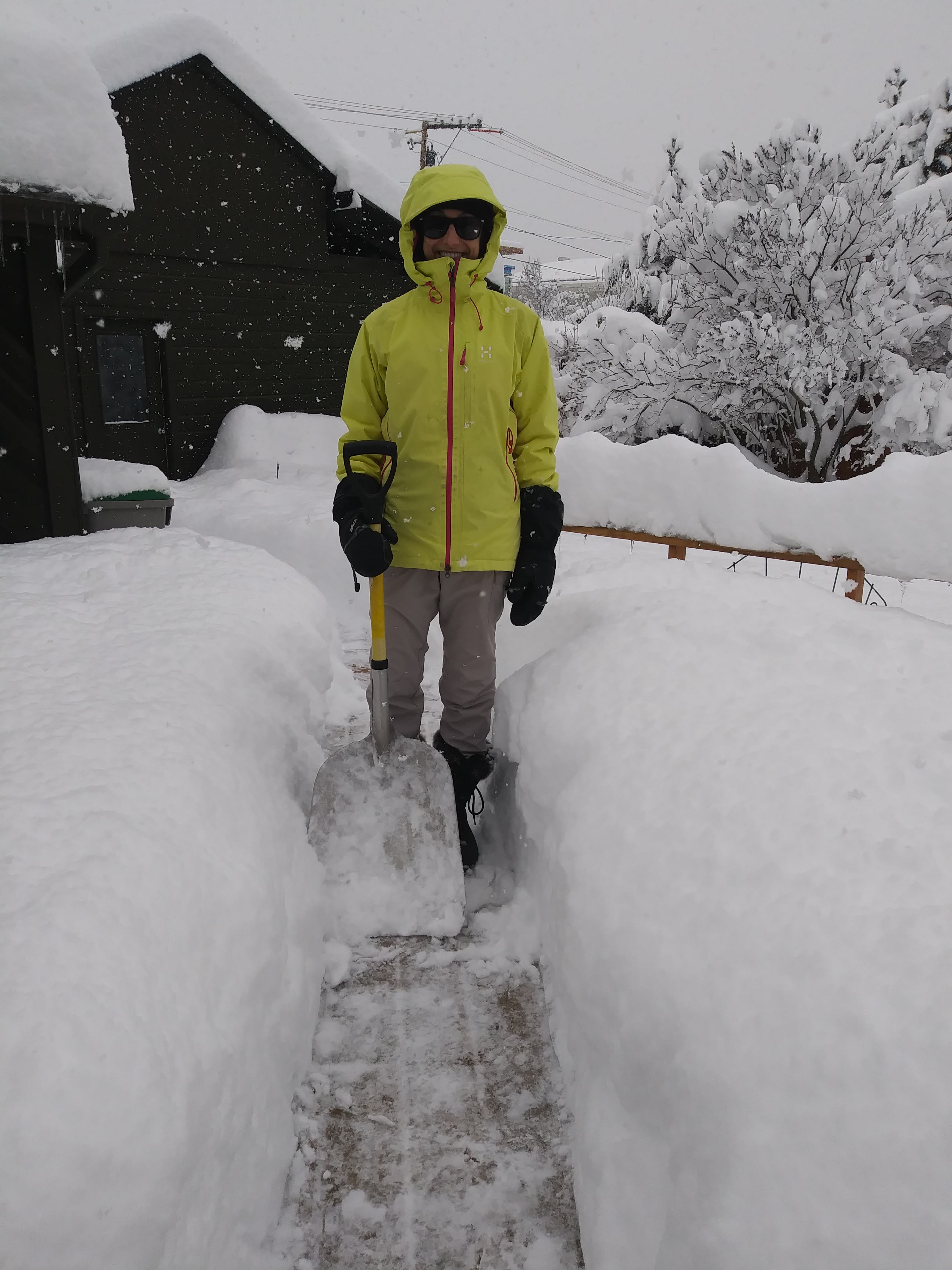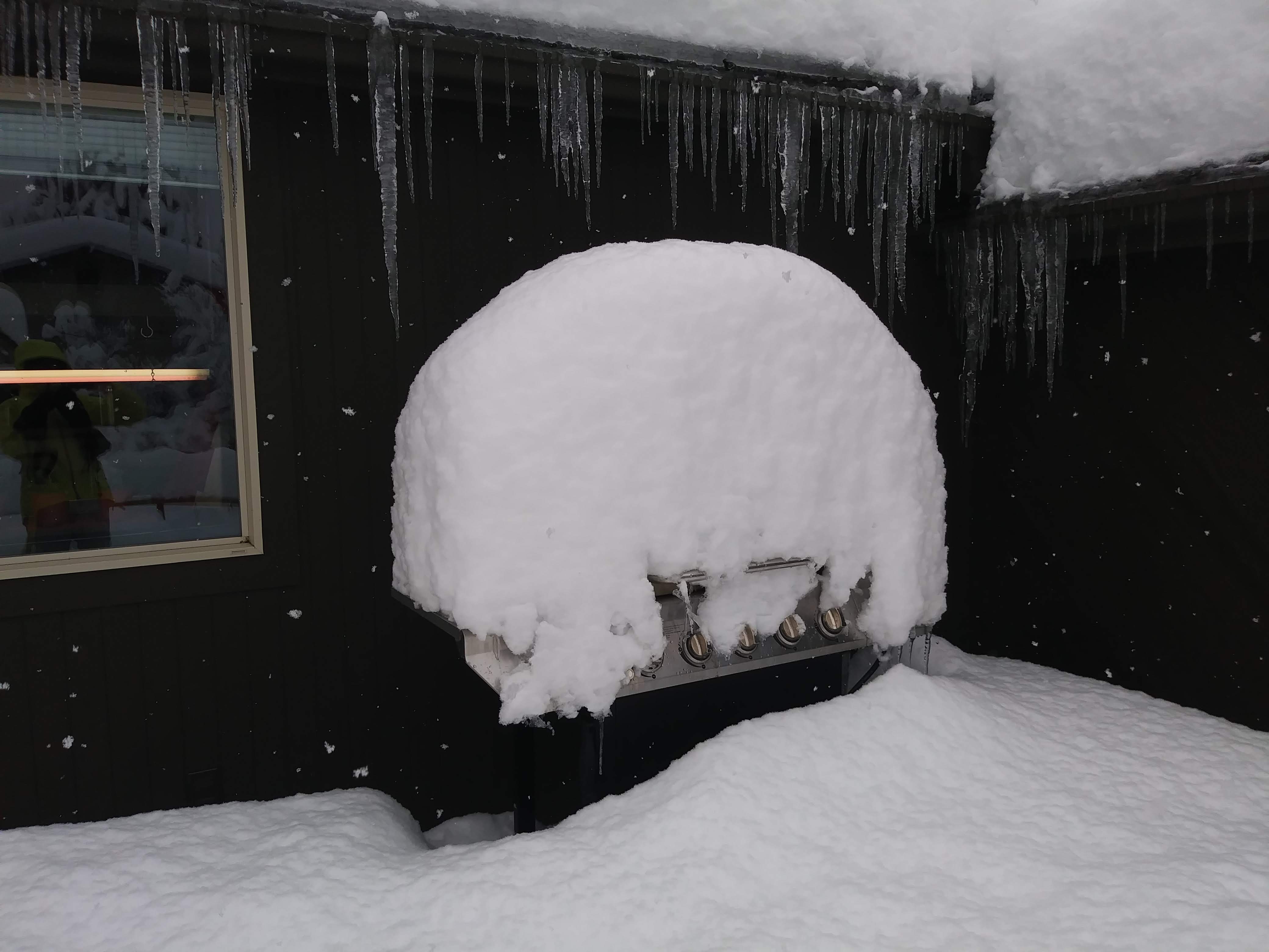 Sam and I live in a beautiful place, yet we never spend any time outdoors unless we’re working. We typically enjoy the view from the comfort of our couch or kitchen table. We’ve been dreaming of an outdoor space where we can relax and be sheltered from the elements. We also cook a lot outside. Even throughout the winter, we use the grill a few times a week. That usually involves donning snow boots and a headlamp. Shoveling a path to the grill is often a prerequisite, as well as digging out the valve to the propane tank. These photos were taken back in town, but they are a good representation of what can happen overnight.