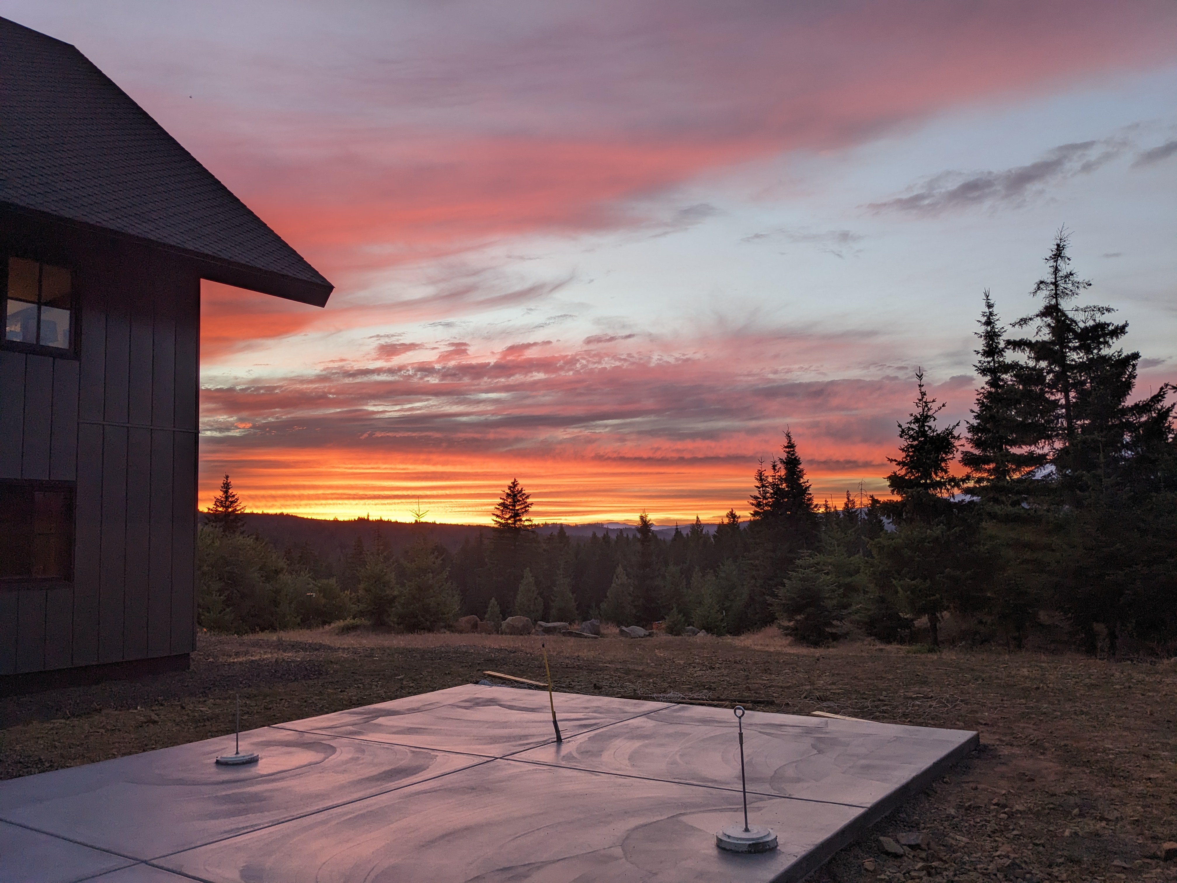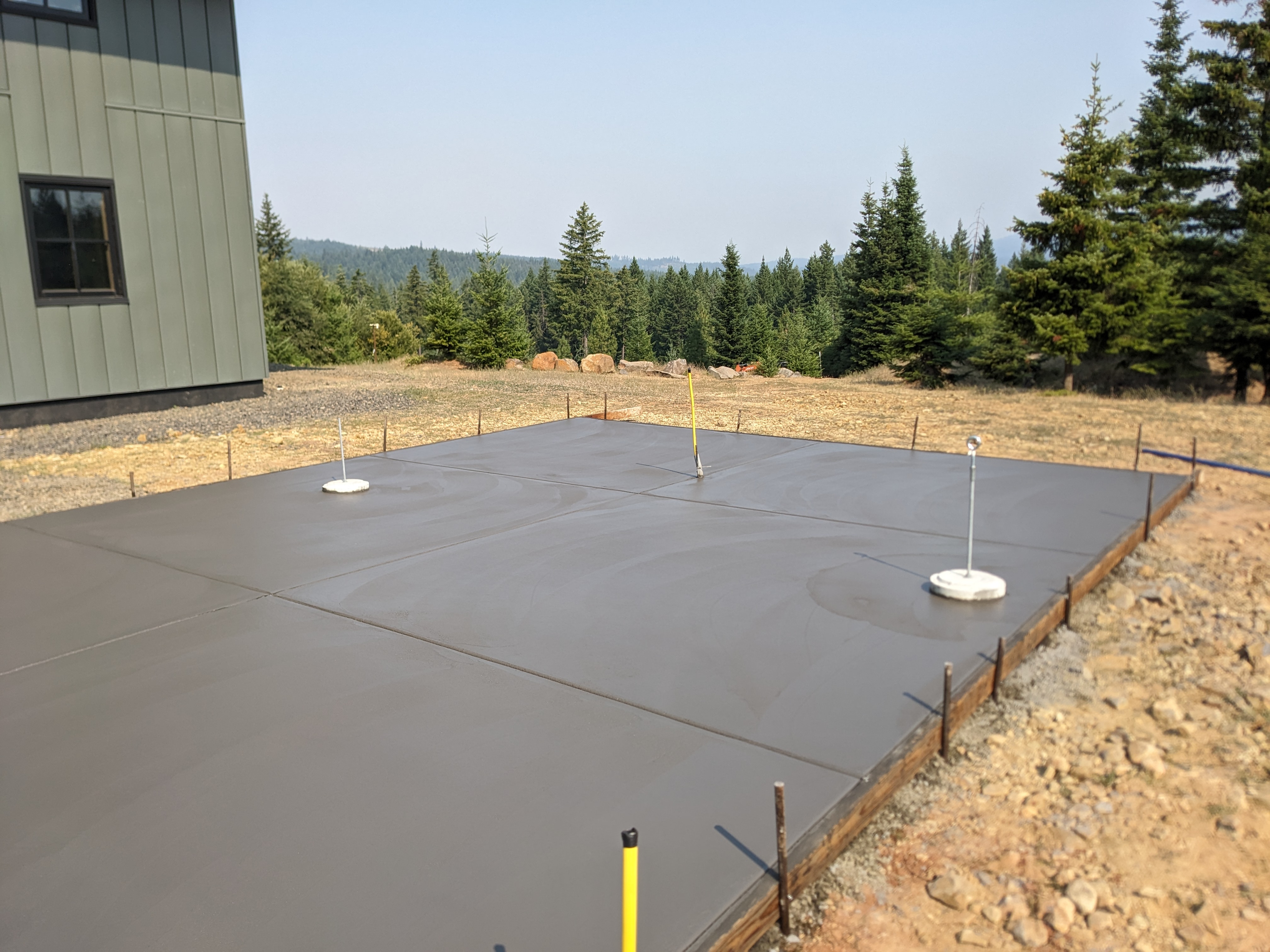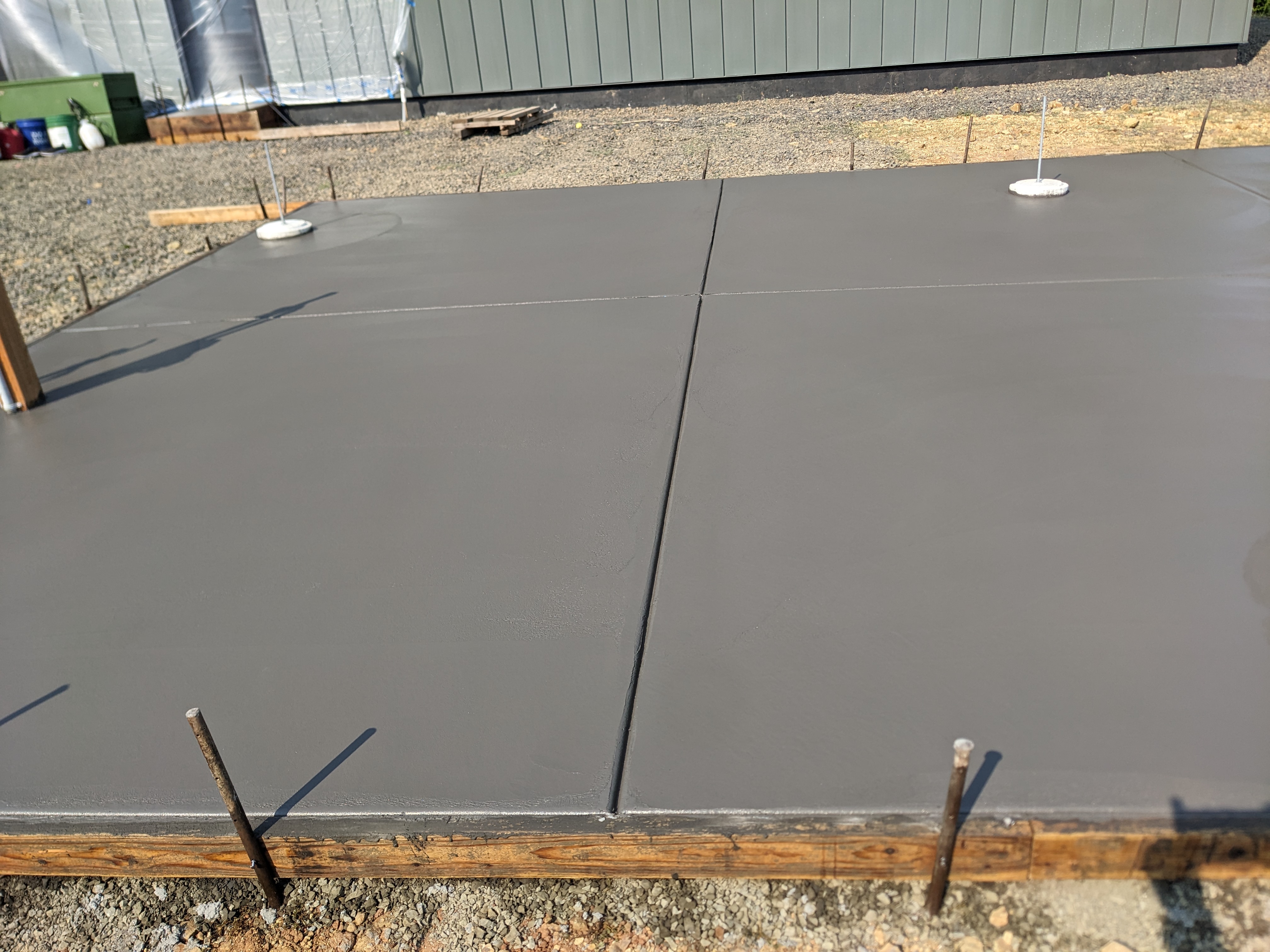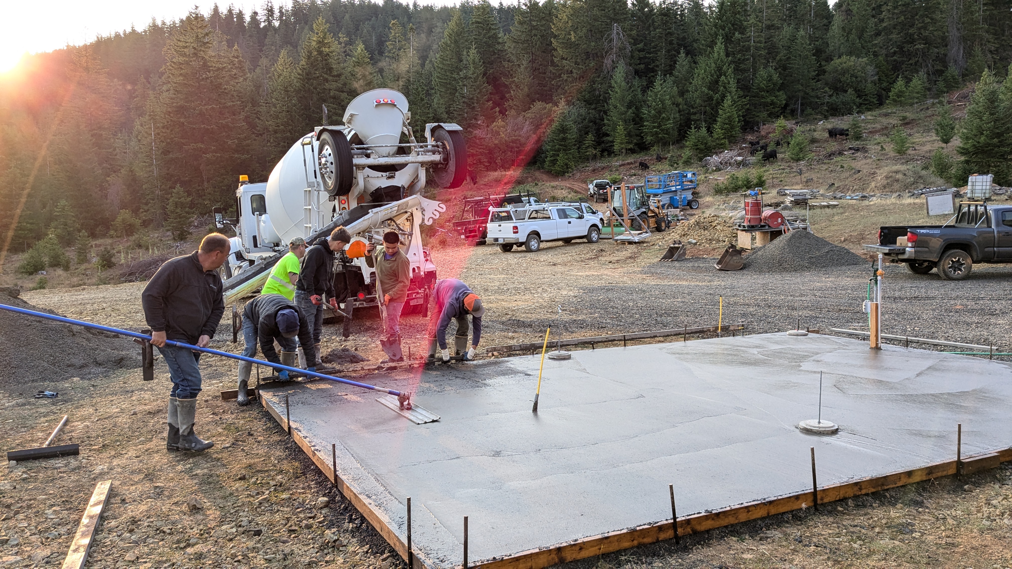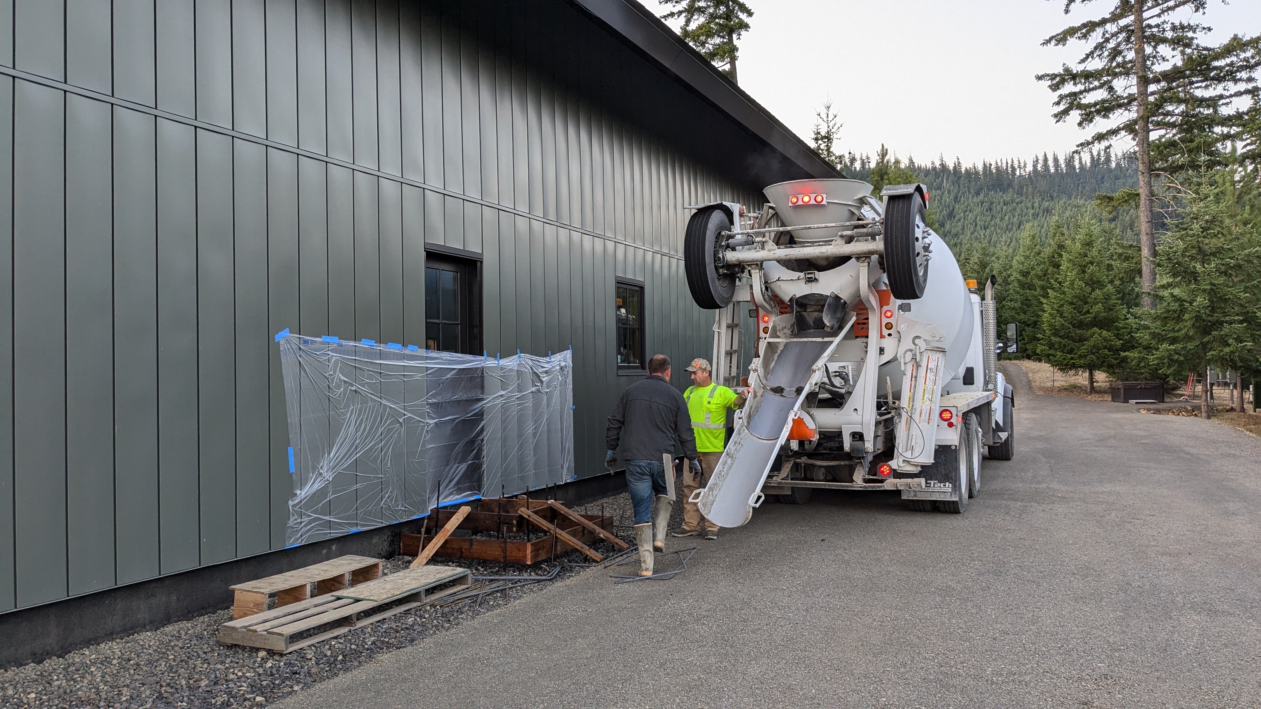 They arrived early the next morning before the sun came up. It felt like the middle of the night. Only a single concrete truck was needed this time. Since the amount of concrete was minimal, we had a dark grey dye mixed into mud. This eliminated the color/sealant step that we did for the shop.