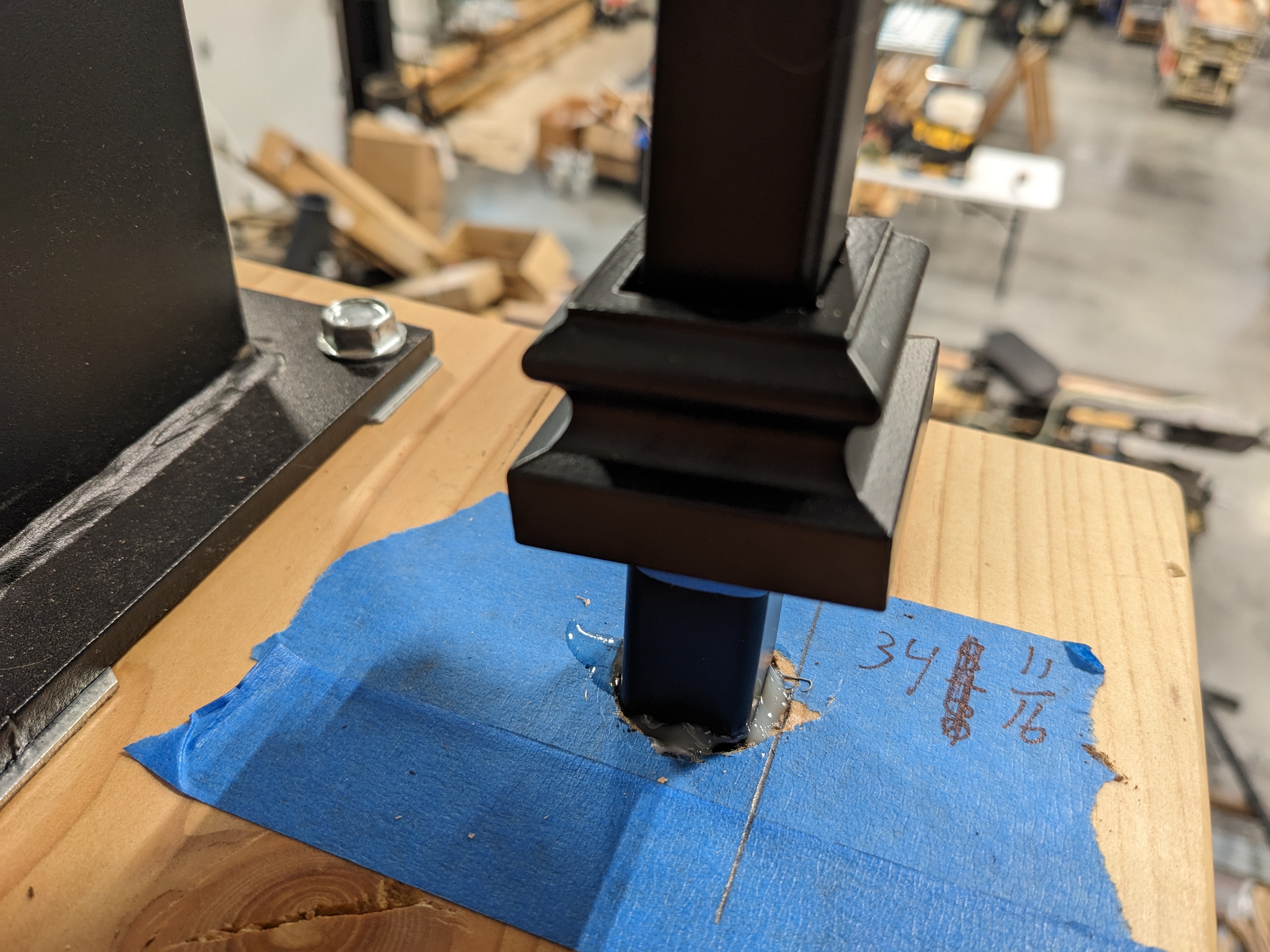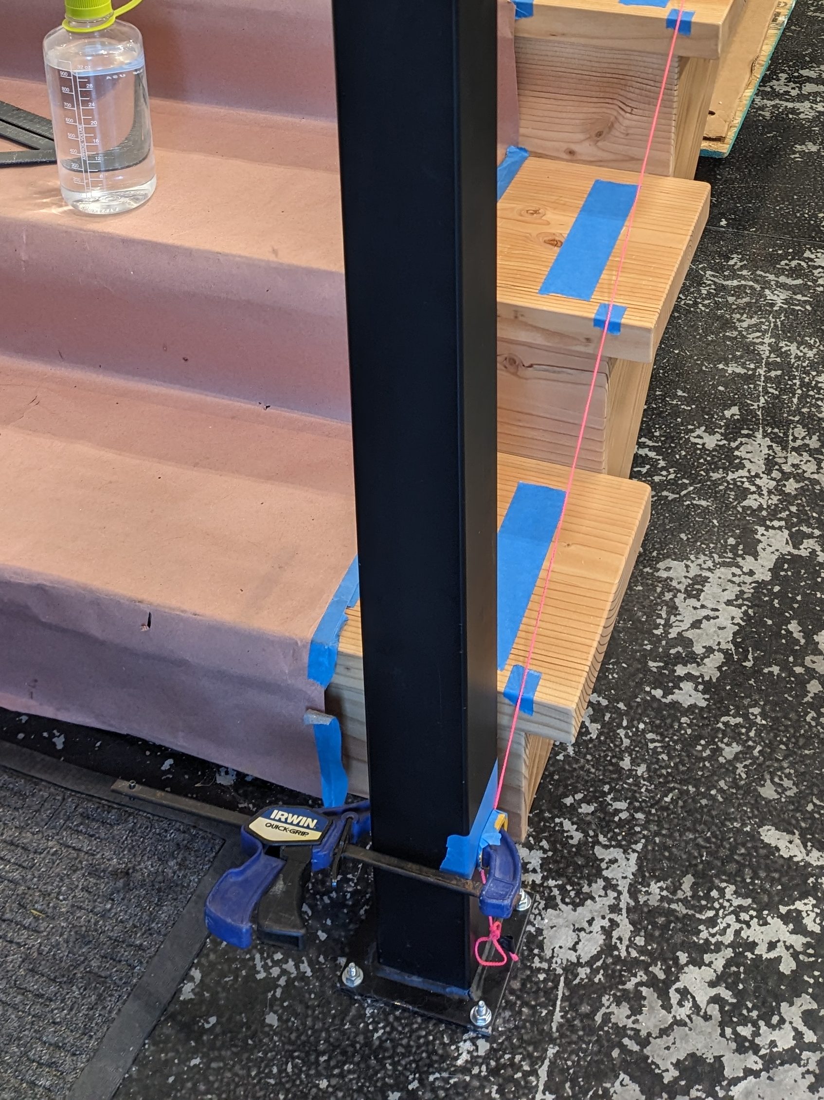Once all the components were ready, we began the assembly. The first step was installing the two newel posts. The base post required drilling into the concrete.